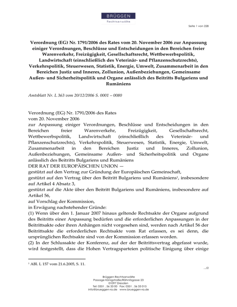 Seite 1 von 228 Verordnung (EG) Nr. 1791/2006 des Rates vom 20. November 2006 zur Anpassung einiger Verordnungen, Beschlüsse und Entscheidungen in den Bereichen freier Warenverkehr, Freizügigkeit, Gesellschaftsrecht, Wettbewerbspolitik, Landwirtschaft (einschließlich des Veterinär- und Pflanzenschutzrechts), Verkehrspolitik, Steuerwesen, Statistik, Energie, Umwelt, Zusammenarbeit in den Bereichen Justiz und Inneres, Zollunion, Außenbeziehungen, Gemeinsame Außen- und Sicherheitspolitik und Organe anlässlich des Beitritts Bulgariens und Rumäniens Amtsblatt Nr. L 363 vom 20/12/2006 S. 0001 – 0080 Verordnung (EG) Nr. 1791/2006 des Rates vom 20. November 2006 zur Anpassung einiger Verordnungen, Beschlüsse und Entscheidungen in den Bereichen freier Warenverkehr, Freizügigkeit, Gesellschaftsrecht, Wettbewerbspolitik, Landwirtschaft (einschließlich des Veterinärund Pflanzenschutzrechts), Verkehrspolitik, Steuerwesen, Statistik, Energie, Umwelt, Zusammenarbeit in den Bereichen Justiz und Inneres, Zollunion, Außenbeziehungen, Gemeinsame Außen- und Sicherheitspolitik und Organe anlässlich des Beitritts Bulgariens und Rumäniens DER RAT DER EUROPÄISCHEN UNION — gestützt auf den Vertrag zur Gründung der Europäischen Gemeinschaft, gestützt auf den Vertrag über den Beitritt Bulgariens und Rumäniens1, insbesondere auf Artikel 4 Absatz 3, gestützt auf die Akte über den Beitritt Bulgariens und Rumäniens, insbesondere auf Artikel 56, auf Vorschlag der Kommission, in Erwägung nachstehender Gründe: (1) Wenn über den 1. Januar 2007 hinaus geltende Rechtsakte der Organe aufgrund des Beitritts einer Anpassung bedürfen und die erforderlichen Anpassungen in der Beitrittsakte oder ihren Anhängen nicht vorgesehen sind, werden nach Artikel 56 der Beitrittsakte die erforderlichen Rechtsakte vom Rat erlassen, es sei denn, die ursprünglichen Rechtsakte sind von der Kommission erlassen worden. (2) In der Schlussakte der Konferenz, auf der der Beitrittsvertrag abgefasst wurde, wird festgestellt, dass die Hohen Vertragsparteien politische Einigung über einige 1 ABl. L 157 vom 21.6.2005, S. 11. .../2 Brüggen Rechtsanwälte Passage Königstraße/Rähnitzgasse 23 01097 Dresden Tel: 0351 . 56 33 00 Fax: 0351 . 56 33 015 [email protected] www.brueggen-ra.de Seite 2 von 228 Anpassungen der Rechtsakte der Organe erzielt haben, die aufgrund des Beitritts erforderlich geworden sind, und den Rat und die Kommission ersuchen, diese Anpassungen vor dem Beitritt anzunehmen, wobei erforderlichenfalls eine Ergänzung und Aktualisierung erfolgt, um der Weiterentwicklung des Unionsrechts Rechnung zu tragen. (3) Die folgenden Verordnungen sind daher entsprechend zu ändern: - im Bereich freier Warenverkehr: die Verordnungen (EG) Nr. 2003/20032 und (EG) Nr. 339/933, - im Bereich Freizügigkeit: die Verordnungen (EWG) Nr. 1408/714 und (EWG) Nr. 574/725, - im Bereich Gesellschaftsrecht: die Verordnung (EG) Nr. 2157/20016, - im Bereich Wettbewerbspolitik: die Verordnung (EG) Nr. 659/19997, - im Bereich Landwirtschaft (einschließlich des Veterinärrechts): die Verordnungen Nr. 79/658, (EWG) Nr. 1784/779, (EWG) Nr. 2092/9110, (EWG) Nr. 2137/9211, (EG) Nr. 1493/199912, (EG) Nr. 1760/200013, (EG) Nr. 999/200114, (EG) Nr. 2160/200315, (EG) Nr. 21/200416, (EG) Nr. 853/200417, (EG) Nr. 854/200418, (EG) Nr. 882/200419 und (EG) Nr. 510/200620, - im Bereich Verkehrspolitik: die Verordnungen (EWG) Nr. 1108/7021, (EWG) Nr. 3821/8522, (EWG) Nr. 881/9223, (EWG) Nr. 684/9224, (EWG) Nr. 1192/6925 und (EWG) Nr. 2408/9226, ABl. L 304 vom 21.11.2003, S. 1. ABl. L 40 vom 17.2.1993, S. 1. 4 ABl. L 149 vom 5.7.1971, S. 2. 5 ABl. L 74 vom 27.3.1972, S. 1. 6 ABl. L 294 vom 10.11.2001, S. 1. 7 ABl. L 83 vom 27.3.1999, S. 1. 8 ABl. 109 vom 23.6.1965, S. 1859. 9 ABl. L 200 vom 8.8.1977, S. 1. 10 ABl. L 198 vom 22.7.1991, S. 1. 11 ABl. L 214 vom 30.7.1992, S. 1. 12 ABl. L 179 vom 14.7.1999, S. 1. 13 ABl. L 204 vom 11.8.2000, S. 1. 14 ABl. L 147 vom 31.5.2001, S. 1. 15 ABl. L 325 vom 12.12.2003, S. 1. 16 ABl. L 5 vom 9.1.2004, S. 8. 17 ABl. L 139 vom 30.4.2004, S. 55. 18 ABl. L 139 vom 30.4.2004, S. 206. 19 ABl. L 165 vom 30.4.2004, S. 1. 20 ABl. L 93 vom 31.3.2006, S. 12. 21 ABl. L 130 vom 15.6.1970, S. 4. 22 ABl. L 370 vom 31.12.1985, S. 8. 23 ABl. L 95 vom 9.4.1992, S. 1. 2 3 .../3 Brüggen Rechtsanwälte Passage Königstraße/Rähnitzgasse 23 01097 Dresden Tel: 0351 . 56 33 00 Fax: 0351 . 56 33 015 [email protected] www.brueggen-ra.de Seite 3 von 228 - im Bereich Steuerwesen: die Verordnung (EG) Nr. 1798/200327, - im Bereich Statistik: die Verordnungen (EWG) Nr. 2782/7528, (EWG) Nr. 357/7929, (EWG) Nr. 837/9030, (EWG) Nr. 959/9331, (EG) Nr. 1172/9832, (EG) Nr. 437/200333 und (EG) Nr. 1177/200334, - im Bereich Energie: die Verordnung (EG) Nr. 1407/200235, - im Bereich Umwelt: die Verordnungen (EG) Nr. 761/200136 und (EG) Nr. 2037/200037, - im Bereich Zusammenarbeit in den Bereichen Justiz und Inneres: die Verordnungen (EG) Nr. 1346/200038, (EG) Nr. 44/200139, (EG) Nr. 1683/9540 und (EG) Nr. 539/200141, - im Bereich Zollunion: die Verordnung (EWG) Nr. 2913/9242, - im Bereich Außenbeziehungen: die Verordnungen (EWG) Nr. 3030/9343, (EG) Nr. 517/94 44, (EG) Nr. 152/200245, (EG) Nr. 2368/200246 und (EG) Nr. 1236/200547, - im Bereich Gemeinsame Außen- und Sicherheitspolitik: die Verordnungen (EG) Nr. 2488/200048, (EG) Nr. 2580/200149 (EG) Nr. 881/200250, (EG) Nr. 1210/200351, (EG) Nr. ABl. L 74 vom 20.3.1992, S. 1. ABl. L 156 vom 28.6.1969, S. 8. 26 ABl. L 240 vom 24.8.1992, S. 8. 27 ABl. L 264 vom 15.10.2003, S. 1. 28 ABl. L 282 vom 1.11.1975, S. 100. 29 ABl. L 54 vom 5.3.1979, S. 124. 30 ABl. L 88 vom 3.4.1990, S. 1. 31 ABl. L 98 vom 24.4.1993, S. 1. 32 ABl. L 163 vom 6.6.1998, S. 1. 33 ABl. L 66 vom 11.3.2003, S. 1. 34 ABl. L 165 vom 3.7.2003, S. 1. 35 ABl. L 205 vom 2.8.2002, S. 1. 36 ABl. L 114 vom 24.4.2001, S. 1. 37 ABl. L 244 vom 29.9.2000, S. 1. 38 ABl. L 160 vom 30.6.2000, S. 1. 39 ABl. L 12 vom 16.1.2001, S. 1. 40 ABl. L 164 