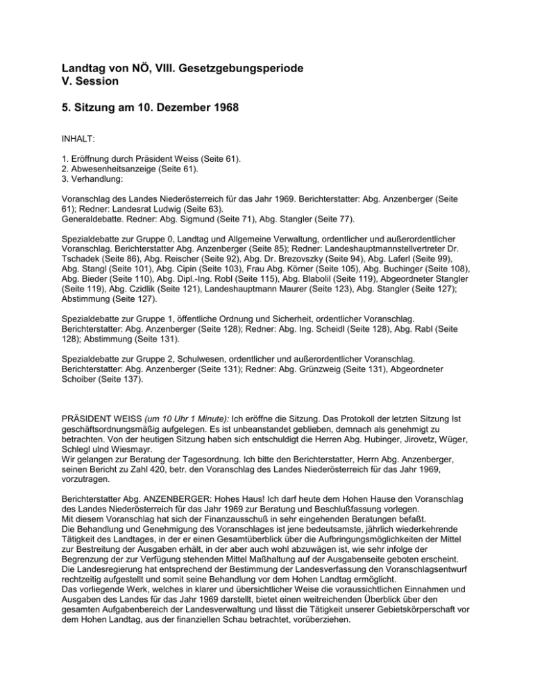 Landtag von NÖ, VIII. Gesetzgebungsperiode V. Session 5. Sitzung am 10. Dezember 1968 INHALT: 1. Eröffnung durch Präsident Weiss (Seite 61). 2. Abwesenheitsanzeige (Seite 61). 3. Verhandlung: Voranschlag des Landes Niederösterreich für das Jahr 1969. Berichterstatter: Abg. Anzenberger (Seite 61); Redner: Landesrat Ludwig (Seite 63). Generaldebatte. Redner: Abg. Sigmund (Seite 71), Abg. Stangler (Seite 77). Spezialdebatte zur Gruppe 0, Landtag und Allgemeine Verwaltung, ordentlicher und außerordentlicher Voranschlag. Berichterstatter Abg. Anzenberger (Seite 85); Redner: Landeshauptmannstellvertreter Dr. Tschadek (Seite 86), Abg. Reischer (Seite 92), Abg. Dr. Brezovszky (Seite 94), Abg. Laferl (Seite 99), Abg. Stangl (Seite 101), Abg. Cipin (Seite 103), Frau Abg. Körner (Seite 105), Abg. Buchinger (Seite 108), Abg. Bieder (Seite 110), Abg. Dipl.-Ing. Robl (Seite 115), Abg. Blabolil (Seite 119), Abgeordneter Stangler (Seite 119), Abg. Czidlik (Seite 121), Landeshauptmann Maurer (Seite 123), Abg. Stangler (Seite 127); Abstimmung (Seite 127). Spezialdebatte zur Gruppe 1, öffentliche Ordnung und Sicherheit, ordentlicher Voranschlag. Berichterstatter: Abg. Anzenberger (Seite 128); Redner: Abg. Ing. Scheidl (Seite 128), Abg. Rabl (Seite 128); Abstimmung (Seite 131). Spezialdebatte zur Gruppe 2, Schulwesen, ordentlicher und außerordentlicher Voranschlag. Berichterstatter: Abg. Anzenberger (Seite 131); Redner: Abg. Grünzweig (Seite 131), Abgeordneter Schoiber (Seite 137). PRÄSIDENT WEISS (um 10 Uhr 1 Minute): Ich eröffne die Sitzung. Das Protokoll der letzten Sitzung Ist geschäftsordnungsmäßig aufgelegen. Es ist unbeanstandet geblieben, demnach als genehmigt zu betrachten. Von der heutigen Sitzung haben sich entschuldigt die Herren Abg. Hubinger, Jirovetz, Wüger, Schlegl ulnd Wiesmayr. Wir gelangen zur Beratung der Tagesordnung. Ich bitte den Berichterstatter, Herrn Abg. Anzenberger, seinen Bericht zu Zahl 420, betr. den Voranschlag des Landes Niederösterreich für das Jahr 1969, vorzutragen. Berichterstatter Abg. ANZENBERGER: Hohes Haus! Ich darf heute dem Hohen Hause den Voranschlag des Landes Niederösterreich für das Jahr 1969 zur Beratung und Beschlußfassung vorlegen. Mit diesem Voranschlag hat sich der Finanzausschuß in sehr eingehenden Beratungen befaßt. Die Behandlung und Genehmigung des Voranschlages ist jene bedeutsamste, jährlich wiederkehrende Tätigkeit des Landtages, in der er einen Gesamtüberblick über die Aufbringungsmöglichkeiten der Mittel zur Bestreitung der Ausgaben erhält, in der aber auch wohl abzuwägen ist, wie sehr infolge der Begrenzung der zur Verfügung stehenden Mittel Maßhaltung auf der Ausgabenseite geboten erscheint. Die Landesregierung hat entsprechend der Bestimmung der Landesverfassung den Voranschlagsentwurf rechtzeitig aufgestellt und somit seine Behandlung vor dem Hohen Landtag ermöglicht. Das vorliegende Werk, welches in klarer und übersichtlicher Weise die voraussichtlichen Einnahmen und Ausgaben des Landes für das Jahr 1969 darstellt, bietet einen weitreichenden Überblick über den gesamten Aufgabenbereich der Landesverwaltung und lässt die Tätigkeit unserer Gebietskörperschaft vor dem Hohen Landtag, aus der finanziellen Schau betrachtet, vorüberziehen. Der vorliegende Voranschlag, durch den die Landesregierung ermächtigt werden soll, im Jahre 1969 nach seinen Normen und Regeln zu wirtschaften, ist geeignet, eine Gesamtschau zu bieten über die vielfältigen Aufgaben der Landesverwaltung und über die weitverzweigten, oft tief in die Wirtschaft unseres Landes hineinreichenden Auswirkungen, die sich daraus ergeben. Wenn nunmehr die e4inzelnen Posten dieses Entwurfes zur Behandlung kommen, so möchte ich daran erinnern, dass das vorliegende Zahlenwerk von den einzelnen Abteilungen in Teilentwürfen erstellt werden musste und schließlich von der Finanzabteilung in einem Gesamtentwurf zusammenzufassen war. Es gebührt daher der Finanzabteilung ganz besondere Anerkennung dafür, dass dieses umfassende Werk in so übersichtlicher Weise erstellt wurde. Der Voranschlag ist der Form nach gegenüber dem Voranschlag des Vorjahres im wesentlichen unverändert geblieben. Ich darf mir nunmehr erlauben, die Einzelheiten des Gesamtvorschlages zur Kenntnis zu bringen. Die Einnahmen und Ausgaben des Gesamtvoranschlages für das Jahr 1969 zeigen summenmäßig folgende Ergebnisse: Die Ausgaben des ordentlichen Voranschlages betragen S 3.355,317.000 und die des außerordentlichen Voranschlages S 274,785.000, zusammen daher S 3.630,102.000. Demgegenüber stehen Einnahmen im ordentlichen Voranschlag von S 3.264,469.000 und im außerordentlichen Voranschlag von S 2,075.000, zusammen somit S 3.266,544.000. Es ergibt sich somit im ordentlichen Voranschlag ein Abgang von S 90,848.000 und im außerordentlichen Voranschlag ein solcher von S 272,710.000, daher ein Gesamtabgang von S 363,558.000. Die Bedeckung dieses Abganges soll durch Einsparungen beziehungsweise Mehreinnahmen und hinsichtlich des außerordentlichen Voranschlages durch Aufnahme von Darlehen oder Anleihen erfolgen. Das Gesamtausgabenvolumen des ordentlichen und außerordentlichen Voranschlages für das Jahr 1968 bezifferte sich auf 3.294,603.000 S. Dem steht ein Ausgabenvolumen des Jahres 1968 in der Höhe von 3.630,102.000 S gegenüber. Dies ergibt eine Steigerung von 10,2 Prozent. Im ordentlichen Voranschlag ergeben sich gegenüber dem Vorjahre Mehrausgaben von S 337,518.000, denen Mehreinnahmen von S 302,996.000 gegenüberstehen. Es vermehrt sich daher der Abgang gegenüber dem Vorjahre um S 34,522.000. Die Mehreinnahmen sind in der Hauptsache auf die höhere Präliminierung der Ertragsanteile an den gemeinschaftlichen Bundesabgaben und damit im Zusammenhange auch die höhere Präliminierung der Landesumlage und der Bedarfszuweisungen, auf die höhere Veranschlagung des Kopfquotenausgleiches und der gemäß § 4 des Wohnbauförderungsgesetzes 1968 zufließenden Mittel sowie die Au