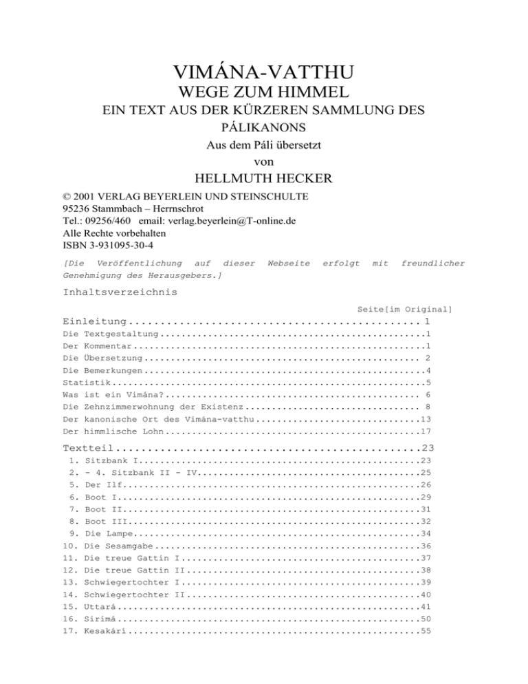 VIMÁNA-VATTHU WEGE ZUM HIMMEL EIN TEXT AUS DER KÜRZEREN SAMMLUNG DES PÁLIKANONS Aus dem Páli übersetzt von HELLMUTH HECKER © 2001 VERLAG BEYERLEIN UND STEINSCHULTE 95236 Stammbach – Herrnschrot Tel.: 09256/460 email: [email protected] Alle Rechte vorbehalten ISBN 3-931095-30-4 [Die Veröffentlichung auf dieser Webseite erfolgt mit freundlicher Genehmigung des Herausgebers.] Inhaltsverzeichnis Seite[im Original] Einleitung .............................................. 1 Die Textgestaltung ................................................ ..1 Der Kommentar ..................................................... ..1 Die Übersetzung .................................................... 2 Die Bemerkungen ................................................... ..4 Statistik ......................................................... ..5 Was ist ein Vimána? ................................................ 6 Die Zehnzimmerwohnung der Existenz ................................. 8 Der kanonische Ort des Vimána-vatthu .............................. .13 Der himmlische Lohn ............................................... .17 Textteil ............................................... .23 1. Sitzbank I.................................................... .23 2. - 4. Sitzbank II - IV......................................... .25 5. Der Ilf....................................................... .26 6. Boot I........................................................ .29 7. Boot II....................................................... .31 8. Boot III...................................................... .32 9. Die Lampe..................................................... .34 10. Die Sesamgabe ................................................. .36 11. Die treue Gattin I ............................................ .37 12. Die treue Gattin II ........................................... .38 13. Schwiegertochter I ............................................ .39 14. Schwiegertochter II ........................................... .40 15. Uttará ........................................................ .41 16. Sirimá ........................................................ .50 17. Kesakárí ...................................................... .55 18. (II,1) Die Dienerin ........................................... 57 19. (II,2) Lakhumá ................................................ .60 20. (II,3) Die Reisschaumspenderin ................................ .61 21. (II,4) Die Kastenlose ......................................... 64 22. (II,5) Die glückliche Frau .................................... 66 23. (II,6) Sonadinná .............................................. 68 24. (II,7) Uposathá ............................................... 69 25. - 26. (II,8 - 9) Niddá und Suniddá ............................. 70 27. (II,10) Die Almosenspenderin I ................................. 70 28. (II,11) Die Almosenspenderin II ................................ 71 29. (III,1) Prächtig ............................................... 71 30. (III,2) Die Spenderin von Zuckerrohr ........................... 74 31. (III,3) Das Ruhebett ........................................... 75 32. (III,4) Latá ................................................... 77 33. (III,5) Guttilo (J 243) ........................................ 80 34. (III,6) Blendend ............................................... 85 35. (III,7) Sesavatí ............................................... 89 36. (III,8) Malliká ................................................ 92 37. (III,9) Die Großäugige ......................................... 96 38. (III,10) Der Korallenbaum ...................................... 98 39. (IV,1) Karmin .................................................. 99 40. (IV, 2) Strahlend ............................................. 100 41. (IV,3) Der Elefant I .......................................... 103 42. (IV, 4) Alomá ................................................. 104 43. (IV,5) Die Gabe von Reisgrütze ................................ 105 44. (IV, 6) Das Kloster ........................................... 106 45. (IV, 7) Vier Frauen ........................................... 109 46. (IV, 8) Mango I ............................................... 110 47. (IV,9) Das Gelbe .............................................. 111 48. (IV, 10) Zuckerrohr II ........................................ 113 49. (IV, 11) Verehrung ............................................ 113 50. (IV, 12) Rajjumálá....... ..................................... 114 51. (V,1) Der Frosch als Göttersohn ............................... 118 52. (V,2) Revatí .................................................. 120 53. (V,3) Der Jüngling Chatto ..................................... 127 54. (V,4) Die Krabbensuppengabe ................................... 132 55. (V, 5) Der Torhüter ........................................... 134 56. (V, 6) Das zu Tuende I ........................................ 135 57. (V, 7) Das zu Tuende II ....................................... 135 58. (V, 8) Nadel I ................................................ 136 59. (V, 9) Nadel II ............................................... 136 60. (V, 10) Elefant II ............................................ 137 61. (V, 11) Elefant III ........................................... 138 62. (V, 12) Elefant IV ............................................ 139 63. (V, 13) Der kleine Wagen. .................................... .141 64. (V, 14) Der große Wagen ...................................... .146 65. (VI, 1) Der Hausner I ........................................ .151 66. (VI, 2) Der Hausner II ....................................... .152 67. (VI, 3) Der Geber der Frucht ................................. .152 68. (VI, 4) Wohnplatz I .......................................... .154 69. (VI, 5) Wohnplatz II ......................................... .155 70. (VI, 6) Almosengeber .........................