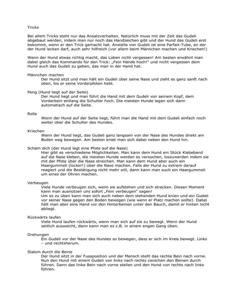 Tricks Bei allem Tricks steht nur das Ansatzverhalten. Natürlich muss mit der Zeit das Gudeli abgebaut werden, indem man nur noch das Handzeichen gibt und der Hund das Gudeli erst bekommt, wenn er den Trick gemacht hat. Anstelle von Gudeli ist eine Parfait-Tube, an der der Hund lecken darf, auch sehr hilfreich (vor allem beim Männchen machen und Kriechen!) Wenn der Hund etwas richtig macht, das Loben nicht vergessen! Am besten erwähnt man dabei gleich das Kommando für den Trick: „Fein Hände hoch!“ und nicht vergessen dem Hund auch das Gudeli zu geben, das man in der Hand hat. Männchen machen Der Hund sitzt und man hält ein Gudeli über seine Nase und zieht es ganz sanft nach oben, bis er seine Vorderpfoten hebt. Peng (Hund liegt auf der Seite) Der Hund liegt und man führt die Hand mit dem Gudeli von seinem Kopf, dem Vorderbein entlang die Schulter hoch. Die meisten Hunde legen sich dann automatisch auf die Seite. Rolle Wenn der Hund auf der Seite liegt, führt man die Hand mit dem Gudeli einfach noch weiter über die Schulter des Hundes. Kriechen Wenn der Hund liegt, das Gudeli ganz langsam von der Nase des Hundes direkt am Boden weg bewegen. Am besten kniet man sich dabei neben den Hund hin. Schäm dich (der Hund legt eine Pfote auf die Nase) Hier gibt es verschiedene Möglichkeiten. Man kann dem Hund ein Stück Klebeband auf die Nase kleben, die meisten Hunde werden es versuchen, loszuwerden indem sie mit der Pfote über die Nase streichen. Man kann dem Hund aber auch ein Haargummeli (locker!) über die Nase machen. Falls der Hund zu extrem darauf reagiert und die Bestätigung nicht mehr will, dann kann man auch ein Haargummeli um eines der Ohren machen. Verbeugen Viele Hunde verbeugen sich, wenn sie aufstehen und sich strecken. Diesen Moment kann man ausnützen uns sofort „Fein verbeugen“ sagen! Um es zu üben kann man sich auch neben dem stehenden Hund knien und ein Gudeli vor seiner Nase gegen den Boden bewegen (wie wenn er Platz machen sollte). Dabei hält man aber eine Hand vor den Hinterbeinen unter den Bauch, damit er hinten nicht abliegt. Rückwärts laufen Viele Hund laufen rückwärts, wenn man sich auf sie zu bewegt. Wenn der Hund seitlich ausweicht, dann kann man es z.B. in einem engen Gang üben. Drehungen Ein Gudeli vor der Nase des Hundes so bewegen, dass er sich im Kreis bewegt. Links – und rechtsherum. Slalom durch die Beine Der Hund sitzt in der Fussposition und der Mensch stellt das rechte Bein nach vorne. Nun den Hund mit einem Gudeli von links nach rechts zwischen den Beinen durch führen. Dann das linke Bein nach vorne stellen und den Hund von rechts nach links führen. Pfote geben Viele Hunde geben die Pfote, wenn sie etwas wollen. Auch hier immer das Kommando erwähnen und loben. Wenn man ein Gudeli in die geschlossene Faust nimmt und vor die Nase des Hundes hält, dann braucht man meistens nur eine gewisse Zeit zu warten, bis der Hund die Pfote hebt! Licht an und aus machen Dazu sollte man dem Hund lernen, ein bestimmtes Ziel (z.B. das Ende eines Zeigestabes oder die Fliegenklatsche oder einen farbigen Zettel) zu berühren. Dazu hält man das Ziel einfach neben den Hund und er wird automatisch schauen, was das ist. In dem Moment sollte man ihn sofort loben! Falls das noch nicht klappt, kann man das Ziel auch ein wenig bewegen, damit es interessanter wird. Falls das gut auf Kommando klappt, kann man das Ziel einfach noch vor den Lichtschalter halten. Falls der Hund den Lichtschalter schlussendlich ohne Ziel berühren soll, dann nimmt man am besten ein Stück Papier, das man dann immer weiter verkleinern kann, bis es nicht mehr da ist. Der Hund kann das Ziel übrigens mit der Pfote oder Nase berühren. Dies kann man natürlich mit vielen anderen Sachen auch machen: Gegenstand ziehen Der Hund soll das Ende einer Schnur (daran kann man z.B. ein Spielzeug binden, das der Hund gerne trägt) ziehen, auch wenn etwas dran hängt (z.B. ein Spielzeug auf Rollen oder ein Spielzeugauto). Am besten zuerst mit der Schnur alleine üben. Auch hier sind der Fantasie keine Grenzen gesetzt: Der Hund kann auch Schubladen oder Backofentüren öffnen, wenn daran eine Schnur gebunden ist! Durch einen Reifen springen Den Hund z.B. durch einen HulaHopp Reifen locken, indem man den Reifen auf den Boden stellt und den Hund mit einem Gudeli durchlockt. Plüschtiere holen Der Hund kann ein Plüschtier holen, am Anfang am besten werfen, damit es interessanter wird. Man kann ihm auch einen Namen geben und den Hund dann zwischen verschiedenen Plüschtieren unterscheiden lassen. Einem bestimmten Menschen etwas bringen Der Hund soll einer bestimmten Person etwas (z.B. ein Spielzeug bringen). Dazu muss er natürlich zuerst den Namen der Person kennen. Die Person könnte den Hund z.B. rufen, nachdem man den Namen gesagt hat. Oder man begleitet den Hund zu der richtigen Person hin. Einen Korb tragen Der Hund kann einen Korb tragen, in dem irgendwelche Sachen sind. Schwierig: Gudeli rein legen! Wenn der Hund den Korbhenkel nicht ins Maul neben will, kann man ihn mit Stoff umwickeln, damit er weicher ist. Gegenstände im Maul halten Hier wird es besonders lustig, wenn der Hund z.B. ein Wienerli im Maul halten kann ohne es zu essen. Ganz lustig sieht es auch aus, wenn der Hund etwas kleines (Achtung: nichts nehmen, was der Hund nicht verschlucken sollte!!) im Maul hat und es dann wieder ausspuckt. Man kann das z.B. mit Gudeli üben. Nachher darf der Hund das Gudeli natürlich auch essen! Gudeli auf der Nase balancieren Man legt dem Hund ein Gudeli auf die Nase, das er erst auf Kommando essen darf. Geschickte Hunde werfen es auf und fangen es dann aus der Luft.