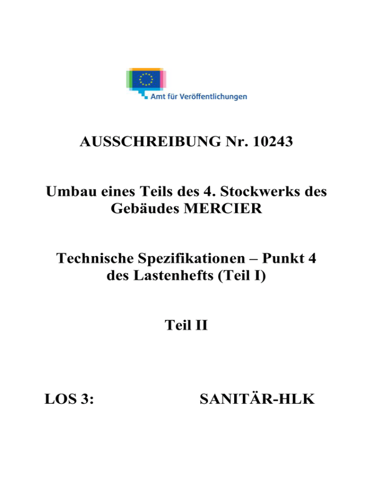 AUSSCHREIBUNG Nr. 10243 Umbau eines Teils des 4. Stockwerks des Gebäudes MERCIER Technische Spezifikationen – Punkt 4 des Lastenhefts (Teil I) Teil II LOS 3: SANITÄR-HLK fAusschreibung 10243 – Teil II Inhaltsverzeichnis 8 HLK- UND SANITÄRARBEITEN .......................................................................................................... 10 8.1 ALLGEMEINES ................................................................................................................................ 10 8.1.1 Beschreibung der Arbeiten ............................................................................................................ 10 8.1.1.1 Lüftung ................................................................................................................................................ 11 8.1.1.2 Heizung ............................................................................................................................................... 12 8.1.1.3 Klimatisierung ..................................................................................................................................... 12 8.1.1.4 Steuerung und Regulierung ................................................................................................................. 13 8.1.1.5 Sanitäranlagen .................................................................................................................................... 13 8.1.2 8.2 NORMEN UND TECHNISCHE KLAUSELN ............................................................................... 13 ABBAU DER VORHANDENEN INSTALLATIONEN................................................................... 14 8.2.1 AUSBAUARBEITEN IM 4. GESCHOSS ....................................................................................... 14 8.2.2 AUSBAUARBEITEN IM BETRIEBSRAUM IM 5. GESCHOSS .................................................... 15 8.3 LÜFTUNG ......................................................................................................................................... 16 8.3.1 BETRIEBSRAUM LÜFTUNG IM 5. GESCHOSS ......................................................................... 17 8.3.1.1 Luftaufbereitungszentrale „Konferenzraum“ ...................................................................................... 17 8.3.1.2 Luftaufbereitungszentrale „Freizeitbereich / Tagungsraum“ ............................................................. 24 8.3.1.3 Trägervorrichtungen für die Luftaufbereitungszentralen .................................................................... 31 8.3.1.4 Rechteckige Rohrleitung ...................................................................................................................... 32 8.3.1.4.1 Rechteckige Rohrleitung - Gerade Teilabschnitte .......................................................................... 32 8.3.1.4.2 Rechteckige Rohrleitung - Für Formstücke.................................................................................... 32 8.3.1.5 8.3.1.5.1 Gerade Teilabschnitte..................................................................................................................... 33 8.3.1.5.2 Für Formstücke .............................................................................................................................. 33 8.3.1.6 8.3.2 Isolation der rechteckigen Rohrleitung für Gebläse und Wiederaufnahme der Luft ........................... 33 Isolation der rechteckigen Rohrleitung für Frischluft ......................................................................... 33 8.3.1.6.1 Isolation der rechteckigen Rohrleitung für Frischluft - Gerade Teilabschnitte .............................. 34 8.3.1.6.2 Isolation der rechteckigen Rohrleitung für Frischluft - Für Formstücke ........................................ 34 RÄUME IM 4. GESCHOSS ........................................................................................................... 34 8.3.2.1 Rechteckige Rohrleitung ...................................................................................................................... 34 8.3.2.1.1 Rechteckige Rohrleitung - Gerade Teilabschnitte .......................................................................... 35 8.3.2.1.2 Rechteckige Rohrleitung - Für Formstücke.................................................................................... 35 8.3.2.2 8.3.2.2.1 Isolation der rechteckigen Rohrleitung für Gebläse und Wiederaufnahme der Luft ........................... 35 Isolation der rechteckigen Rohrleitung für Gebläse und Wiederaufnahme der Luft - Gerade Teilabschnitte ................................................................................................................................. 35 8.3.2.2.2 Isolation der rechteckigen Rohrleitung für Gebläse und Wiederaufnahme der Luft - Für Formstücke ..................................................................................................................................... 35 8.3.2.3 8.3.2.3.1 8.3.2.4 8.3.2.4.1 Einstellregister für die rechteckige Rohrleitung .................................................................................. 36 Einstellregister für die rechteckige Rohrleitung - Abmessungen 500 x 400 mm ........................... 36 Rechteckige Feuerklappen................................................................................................................... 36 Rechteckige Feuerklappen - Abmessungen 500 x 200 mm ............................................................ 37 Technische Spezifikationen – Los 3 – Seite 2 / 149 fAusschreibung 10243 – Teil II 8.3.2.4.2 8.3.2.5 Rechteckige Feuerklappen - Abmessungen 500 x 400 mm ............................................................ 37 Kreisförmige Rohrleitung .................................................................................................................... 37 8.3.2.5.1 Kreisförmige Rohrleitung - Nenndurchm
