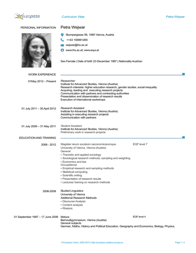 Curriculum Vitae PERSONAL INFORMATION Petra Wejwar Petra Wejwar Stumpergasse 56, 1060 Vienna, Austria ++43 159991269 [email protected] www.ihs.ac.at; www.equi.at Sex Female | Date of birth 23 December 1987 | Nationality Austrian WORK EXPERIENCE 01May 2012 – Present Researcher Institute for Advanced Studies, Vienna (Austria) Research interests: higher education research, gender studies, social inequality Acquiring, leading and executing research projects Communication with partners and contracting authorities Presentation and dissemination of research results Execution of international workshops 01 July 2011 – 30 April 2012 Research Assistant Institute for Advanced Studies, Vienna (Austria) Assisting in executing research projects Communication with partners 01 July 2009 – 31 May 2011 Student Assistant Institute for Advanced Studies, Vienna (Austria) Preliminary work in research projects EDUCATION AND TRAINING 2006 - 2012 2006-2008 Magister rerum socialum oeconomicarumque EQF level 7 University of Vienna, Vienna (Austria) General ▪ Theoretic and applied sociology ▪ Sociological research methods, sampling and weighting ▪ Economics and law Occupational ▪ Empirical research and sampling methods ▪ Statistical computing ▪ Scientific writing ▪ Presentation of research results ▪ Lectures/ training on research methods Studied Linguistics University of Vienna Additional Research Methods ▪ Discourse Analysis ▪ Content analysis ▪ Rhetoric EQF level 4 01 September 1997 – 17 June 2006 Matura Bernoulligymnasium, Vienna (Austria) General subjects German, Maths, History and Political Education, Geography and Economics, Biology, Physics, © European Union, 2002-2013 | http://europass.cedefop.europa.eu Page 1 / 4 Curriculum Vitae Petra Wejwar Chemistry, Psychology, Philosophy, Latin, Music Language skills ▪ English (8 years), Italian (4 years) © European Union, 2002-2013 | http://europass.cedefop.europa.eu Page 2 / 4 Curriculum Vitae Petra Wejwar PERSONAL SKILLS Mother tongue German Other language(s) English Italian UNDERSTANDING SPEAKING WRITING Listening Reading Spoken interaction Spoken production C1 C1 C1 C1 C1 B1 B1 A1 A1 A2 Levels: A1/2: Basic user - B1/2: Independent user - C1/2 Proficient user Common European Framework of Reference for Languages Communication skills Good communication skills gained through communication with international project partners. Fluent presentation style through lectures at international meetings and training experience in workshops Teaching/ training skills Experience in lecturing and training of international workshop participants of various levels of competence in statistical methods and data processing as well as compiling of learning materials Organisational / managerial skills Experience in co-coordination, calculation and writing of proposals for both Austrian authorities and EU authorities (especially for EACEA-Lifelong learning program) Leading and executing of national projects Job-related skills Ability for development and execution of independent research approaches Capability to quickly adopt research and data exploitation methods Experience in questionnaire and survey design Experience in coordinating international projects Main research topics: Social dimension in higher education, gender studies, disabilities Computer Skills MS Office (very good), SPSS (very good), Stata (Basics), R(Basics) © European Union, 2002-2013 | http://europass.cedefop.europa.eu Page 3 / 4 Curriculum Vitae Petra Wejwar ADDITIONAL INFORMATION Publications (selection) Wejwar, P.; Grabher, A.; et al. (2013): Pläne zur Aufnahme weiterführender Studien von Studierenden an Universitäten. Eine Analyse des geschlechtsspezifischen Übertrittsverhaltens, Studie im Auftrag der Österreichischen HochschülerInnenschaft.. Wejwar P.; Grabher, A.; et al. (2013): Zur Situation von Studentinnen - Zusatzbericht zur StudierendenSozialerhebung 2011, Studie im Auftrag des BMWF. Unger M.; Zaussinger S.; et al. (2012): Studierenden-Sozialerhebung 2011 - Die soziale Lage der Studierenden in Österreich, Studie im Auftrag des BMWF. Unger, M.; Grabher, A. Wejwar, P. et al. (2012): Internationale Mobilität von Studierenden 2011. Zusatzbericht der Studierenden-Sozialerhebung 2011. Wien: Studie im Auftrag des BMWF. Wejwar, P.; Unter, M.; Laimer, A. (2012): Studierende mit Kindern. Zusatzbericht der StudierendenSozialerhebung 2011. Wien: Studie im Auftrag des BMWF. Wejwar, P. (2012): Geschlechterspezifische Einkommensunterschiede unter Studierenden an Universitäten in Österreich. Wien: Diplomarbeit. Zaussinger, S.; Wejwar, P.; et al (2012): Studierende mit Behinderungen und chronischen Erkrankungen. Teil 1 der Zusatzstudie im Rahmen der Studierenden-Sozialerhebung 2011. Wien: Studie im Auftrag des BMWF. Unger, M.; Wejwar, P.; Zaussinger, S.; Laimer, A. (2012): beeinträchtigt studieren. Datenerhebung zur Situation Studierender mit Behinderung und chronischer Krankheit 2011. Wien: Studie im Auftrag des BMWF. Unger, M.; Wejwar, P.; Hartl, J. (2011): Eurostudent IV – Internationale Koordination. Unger, M. Zaussinger, S.; Gottwald, R; Wejwar, P. et al. (2010): Internationale Mobilität der Studierenden 2009. Wien: Studie im Auftrag des BMWF. Unger, M.; Hartl, J.; Wejwar, P. (2010): Studierende mit gesundheitlichen Beeinträchtigungen. Teil A: Zusatzbericht der Studierenden-Sozialerhebung 2009. Wien: Studie im Auftrag des BMWF. Unger, M.; Zaussinger, S.; Gottwald, R.; Wejwar P.; et al (2010): Studierenden-Sozialerhebung 2009 – die soziale Lage der Studierenden in Österreich. Wien: Studie im Auftrag des BMWF. Presentations (selection) Studierende mit Beeinträchtigung – Heterogenität als Herausforderung (engl.: Students with impairments – challenging heterogeneity; Berlin 2013: 8. Jahrestagung der GfHf Bildung hat ihren Preis (engl.: Education has a price); Linz 2012: Tagung der Sektion Soziale Ungleichheit des ÖGS Geschlechterspezifische Einkommensunterschiede bei 