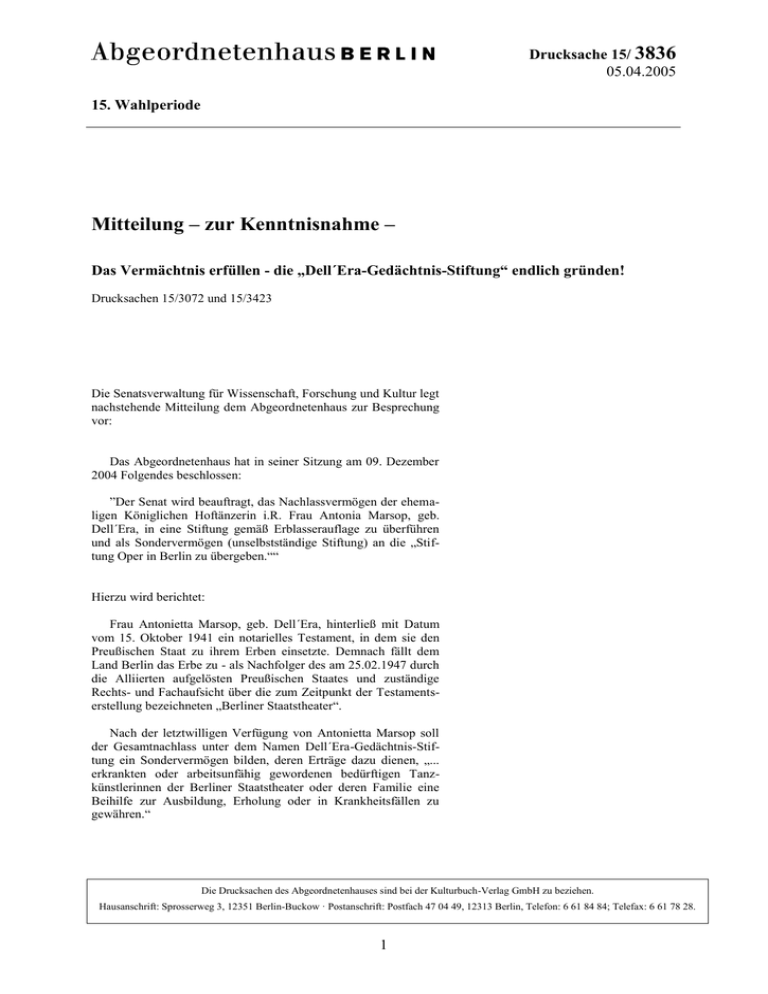 Drucksache 15/ 3836 05.04.2005 15. Wahlperiode Mitteilung – zur Kenntnisnahme – Das Vermächtnis erfüllen - die „Dell´Era-Gedächtnis-Stiftung“ endlich gründen! Drucksachen 15/3072 und 15/3423 Die Senatsverwaltung für Wissenschaft, Forschung und Kultur legt nachstehende Mitteilung dem Abgeordnetenhaus zur Besprechung vor: Das Abgeordnetenhaus hat in seiner Sitzung am 09. Dezember 2004 Folgendes beschlossen: ”Der Senat wird beauftragt, das Nachlassvermögen der ehemaligen Königlichen Hoftänzerin i.R. Frau Antonia Marsop, geb. Dell´Era, in eine Stiftung gemäß Erblasserauflage zu überführen und als Sondervermögen (unselbstständige Stiftung) an die „Stiftung Oper in Berlin zu übergeben.““ Hierzu wird berichtet: Frau Antonietta Marsop, geb. Dell´Era, hinterließ mit Datum vom 15. Oktober 1941 ein notarielles Testament, in dem sie den Preußischen Staat zu ihrem Erben einsetzte. Demnach fällt dem Land Berlin das Erbe zu - als Nachfolger des am 25.02.1947 durch die Alliierten aufgelösten Preußischen Staates und zuständige Rechts- und Fachaufsicht über die zum Zeitpunkt der Testamentserstellung bezeichneten „Berliner Staatstheater“. Nach der letztwilligen Verfügung von Antonietta Marsop soll der Gesamtnachlass unter dem Namen Dell´Era-Gedächtnis-Stiftung ein Sondervermögen bilden, deren Erträge dazu dienen, „... erkrankten oder arbeitsunfähig gewordenen bedürftigen Tanzkünstlerinnen der Berliner Staatstheater oder deren Familie eine Beihilfe zur Ausbildung, Erholung oder in Krankheitsfällen zu gewähren.“ Die Drucksachen des Abgeordnetenhauses sind bei der Kulturbuch-Verlag GmbH zu beziehen. Hausanschrift: Sprosserweg 3, 12351 Berlin-Buckow · Postanschrift: Postfach 47 04 49, 12313 Berlin, Telefon: 6 61 84 84; Telefax: 6 61 78 28. 1 Abgeordnetenhaus von Berlin – 15. Wahlperiode Drucksache 15/ 3836 Das von der Senatsverwaltung für Finanzen im Februar 2001 vom Testamentsvollstrecker in Depotwerten übernommene Nachlassvermögen hatte am 31.12.2000 einen Kurswert von rd. 1,6 Mio. €. Mit Stand 31.12.2004 beläuft sich das Nachlassvermögen auf insgesamt 1.445.725,- € (1.036.009,- € Depotwerte + 409.716,- € Termingelder). Seit Übernahme des Vermögens durch die Finanzverwaltung sind sämtliche Erträge und Erlöse dem Vermögensbestand zugeflossen. einer Satzung für die Dell´Era-Gedächtnis-Stiftung als auch deren Gründung zugestimmt. In einem zwischen der Stiftung Oper in Berlin und der das Nachlassvermögen Antonietta Marsops verwaltenden Senatsverwaltung für Finanzen abgestimmten Verfahren werden die entsprechenden Depotwerte und Termingelder an die Stiftung Oper in Berlin als Treuhänderin der Dell´Era-Gedächtnis-Stiftung übertragen. Der Nachlass Antonietta Marsops bildet das Grundstockvermögen der Dell´Era-GedächtnisStiftung. Gem. §4 Abs.3 der Satzung ist es in seinem Bestand dauernd und ungeschmälert zu erhalten und möglichst ertragreich anzulegen. Nach dem Willen der Stifterin soll die Dell´EraGedächtnis-Stiftung keine besondere juristische Person sein. Mit Errichtung der öffentlich-rechtlichen Stiftung Oper in Berlin zum 01.01.2004 existiert ein Rechtsträger, der als Treuhänder für die nicht rechtsfähige (unselbstständige) Dell´Era-Gedächtnis-Stiftung fungieren und mit dem künstlerisch und wirtschaftlich eigenständigen Staatsballett Berlin als Teilbetrieb der Opernstiftung dem testamentarischen Ansinnen von Antonietta Marsop gerecht wird. Die Satzung der Dell´Era-Gedächtnis-Stiftung füge ich diesem Schreiben zur Information bei. Ich bitte, den Beschluss damit als erledigt anzusehen. Berlin, den 24. März 2005 Der Stiftungsrat der Stiftung Oper in Berlin hat in seiner Sitzung am 01. März 2005 dem Entwurf Dr. Thomas F l i e r l Senator für Wissenschaft, Forschung und Kultur 2 Abgeordnetenhaus von Berlin – 15. Wahlperiode Drucksache 15/ 3836 Satzung der „Dell’Era-Gedächtnis-Stiftung“ §1 Name, Rechtsform und Sitz der Stiftung (1) Die Stiftung führt den Namen „Dell’Era-Gedächtnis-Stiftung“. (2) Sie ist eine nicht rechtsfähige Stiftung in Verwaltung der Stiftung Oper in Berlin (im folgenden: Treuhänderin) mit Sitz in Berlin und wird von dieser im Rechtsverkehr vertreten. §2 Stiftungszweck (1) Die Stiftung hat vor allem den Zweck, erkrankten oder arbeitsunfähig gewordenen bedürftigen Tanzkünstlerinnen der Berliner Staatstheater bzw. deren Rechtsnachfolger in öffentlich-rechtlicher Trägerschaft oder deren Familien eine Beihilfe zur Ausbildung, Erholung oder in Krankheitsfällen zu gewähren. (2) Dieser Stiftungszweck wird insbesondere verwirklicht durch die Gewährung von Unterhaltsbeihilfen, die Gewährung von Zuschüssen zu den Kosten für medizinische Behandlungen, Reha-Maßnahmen, Kuraufenthalte, Umschulungen und Fortbildungsmaßnahmen sowie im Einzelfall durch die Übernahme solcher Kosten. (3) Darüberhinaus hat die Stiftung den Zweck, das Erbbegräbnis der Stifterin Antonietta Marsop-Dell’Era auf dem Cimitero Monumentale in Mailand in gutem Zustand zu erhalten. §3 Mildtätige Zwecke (1) Die Stiftung verfolgt ausschließlich und unmittelbar mildtätige Zwecke im Sinne des Abschnitts „Steuerbegünstigte Zwecke“ der Abgabenordnung (AO). (2) Die Stiftung ist selbstlos tätig. Sie verfolgt nicht in erster Linie eigenwirtschaftliche Zwecke. (3) Mittel der Stiftung dürfen nur für die satzungsmäßigen Zwecke verwendet werden. 3 Abgeordnetenhaus von Berlin – 15. Wahlperiode Drucksache 15/ 3836 (4) Keine Person darf durch Ausgaben, die dem Stiftungszweck fremd sind oder durch unverhältnismäßig hohe Vergütungen begünstigt werden. §4 Grundstockvermögen (1) Der Grundstock des Stiftungsvermögens ergibt sich aus dem Nachlass der Stifterin und besteht zum Zeitpunkt der Errichtung der Stiftung aus Wertpapieren und Termingeldern mit folgendem Bestand per 31.12.2004: a. 1.036.009,- € (Depotwerte) b. 409.716,- € (Termingelder). (2) Die Treuhänderin ist berechtigt, Zuwe