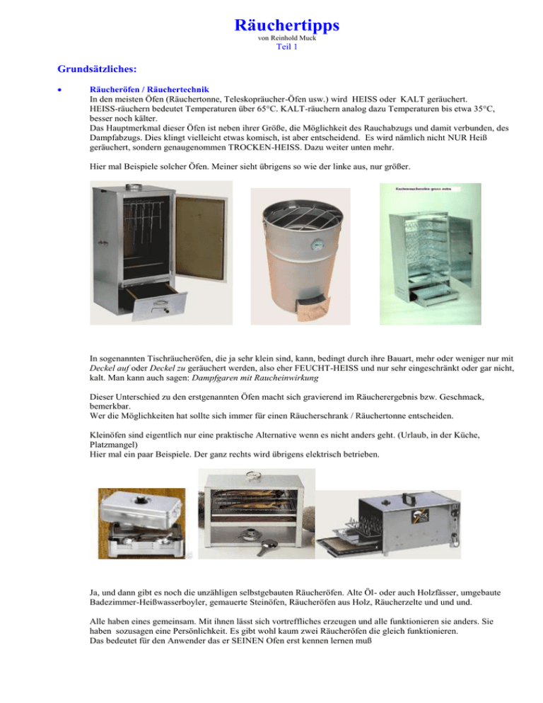 Räuchertipps von Reinhold Muck Teil 1 Grundsätzliches: Räucheröfen / Räuchertechnik In den meisten Öfen (Räuchertonne, Teleskopräucher-Öfen usw.) wird HEISS oder KALT geräuchert. HEISS-räuchern bedeutet Temperaturen über 65°C. KALT-räuchern analog dazu Temperaturen bis etwa 35°C, besser noch kälter. Das Hauptmerkmal dieser Öfen ist neben ihrer Größe, die Möglichkeit des Rauchabzugs und damit verbunden, des Dampfabzugs. Dies klingt vielleicht etwas komisch, ist aber entscheidend. Es wird nämlich nicht NUR Heiß geräuchert, sondern genaugenommen TROCKEN-HEISS. Dazu weiter unten mehr. Hier mal Beispiele solcher Öfen. Meiner sieht übrigens so wie der linke aus, nur größer. In sogenannten Tischräucheröfen, die ja sehr klein sind, kann, bedingt durch ihre Bauart, mehr oder weniger nur mit Deckel auf oder Deckel zu geräuchert werden, also eher FEUCHT-HEISS und nur sehr eingeschränkt oder gar nicht, kalt. Man kann auch sagen: Dampfgaren mit Raucheinwirkung Dieser Unterschied zu den erstgenannten Öfen macht sich gravierend im Räucherergebnis bzw. Geschmack, bemerkbar. Wer die Möglichkeiten hat sollte sich immer für einen Räucherschrank / Räuchertonne entscheiden. Kleinöfen sind eigentlich nur eine praktische Alternative wenn es nicht anders geht. (Urlaub, in der Küche, Platzmangel) Hier mal ein paar Beispiele. Der ganz rechts wird übrigens elektrisch betrieben. Ja, und dann gibt es noch die unzähligen selbstgebauten Räucheröfen. Alte Öl- oder auch Holzfässer, umgebaute Badezimmer-Heißwasserboyler, gemauerte Steinöfen, Räucheröfen aus Holz, Räucherzelte und und und. Alle haben eines gemeinsam. Mit ihnen lässt sich vortreffliches erzeugen und alle funktionieren sie anders. Sie haben sozusagen eine Persönlichkeit. Es gibt wohl kaum zwei Räucheröfen die gleich funktionieren. Das bedeutet für den Anwender das er SEINEN Ofen erst kennen lernen muß Wärmequelle / Feuer Als Wärmequellen kommen Holz-, Gas- oder Strom in Frage. Ich persönlich bevorzuge die Gasfeuerung. Sie ist im Gegensatz zu Strom billiger aber genauso leicht und sauber zu handhaben. Die offene Flamme sorgt für trockene, heiße Luft, die auch absolut Geschmacksneutral ist. Holz ist sehr qualitätsabhängig und nur mit viel Erfahrung gut zu handhaben. Außerdem ist nicht jedes Holz zu gebrauchen. Es kommen eigentlich nur Harthölzer wie z.B. Buche, Ahorn (Robinie), Hickory, Obsthölzer, etwas eingeschränkt Eiche und einige Weichhölzer wie Erle, Weide, Pappel u.s.w. in Frage. Birke ist nur mit viel Erfahrung verwendbar. Durch ihren hohen Ölgehalt in der Rinde rußt sie sehr schnell und stark. Trotzdem wird sie speziell in Skandinavien oft verwendet. Wichtig ist dabei, das eben die Rinde entfernt wird. Übrigens ein Tipp zum Feuermachen: frische Birkenrinde brennt wie Zunder, auch wenn sie selbst nass ist. Nadelhölzer haben zu viel Harz und scheiden deshalb aus. Schwarzer Rauch und damit auch schwarze Fische sind in der Regel das Ergebnis. Wenn Nadelholz verwendet wird, Wacholder z.B., dann nur in geringen Mengen und hauptsächlich wegen dem Aroma. Alternativ können Grillkohle oder Grillbriketts benutzt werden. Grillbriketts müssen aber voll durchgeglüht sein, damit das Bindemittel verbrannt ist und somit keine Geschmacksbeeinträchtigung der Fische erfolgen kann. Besonders zu empfehlen sind Grillbriketts von TOM. Es handelt sich hierbei um gepresste Kokosfasern in Würfelform die sehr viel Hitze bringen und kaum Asche erzeugen. Leider sind diese nicht überall zu bekommen. Grillbriketts eignen sich besonders gut für Teleskop-Räucheröfen und kleinere Räucherschränke. Für große Räucherschränke ist eher Gas und Strom das Richtige, und natürlich das offene Holzfeuer. Und hier sind wir nochmals bei den Räucheröfen. Fast alle Räucheröfen haben einen durchgängigen Garraum, das heißt, vom Feuer bis zum Kamin/Rauchrohr gibt es kein Hindernis welches die Zirkulation der heißen Luft behindern würde. Lediglich bei offenem Feuer wie Gas oder Holz, wird eine kleine Blechplatte zwischen Feuer und Fischen, ein Verbrennen verhindern. Ganz anders bei den Tischräucheröfen. Wie man, speziell an dem mittleren Modell, siehe oben, sehr schön sehen kann, ist die Hitzequelle regelrecht hermetisch vom Garraum abgeschirmt. Hier kann keine Heißluft zirkulieren. Es wird lediglich der Garraum erhitzt und der ganze, zwangsläufig entstehende Dampf kann, wenn überhaupt, nur sehr schlecht abziehen. Ein entscheidender Minuspunkt bei dieser Art Öfen. Durch den Dampf bleibt der Fisch an seiner Oberfläche immer etwas feucht und kann daher kaum oder nur sehr schlecht Farbe annehmen. Die Folge ist, das meist zuviel Räuchermehl verwendet wird. Oft ist sogar so, das sich auf dem Fisch regelrecht Kondensat bildet, was dann zu einem etwas säuerlichen Geschmack führt. Dieses Kondensat ist nichts anderes als mit Rauch vermischter Wasserdampf. Rauch Für den Rauch benötigen wir nur bestes, gesundes Holz bzw. Holzmehl. In Frage kommen die gleichen Hölzer wie zuvor unter Wärmequelle bereits erwähnt. Mein Tipp: Robinie. Das Holz muss absolut frei von Schimmel oder Fäulnis, Farbe oder sogar Schmierstoffen sein, z.B. von der Kettensäge. Je feiner das Holz desto stärker und länger anhaltend ist die Rauchentwicklung. So kann z.B. leicht angedrücktes Holzmehl stundenlang glimmen und dabei so gut wie keine Hitze entwickeln. Es eignet sich deshalb sehr gut zum kalträuchern. Bei den Holzarten gibt es natürlich geschmackliche Unterschiede. Buche hat einen etwas kräftigen, leicht säuerlichen Geschmack und bringt eine schöne, eher dunklere Farbe. Sehr geeignet für alle Fischarten. Erle hingegen erzeugt einen intensiven, charakteristisch riechenden Rauch der eine schöne goldene Farbe ergibt. Das gleiche gilt im verstärkten Maße für Weide. Wacholder ist eher als Würze zu sehen und auch nur sparsam zu verwenden. Es erzeugt einen typischen aber leicht überlagernden Geschmack. Am besten gibt 