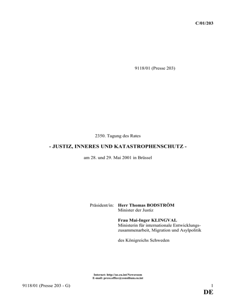 C/01/203 9118/01 (Presse 203) 2350. Tagung des Rates - JUSTIZ, INNERES UND KATASTROPHENSCHUTZ am 28. und 29. Mai 2001 in Brüssel Präsident/in: Herr Thomas BODSTRÖM Minister der Justiz Frau Mai-Inger KLINGVAL Ministerin für internationale Entwicklungszusammenarbeit, Migration und Asylpolitik des Königreichs Schweden Internet: http://ue.eu.int/Newsroom E-mail: [email protected] 9118/01 (Presse 203 - G) 1 DE 28.-29.V.2001 INHALT TEILNEHMER .................................................................................................................................. 5 ERÖRTERTE PUNKTE PROTOKOLL ZUM ÜBEREINKOMMEN VON 2000 ÜBER DIE RECHTSHILFE IN STRAFSACHEN ZWISCHEN DEN MITGLIEDSTAATEN DER EUROPÄISCHEN UNION ................................................................................................................................................. 7 RAHMENBESCHLUSS DES RATES ZUR BEKÄMPFUNG DES MENSCHENHANDELS ........ 9 ZUSAMMENARBEIT ZWISCHEN DEN GERICHTEN DER MITGLIEDSTAATEN DER EUROPÄISCHEN UNION AUF DEM GEBIET DER BEWEISAUFNAHME IN ZIVILODER HANDELSSACHEN ............................................................................................................. 10 ERÖFFNUNG VON VERHANDLUNGEN IM RAHMEN DER HAAGER KONFERENZ FÜR INTERNATIONALES PRIVATRECHT ÜBER EIN WELTWEITES ABKOMMEN ÜBER DIE GERICHTLICHE ZUSTÄNDIGKEIT UND AUSLÄNDISCHE ENTSCHEIDUNGEN IN ZIVIL- UND HANDELSSACHEN ........................................................ 11 VORÜBERGEHENDE SCHUTZGEWÄHRUNG BEI EINEM MASSIVEN ZUSTROM VON VERTRIEBENEN, DIE INTERNATIONALEN SCHUTZES BEDÜRFEN ......................... 12 RECHT AUF FAMILIENZUSAMMENFÜHRUNG ....................................................................... 14 SCHUTZ DES EURO ........................................................................................................................ 15 SCHUTZ DES EURO VOR FÄLSCHUNGEN ...................................................................... 15 DIE ROLLE EUROPOLS BEIM SCHUTZ DES EURO - SCHLUSSFOLGERUNGEN ..... 16 GRUNDSÄTZE FÜR DIE FINANZIERUNG DES SIS II - SCHLUSSFOLGERUNGEN ............ 17 SONSTIGES ...................................................................................................................................... 18 GRIECHISCHE INITIATIVE - EUROPÄISCHES OBSERVATORIUM FÜR MIGRATION ........................................................................................................................... 18 EUROPOL - ABKOMMEN MIT NORWEGEN, ISLAND UND INTERPOL ...................... 18 DAS VERSCHWINDEN UND DIE SEXUELLE AUSBEUTUNG VON KINDERN .......... 18 BEIM MITTAGESSEN ERÖRTERTE PUNKTE ............................................................................ 19 SCHUTZ DER FINANZIELLEN INTERESSEN DER GEMEINSCHAFTEN ..................... 19 AKTUALISIERUNG DER JI-FORTSCHRITTSANZEIGERS.............................................. 19 ERWEITERUNG ..................................................................................................................... 19 9118/01 (Presse 203 - G) 2 DE 28.-29.V.2001 GEMISCHTER AUSSCHUSS PROTOKOLL ZUM ÜBEREINKOMMEN VON 2000 ÜBER DIE RECHTHILFE IN STRAFSACHEN ZWISCHEN DEN MITGLIEDSTAATEN DER EUROPÄISCHEN UNION ............................................................................................................................................... 20 BEIHILFE ZUR ILLEGALEN EINREISE, ILLEGALEN DURCHREISE UND ZUM ILLEGALEN AUFENTHALT SOWIE VERSTÄRKUNG DES STRAFRECHTLICHEN RAHMENS FÜR DIE BEKÄMPFUNG DER BEIHILFE ZUR ILLEGALEN EINREISE UND ZUM ILLEGALEN AUFENTHALT ...................................................................................... 20 HAFTUNG VON BEFÖRDERUNGSUNTERNEHMEN - RICHTLINIE DES RATES ZUR ERGÄNZUNG DER REGELUNGEN NACH ARTIKEL 26 DES ÜBEREINKOMMENS ZUR DURCHFÜHRUNG DES ÜBEREINKOMMENS VON SCHENGEN VOM 14. JUNI 1985 .................................................................................................................................................... 22 ILLEGALE ZUWANDERUNG ÜBER DEN WESTLICHEN BALKAN ....................................... 23 OHNE AUSSPRACHE ANGENOMMENE PUNKTE JUSTIZ UND INNERES ........................................................................................................................ I Illegale Migrationsströme durch den Westlichen Balkan - Schlussfolgerungen ...................................................... I Zusammenarbeit der konsularischen Vertretungen vor Ort ................................................................................... IV Gegenseitige Anerkennung von Entscheidungen über die Rückführung von Drittstaatsangehörigen *................ IV Kontrolle von Minderjährigen an den Außengrenzen der Mitgliedstaaten - Schlussfolgerungen .......................... V Visa .................................................................................................................................................................... VI Freier Personenverkehr mit einem Visum für den längerfristigen Aufenthalt * ........................................ VI Gemeinsame Konsularische Instruktion - Visa für den längerfristigen Aufenthalt, die gleichzeitig als Visa für einen kurzfristigen Aufenthalt Gültigkeit besitzen ............................................................................. VI Asyl und Migration - Sachstandsbericht zu den unter schwedischem Vorsitz durchgeführten Aktivitäten .......... VI Asyl undMigration - Schlussfolgerungen des Rates über die gemeinsame Analyse und Statistiken ................... VII Rechtshilfe in Strafsachen .................................................................................................................................. VIII DNS - Entschließung ............................................................................................................................................. IX Betrug und Fälschung im Zusammenhang mit unbaren Zahlungsmitteln ...