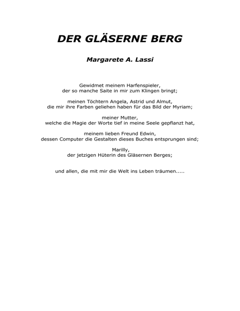 DER GLÄSERNE BERG Margarete A. Lassi Gewidmet meinem Harfenspieler, der so manche Saite in mir zum Klingen bringt; meinen Töchtern Angela, Astrid und Almut, die mir ihre Farben geliehen haben für das Bild der Myriam; meiner Mutter, welche die Magie der Worte tief in meine Seele gepflanzt hat, meinem lieben Freund Edwin, dessen Computer die Gestalten dieses Buches entsprungen sind; Marilly, der jetzigen Hüterin des Gläsernen Berges; und allen, die mit mir die Welt ins Leben träumen..... EINLEITUNG Das Museum liegt im Licht eines milden Spätsommertages. Es ist aus Holz erbaut, und es gibt daran keinerlei elektrische Leitungen. Das gilt auch für die übrigen Häuser, die inmitten von Wiesen und lockerem Buschwerk stehen. Autos gibt es ebenfalls nicht in dieser Stadt. Dafür sieht man jede Menge spielender Kinder, deren fröhliches Geschrei überall zu hören ist. Zwischen Gemüsepflanzungen und kleinen, eingezäunten Weiden mit Schafen, Ziegen und einigen Rindern sind hier und da runde, konkave Spiegel aufgestellt, und Windräder drehen sich mit leisem Schwirrton. Es ist wohl eine Stadt, aber eine des 25. Jahrhunderts, und auf einen Bewohner heutiger Ballungszentren würde sie wohl etwas provinziell wirken. Vor dem Museum wartet eine Gruppe von etwa fünfundzwanzig Menschen. Sie sind von eher kleinem Wuchs und zart von Gestalt und haben große, glänzende Augen. Anscheinend beginnt gleich eine Führung. Die Türe öffnet sich, eine Frau in mittleren Jahren tritt heraus und begrüßt die Gruppe mit freundlichen Worten. Wollen wir nun etwas näher herankommen und an der Führung teilnehmen, als unsichtbare Gäste aus der Vergangenheit, die einen kleinen Nachmittagsausflug in eine ihrer möglichen Zukünfte unternehmen? Gut, folgen wir also dieser Gruppe! Sie geht mit ihrer Führerin in einen großen, hellen Raum, der keine sichtbare Lichtquelle hat. Vielleicht erkennen wir sie aber auch nicht, weil wir ja nicht wissen, wie eine solche im Jahre 2497 aussehen könnte. Der Raum ist vollkommen leer, nur in der Mitte steht eine Vitrine, deren einziger Inhalt ein aufgeschlagenes Buch ist, das auf einer Unterlage aus weichen Stoff liegt. Das Museum scheint nur aus diesem einzigen Raum zu bestehen. Die Menschen, wir in ihrer Mitte, stellen sich jetzt kreisförmig um die Vitrine auf und warten auf die Ausführungen der Museumsbediensteten. Auffällig ist die ehrfürchtige Miene, mit der die Meisten auf das Buch blicken. Es muss sich um eine große Kostbarkeit handeln, obwohl es reichlich alt und zerfleddert wirkt. Die Sprache, in welcher die Führerin zu der Gruppe spricht, können wir Heutigen wahrscheinlich nicht verstehen. Sie ist der Unseren ganz und gar unähnlich, die meisten unserer Begriffe kommen in ihrem Idiom einfach nicht vor. Ich übersetze also, reichlich frei und simultan: "Liebe Mitbürger, Sie genießen das besondere Vorrecht, heute als erste Besucher das Original der alten Schriften sehen zu können, aufgrund derer wir wenigstens etwas über die versunkene Kultur unserer Vorfahren wissen. Bisher glaubte ja die ganze Welt, dass diese unzivilisierte, geistig unentwickelte Wilde gewesen seien, die uns als einzige Hinterlassenschaft vergiftete Böden, abgeholzte Wälder, Berge unverrottbaren Mülls und ähnliche Segnungen zurück ließen und einen seltsamen, an ein Kreuz genagelten Gott mit leidenden Zügen anbeteten, der ihnen offenbar all dies aufgetragen hatte. 2 Sie bewegten sich in Kisten aus Blech fort, die grauenerregende Dämpfe ausstießen und sehr gesundheitsschädliche Wirkungen gehabt haben mussten. Archäologen gruben zuletzt riesige Trümmerstätten aus, die sich über hunderte Quadratkilometer hinziehen und ganz offensichtlich keinerlei Anbauflächen oder Gartenfelder zwischen den Häusern besaßen.(ungläubiges Erstaunen in den Gesichtern der Zuhörer). Anscheinend waren solche Stadtmonster einst über die ganze Welt verstreut. Jedes Kind weiß doch heute, dass man, was man verbraucht, wieder erneuern muss. Ihnen war diese einfache Tatsache anscheinend nicht vertraut, stellen sie sich das nur einmal vor! So vergifteten sie die Luft, verbrauchten die Bodenschätze, holzten blindlings die Wälder ab, anscheinend ohne sich je zu fragen, wie ihre Nachkommen später leben sollten. Nun, ich will ihre Vorstellungskraft nicht weiter mit solchen Ungeheuerlichkeiten überfordern. Unsere Wissenschafter sind eben gerade dabei, zu untersuchen, wie sie solche Monstrositäten entwickeln konnten wie etwa unverrottbare Pflanzen, oder gar Menschen mit Schweinegenen. Was, Sie schütteln den Kopf? Nun ja, es klingt ja wirklich unglaublich, aber so etwas dürfte es, den neuesten Funden nach, gegeben haben, wenn unsere Wissenschaft da nicht einem Irrtum unterliegt. Sie konzentrierten sich anscheinend nur auf die Außenseite der Dinge. So reisten sie zum Beispiel nur im Körper, also mit Energie freßenden Verkehrsmitteln, oder verständigten sich nur über die Sprache, auch über weite Distanzen, ohne ihre inneren Verbindungswege zu nutzen. So erscheint es fast unglaublich, dass diese unzivilisierte Periode erst fünfhundert Jahre zurückliegen soll. Aber, um zum Ende meiner Ausführungen zu kommen, wie wir alle wissen, wurde durch "Zufall" dieses Buch bei einer Expedition eines Forscherteams gefunden, und es grenzt wirklich an ein Wunder, dass sich das Material so lange halten hatte können. Ein junger Forscher brach bei Grabungen an einer Ruine des zwanzigsten Jahrhunderts durch die Decke einer Erdhöhle und fand dort, unter einer kleinen, seltsam unausgeformten Frauenstatuette, welche Sie gleich hier daneben besichtigen können, eine Kassette mit diesem Buch. Die Sprachwissenschafter haben sich lange Zeit bemüht, es zu entschlüsseln; aber, die Wissenschaft ist auf diesem Gebiet ja sehr weit fortgeschritten, wie wir alle wissen." Sie sagt das im Vollgefühl ihrer Zugehörigkeit zu einer überlegenen Zivilisation, diese kleine Schwäche der Überheblichkeit ist den Zukünftigen ansc