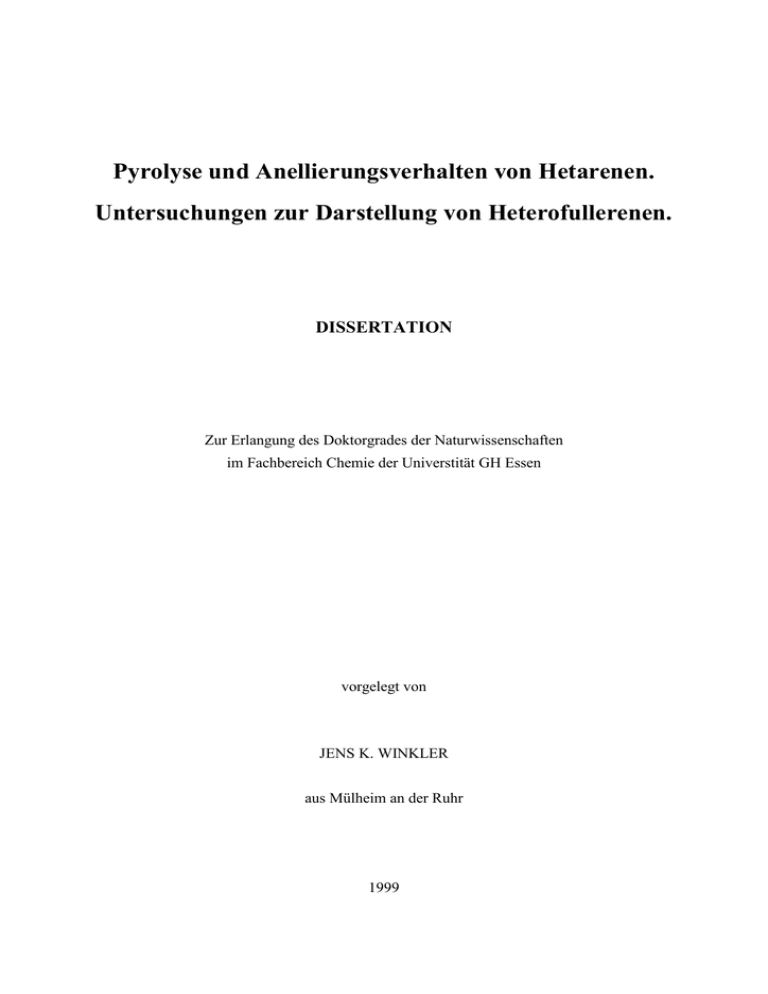 Pyrolyse und Anellierungsverhalten von Hetarenen. Untersuchungen zur Darstellung von Heterofullerenen. DISSERTATION Zur Erlangung des Doktorgrades der Naturwissenschaften im Fachbereich Chemie der Universtität GH Essen vorgelegt von JENS K. WINKLER aus Mülheim an der Ruhr 1999 Referent: Prof. Dr. P. Rademacher Korreferent: Prof. Dr. Dr. h.c. R. Sustmann Tag der mündlichen Prüfung: 15.12.1999 Die vorliegende Arbeit wurde in der Zeit von September 1996 bis September 1999 im Institut für Organische Chemie der Universität GH Essen angefertigt. Mein Dank gilt insbesondere Herrn Prof. Dr. P. Rademacher für die interessante Themenstellung und die mir stets gewährte freundliche Unterstützung bei der Durchführung dieser Arbeit. Herrn Prof. Dr. Dr. h.c. Sustmann möchte ich für die Übernahme des Korreferates danken. Außerdem danke ich Herrn Prof. Dr. Dr. h.c. Sustmann und Herrn W. Sicking für die Überlassung des Programmes PERGRA. Weiterhin gilt mein Dank Herrn W. Karow für die Aufnahme der zahlreichen Massenspektren, Herrn W. Sicking für die hilfreichen Diskussionen bei den Berechnungen sowie Frau K. Brauner und Frau V. Hilterkamp für die Durchführung der Elementaranalysen. Herrn K. Kowski und Herrn H.-P. Kutsch möchte ich für die Hilfestellung bei der Lösung von praktischen Problemen danken, die bei der Durchführung dieser Arbeit auftraten. Überdies danke ich allen Mitgliedern unseres Arbeitskreises und des Institutes für Organische Chemie, die zum Gelingen dieser Arbeit beigetragen haben. Worte sind Luft. Aber die Luft wird zu Wind, und der Wind macht die Schiffe segeln. Arthur Koestler Inhaltsverzeichnis 1 Einleitung 1 2 Problemstellung und Arbeitsprogramm 4 3 Verwendete Methoden 8 3.1 Pyrolyse 8 3.2 Graphitverdampfung 10 4 Pyrolysen 10 4.1 Pyrolyse fünfgliedriger stickstoffhaltiger Hetarene 11 4.1.1 Pyrolyse von Pyrrol (7) 11 4.1.1.1 Produktverteilung 11 4.1.1.2 Fragmentierung und Anellierung 12 4.1.1.3 Diskussion 16 4.1.2 Pyrolyse von Indol (8) 17 4.1.2.1 Produktverteilung 17 4.1.2.2 Fragmentierung und Anellierung 17 4.1.3 Pyrolyse von Carbazol (9) 20 4.1.3.1 Produktverteilung 20 4.1.3.2 Fragmentierung und Anellierung 20 4.2 Pyrolyse sechsgliedriger stickstoffhaltiger Hetarene 21 4.2.1 Pyrolyse von Pyridin (10) 21 4.2.1.1 Produktverteilung 21 4.2.1.2 Fragmentierung und Anellierung 22 4.2.1.3 Diskussion 25 4.2.2 Pyrolyse von Chinolin (11) und Isochinolin (12) 26 4.2.2.1 Produktverteilung 26 4.2.2.2 Fragmentierung und Anellierung 28 4.2.2.3 Diskussion 31 4.3 Pyrolyse fünfgliedriger sauerstoffhaltiger Hetarene 32 4.3.1 Pyrolyse von Furan (13) 32 4.3.1.1 Produktverteilung 32 4.3.1.2 Fragmentierung und Anellierung 34 4.3.2 Pyrolyse von Benzo[b]furan (14) 37 4.3.2.1 Produktverteilung 37 4.3.2.2 Fragmentierung und Anellierung 38 4.3.3 Pyrolyse von Dibenzofuran (15) 39 4.3.3.1 Produktverteilung 39 4.3.3.2 Fragmentierung und Anellierung 40 4.4 Pyrolyse fünfgliedriger schwefelhaltiger Hetarene 42 4.4.1 Pyrolyse von Thiophen (16) 42 4.4.1.1 Produktverteilung im Inertgas Argon 42 4.4.1.2 Produktverteilung im Inertgas Helium 46 4.4.1.3 Fragmentierung und Anellierung 47 4.4.1.4 Diskussion und Zusammenfassung 53 4.4.2 Pyrolyse von Benzo[b]thiophen (17) 54 4.4.2.1 Produktverteilung 54 4.4.2.2 Fragmentierung und Anellierung 59 4.4.2.3 Diskussion und Zusammenfassung 64 4.4.3 Pyrolyse von Dibenzothiophen (18) 65 4.4.3.1 Produktverteilung 65 4.4.3.2 Fragmentierung und Anellierung 66 4.5 Zusammenfassung und Diskussion des Anellierungsverhaltens der untersuchten Hetarene 68 4.6 Thermische Stabilität, Aromatizität und Fragmentierung der pyrolysierten Verbindungen 4.6.1 Eduktanteil und thermische Stabilität 72 72 4.6.2 Abschätzung der Stabilisierungsenergie der pyrolysierten Verbindungen anhand von Bindungsenergien 4.6.3 Korrelation des Eduktanteils mit der Aromatizität der pyrolysierten Verbindungen 73 78 4.6.4 Korrelation des Eduktanteils mit der Fragmentierung bei der Elektronenstoß-Ionisation 80 4.6.5 Diskussion des Zusammenhangs zwischen der thermischen Stabilität, der Aromatizität sowie der Fragmentierung der pyrolysierten Verbindungen 82 4.7 Bildung von Fullerenen und Heterofullerenen bei der Pyrolyse der Verbindungen 9 - 18 83 4.7.1 Übersicht über die Darstellung von Fullerenen durch Fluß-Pyrolyse von PAKs 83 4.7.2 Mechanismus der Fullerenbildung bei der Pyrolyse von PAKs 83 4.7.3 Untersuchungen zur Darstellung von Heterofullerenen durch Pyrolyse 85 4.8 Zusammenfassung 88 5 Graphitverdampfungen 90 5.1 Fullerene 92 5.1.1 Übersicht über die Herstellung von Fulleren durch die Graphitverdampfung 92 5.1.2 Mechanismus der Bildung von Fulleren bei der Graphitverdampfung 93 5.1.3 Graphitverdampfung in Helium 95 5.2 Heterofullerene 96 5.2.1 Borafullerene 96 5.2.1.1 Übersicht über die Möglichkeiten zur Darstellung von Borafullerenen 96 5.2.1.2 Graphitverdampfung unter Borzusatz 97 5.2.2 Thiafullerene 98 5.2.2.1 Übersicht über die Möglichkeiten zur Darstellung von Thiafullerenen 98 5.2.2.2 Graphitverdampfung unter Schwefelzusatz 99 5.2.2.2.1 Zugabe von Thiophen (16) zum Inertgas 99 5.2.2.2.2 Dotierung der Graphitelektroden mit Schwefel 100 5.2.3 Azafullerene 100 5.2.3.1 Übersicht über die Möglichkeiten zur Darstellung von Azafullerenen 100 5.2.3.2 Graphitverdampfung unter Stickstoffzusatz 103 5.2.3.2.1 Zugabe von Pyrrol (7) zum Inertgas 103 5.2.3.2.2 Graphitverdampfung in Stickstoffatmosphäre 103 5.2.4 Diskussion 104 5.3 Abschätzung der Stabilität von C60 und von Heterofullerenen anhand semiempirischer und ab initio-Rechenmethoden 105 5.3.1 Semiempirische Berechnungen 106 5.3.2 Ab initio-Berechnungen 110 5.3.3 Diskussion 112 5.4 Zusammenfassung 113 6 Diskussion und Ausblick 114 7 Zusammenfassung 118 8 Experimenteller Teil 121 8.1 Verwendete Geräte und Methoden 121 8.2 Pyrolysen 123 8.2.1 Fluß-Pyrolyse von Naphthalin (2) 124 8.2.2 Fluß-Pyrolyse von Pyrrol (7) 127 8.2.3 Fluß-Pyrolyse von Indol (8) 128 8.2.4 Fluß-Pyrolyse von Carbazol (9) 130 8.2.5 Co-Fluß-Pyroly