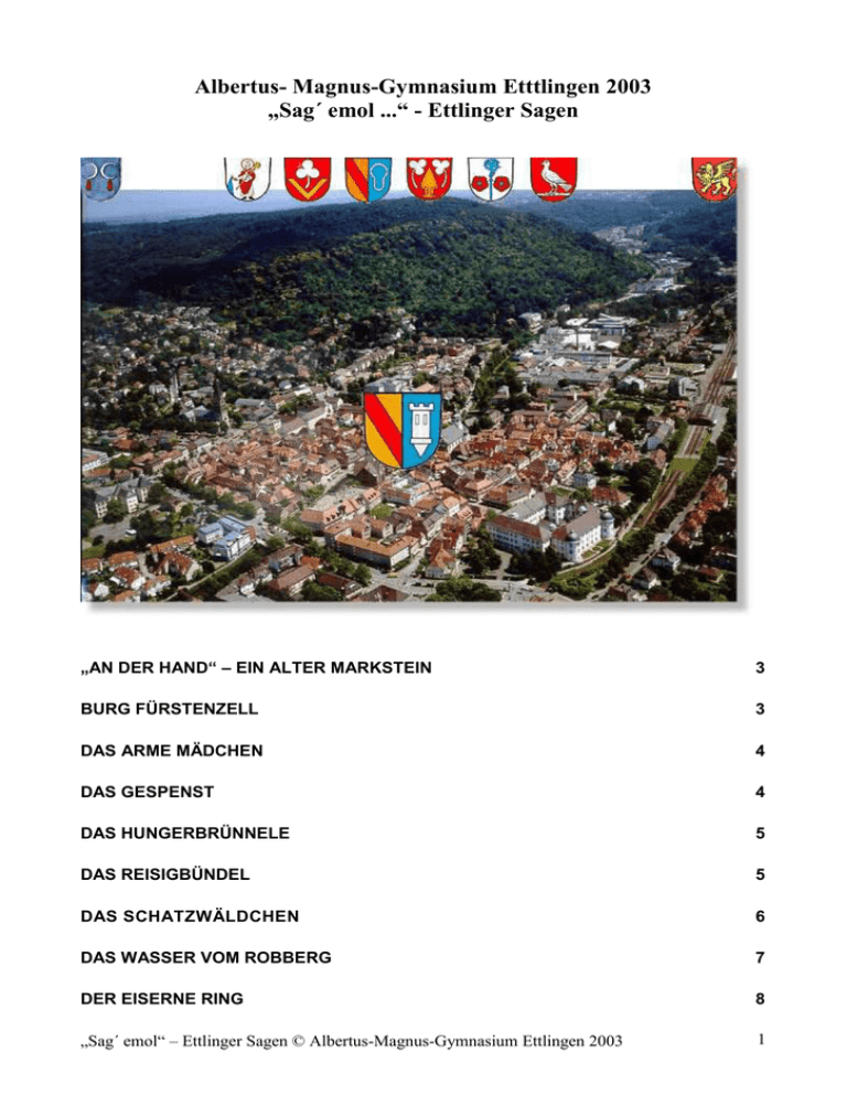 Albertus- Magnus-Gymnasium Etttlingen 2003 „Sag´ emol ...“ - Ettlinger Sagen „AN DER HAND“ – EIN ALTER MARKSTEIN 3 BURG FÜRSTENZELL 3 DAS ARME MÄDCHEN 4 DAS GESPENST 4 DAS HUNGERBRÜNNELE 5 DAS REISIGBÜNDEL 5 DAS SCHATZWÄLDCHEN 6 DAS WASSER VOM ROBBERG 7 DER EISERNE RING 8 „Sag´ emol“ – Ettlinger Sagen © Albertus-Magnus-Gymnasium Ettlingen 2003 1 DER FEUERMANN 8 DER SCHWARZE RATSHERR 9 MITTERNACHTSMESSE 9 DER SPECHTSHART 10 DER TOTE MANN 10 DIE ALTE SCHARFE 11 DIE SCHLÜSSELBLUME 11 SAGEN VOM BURGSTADEL 11 DIE VERHEXTE KUH 14 DIE WEIßE DAME VOM ROBBERG 14 „DOHLENAZE“ 15 DOPPELMORD WEGEN EINES HALBEN KREUZERS 15 GLOCKE GEFUNDEN 15 EINE ETTLINGER SCHWEINEREI 16 DAS SCHRECKLÄUTEN 16 HERRGOTT, GUCK WEG! 17 DIE SCHLUTTENBACHER EICHE 17 DIE SINGERHEXE 17 D´SINGERHEX 18 DIE VERWUNDETE MADONNA 19 WASSER SCHELLEN 20 WER GOTT LÄSTERT 20 ZWERG RIESE 20 „Sag´ emol“ – Ettlinger Sagen © Albertus-Magnus-Gymnasium Ettlingen 2003 2 „An der Hand“ – ein alter Markstein Nördlich von Ettlingen in der Nähe des Friedhofs an der Durlacher Straße steht ein Stein, der einmal ein Wegweiser gewesen sein muss. Im Volksmund wird er „An der Hand“ genannt. Die Anwohner erzählen sich, dass dieser Stein Denkmal eines Mordes sei. Sie begründen ihre Geschichte mit einer Hand, die auf dem Markstein eingemeißelt ist, auf dem die Jahreszahl 1604 und der Ortsname Durlach steht. Woher kommt dieser ungewöhnliche Name des Steins? Alles begann mit zwei diebischen Burschen, die nach der Maiandacht in der Martinskirche sich hinter zwei Säulen versteckten, um nach der Messe das Opfergeld zu stehlen. Bei ihrer Tat wurden sie jedoch von dem Kirchendiener überrascht. Gerade als sie flüchten wollten, verließen glücklicherweise einige Männer das nahe gelegene Gasthaus. Als sie sahen, dass die Diebe den Kirchendiener, der die beiden entdeckt hatte und nun lauthals um Hilfe rief, beiseite gestoßen hatten, rannten sie laut grölend hinter den beiden her. Erst an der Stelle, an der heute der seltsame Markstein steht, konnten die empörten Dorfleute die Diebe stellen. Da einer der beiden sich nicht ergeben wollte, versuchte er in Richtung der Hedwigsquelle zu entwischen. Nach kurzer Verfolgung kam es zu einer Rauferei, bei der dem Flüchtenden, der sich heftig wehrte, die Hand mit einer scharfen Sichel abgeschlagen wurde. Zur Abschreckung von solchen Taten sollen die Ettlinger den Stein „An der Hand“ aufgestellt haben. Burg Fürstenzell Am Südhang des Wattkopfs soll man noch vor wenigen Jahren spärliche Mauerreste gefunden haben. Vielleicht hatten die Römer hier schon ein Kastell? Später erbauten wahrscheinlich Adelsgeschlechter des Albgaus auf den Trümmern des Wartturmes das prächtige Schloss. Man erzählt sich noch heute die Sage der Burg Fürstenzell. Damals, im 13. Jahrhundert, soll der Ritter Kurt von Fürstenzell auf dem Wattkopf gelebt haben, der schloss sich einem Kreuzzug an und ließ seine schöne Frau und seine Töchter zurück. Schon im ersten Kampf fiel der Ritter in Feindeshand und musste schwer als Sklave arbeiten. Nach fünfjähriger Gefangenschaft konnte er eine unverhoffte Gelegenheit zur Flucht erfolgreich nutzen. Verkleidet als Pilger, dachte er nur an seine Familie und wie er wohl durchkommen könnte. Nach beschwerlicher Reise war er nur noch eine halbe Stunde von seiner Burg entfernt, da kam er spät am Abend zu einem Nonnenkloster. Dort verbrachte er die Nacht und eine Magd erkannte in dem Pilger ihren Vater. Sie erzählte ihm die traurige Geschichte vom Schicksal der Familie: Man habe geglaubt, dass der der Ritter tot sei, und Dieter von Malsch habe plötzlich Ansprüche auf die Burg Fürstenzell angemeldet. Die Mutter habe die Mädchen aus Angst vor dem bösen Dieter in diesem Kloster in Sicherheit gebracht. Dort seien sie als Mägde untergekommen. Schließlich sei die Mutter aus lauter Sorge und Gram gestorben. Sicherheitshalber hätten die Nonnen die Namen der Mädchen geändert, um sie zu schützen. Der Vater war tief bestürzt und fing an zu weinen. Aber was konnte er tun? Am nächsten Abend gab der Dieter von Malsch auf Burg Fürstenzell ein prunkvolles Festgelage und alle mächtigen und einflussreichen Leute aus der Umgebung von Ettlingen waren eingeladen. Auch der Ritter Kurt von Fürstenzell begab sich dahin und trat demütig als Pilger gekleidet in die kleine Burgkapelle. Da erblickte ihn ein „Sag´ emol“ – Ettlinger Sagen © Albertus-Magnus-Gymnasium Ettlingen 2003 3 alter Diener, doch er traute seinen Augen nicht, lief voll Angst in den Burghof und erzählte den anderen, der Geist des Ritters von Fürstenzell sei ihm plötzlich in der Burgkapelle erschienen. Die Festgesellschaft strömte aufgeregt zur Kapelle, da trat der alte Ritter gerade aus dem Tor hervor. Dieter von Malsch packte das blanke Entsetzen, er wollte davonlaufen, aber seine Beine wollten ihn nicht tragen, er schwankte, fiel und brach tot zusammen, vom Schlag getroffen. Der fromme Pilger und ehemalige Sklave, jetzt wieder Herr auf Burg Fürstenzell, trat zurück in die Kapelle und dankte Gott und allgemein sprach man in der ganzen Gegend von Ettlingen von einem Gottesgericht. Fortan sollen es die Edlen von Ettlingen und Umgebung mit der Treue etwas genauer genommen haben. Vielleicht kann es deshalb auch heute noch manchen Ettlingern etwas nützen, die Geschichte von Kurt von Fürstenzell zu hören oder zu lesen. Das arme Mädchen Da wohnte in Ettlingen in der Lauergasse einst eine arme, aber brave Familie, die viele Kinder hatte. Der Vater arbeitete fleißig auf dem Felde bei Ettlingenweier. Doch der Acker war nur klein und der Ertrag gering und so hatte die große Familie wenig zu essen. Da sollte nun das älteste Mädchen dem Vater das Mittagessen aufs Feld bringen, aber die Mutter hatte nur noch wenige Erbsen und sonst nichts mehr. Das Mädchen füllte die gekochten Erbsen in ein Schüsselchen und machte sich auf den Weg. Es war noch nicht weit von der Stadt entf