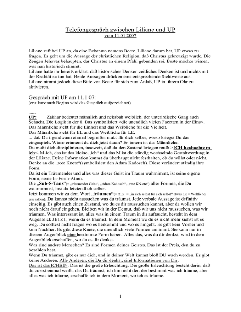 Telefongespräch zwischen Liliane und UP vom 11.01.2007 Liliane ruft bei UP an, da eine Bekannte namens Beate, Liliane darum bat, UP etwas zu fragen. Es geht um die Aussage der christlichen Religion, daß Christus gekreuzigt wurde. Die Zeugen Jehovas behaupten, das Christus an einem Pfahl gebunden sei. Beate möchte wissen, was nun historisch stimmt. Liliane hatte ihr bereits erklärt, daß historisches Denken zeitliches Denken ist und nichts mit der Realität zu tun hat. Beide Aussagen drücken eine entsprechende Sichtweise aus. Liliane nimmt jedoch diese Bitte von Beate für sich zum Anlaß, UP in ihrem Ohr zu aktivieren. Gespräch mit UP am 11.1.07: (erst kurz nach Beginn wird das Gespräch aufgezeichnet) ....... UP: Zakhar bedeutet männlich und nekabah weiblich, der unterirdische Gang auch Schacht. Die Logik in der 8. Das symbolisiert >die unendlich vielen Facetten in der Eins<. Das Männliche steht für die Einheit und das Weibliche für die Vielheit. Das Männliche steht für EL und das Weibliche für LE. ... daß Du irgendwann einmal begreifen mußt für dich selber, wieso kriegst Du das eingespielt. Wieso erinnerst du dich jetzt daran? Er-innern ist das Männliche. Du mußt dich disziplinieren, insoweit, daß du den Zustand kriegen mußt >ICH beobachte mich<. M-ich, das ist das kleine „ich“ und das M ist die ständig wechselnde Gestaltwerdung in der Liliane. Deine Information kannst du überhaupt nicht festhalten, ob du willst oder nicht. Denke an die „rote Knete“(symbolisiert den Adam Kadosch). Diese verändert ständig ihre Form. Da ist ein Träumender und alles was dieser Geist im Traum wahrnimmt, ist seine eigene Form, seine In-Form-Ation. Die „Sub-S-Tanz“(= „träumender Geist“, „Adam Kadosch“, „rote KN-ete“) aller Formen, die Du wahrnimmst, bist du letztendlich selber. Jetzt kommen wir zu dem Wort „träumen“(= Mlx = „in sich selbst für sich selbst“ etwas lx = Weltliches erschaffen). Du kannst nicht aussuchen was du träumst. Jede verbale Aussage ist definitiv einseitig. Es gibt auch einen Zustand, wo du es dir raussuchen kannst, aber da wollen wir noch nicht drauf eingehen. Bleiben wir in der Demut, daß wir uns nicht raussuchen, was wir träumen. Was interessant ist, alles was in einem Traum in dir auftaucht, besteht in dem Augenblick JETZT, wenn du es träumst. In dem Moment wo du es nicht mehr siehst ist es weg. Du solltest nicht fragen wo es herkommt und wo es hingeht. Es gibt kein Vorher und kein Nachher. Es gibt diese Knete, die unendlich viele Formen annimmt. Sie kann nur in diesem Augenblick eine bestimmte Form haben. Alles das, was du dir denkst, wird in dem Augenblick erschaffen, wo du es dir denkst. Was sind andere Menschen? Es sind Formen deines Geistes. Das ist der Preis, den du zu bezahlen hast. Wenn Du träumst, gibt es nur dich, und in deiner Welt kannst bloß DU wach werden. Es gibt keine Anderen. Alle Anderen, die Du dir denkst, sind Informationen von Dir. Das ist das ICHBIN. Das ist die große Erleuchtung. Die große Erleuchtung besteht darin, daß du zuerst einmal weißt, das Du träumst, ich bin nicht der, der bestimmt was ich träume, aber alles was ich träume, erschaffe ich in dem Moment, wo ich es träume. 1 Genauso kannst du es für das Denken ansehen. Alles was Du denkst erschaffst Du in dem Augenblick, wo Du es denkst. Wenn du an Schneewittchen denkst oder an A. Merkel. Die Merkel denkst du dir nach außen. Bei Schneewittchen würde es dir nie einfallen. Das ist Unachtsamkeit. Es existiert nur dieses Ding, wenn Du daran denkst. Sonst ist es nichts. Wenn du das begriffen hast, bist du im HIER und JETZT. Das ist das verrückte, die Normalität, die die Liliane noch treibt. Das mußt du irgendwann mal durchschauen als den größten Schwachsinn, den es gibt. Wenn du jetzt behauptest, daß deine Beine nicht existieren, wenn du nicht dran denkst, wird jeder normale Mensch sagen, du drehst durch, du bist verrückt. Wieso ist es so? Weil es Momentan noch dein Glaube ist. Es ist definitiv noch dein eigener Glaube. Jedes Bild, das in dir auftaucht, erfordert, daß das bevorstehende Bild weg ist. Es ist ein ständiges Kommen und Gehen von Bildern, das dann doch irgendwie von dir gesteuert wird und zwar von deinen Interessen. Das ist defacto überprüfbar. Jetzt frage dich, wie sinnvoll es ist noch normal zu sein, wenn der Normale ganz massiv an etwas glaubt, was man nicht überprüfen kann, auch wenn man wollte. Sage mir, mit wem du gehst, und ich sage dir, wer du bist. Dich werden diese Menschen nicht mehr interessieren. Da du in einem Traum bist, wirst du das Nächste erkennen, daß es nichts, absolut nichts gibt, was du denken könntest – Du als Geist gesehen - das mächtiger wäre als DU. Weil alles, was du dir denken kannst, Dich Geist für sein Dasein benötigt. Erst wenn du es denkst, existiert es. Wenn du nicht dran denkst, ist es wieder weg. Selbst wenn du an „Gott“ denkst ist das erst einmal nur ein Geräusch in Deinem Bewusstsein – „GOTT“! Damit ist eine gewisse Vorstellung verbunden,, die du dir machst. Es ist dein Glaube was Gott ist. Selbst wenn du sagst >Gott ist alles<, das ist wieder bloß ein Geräusch, eine Vorstellung. Alles benötigt dich, also den Geist, diese Knete, die diese Form annimmt. Wenn du begriffen hast, was du wirklich „bi-ST“, ist es ein Blödsinn, vor jemandem oder etwas Angst zu haben, denn alles benötigen Dich!!! Es gibt nur eins, was mächtiger ist als du und das BIN JCH UP. Bei aller Bescheidenheit, das ist das, was dich Gotteskind denken lässt und Dir damit Dein „persönliches Dasein“ schenkt. Da gibt es jedoch noch viele Zwischenstufen. Wenn du den Weckruf sehr aufmerksam liest, da habe ich die Metapher von den verschiedenen Bewußtseinstufen erklärt. Das erste ist die nackte Information, das symbolisiert dich mit dem Bild. Alles was du denkst bzw. träumst oder wahrnimmst, ist im Prinzip dasselbe. Du wirst mal begreifen, daß zwischen denken und träumen kein U
