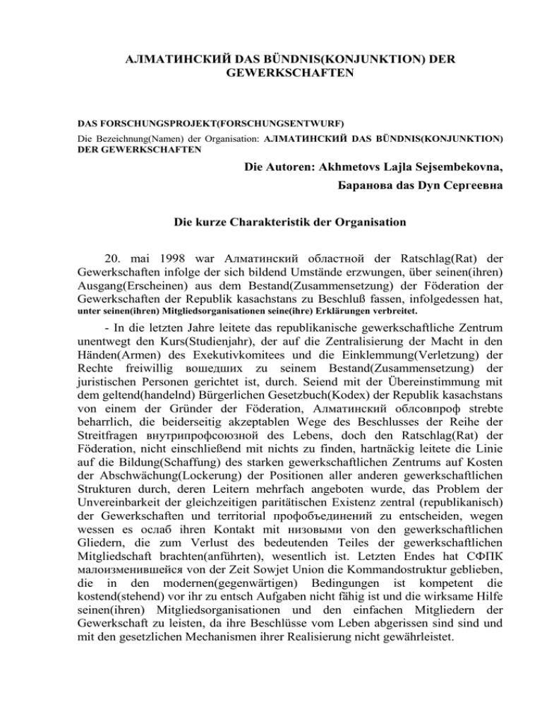 АЛМАТИНСКИЙ DAS BÜNDNIS(KONJUNKTION) DER GEWERKSCHAFTEN DAS FORSCHUNGSPROJEKT(FORSCHUNGSENTWURF) Die Bezeichnung(Namen) der Organisation: АЛМАТИНСКИЙ DAS BÜNDNIS(KONJUNKTION) DER GEWERKSCHAFTEN Die Autoren: Akhmetovs Lajla Sejsembekovna, Баранова das Dyn Сергеевна Die kurze Charakteristik der Organisation 20. mai 1998 war Алматинский областной der Ratschlag(Rat) der Gewerkschaften infolge der sich bildend Umstände erzwungen, über seinen(ihren) Ausgang(Erscheinen) aus dem Bestand(Zusammensetzung) der Föderation der Gewerkschaften der Republik kasachstans zu Beschluß fassen, infolgedessen hat, unter seinen(ihren) Mitgliedsorganisationen seine(ihre) Erklärungen verbreitet. - In die letzten Jahre leitete das republikanische gewerkschaftliche Zentrum unentwegt den Kurs(Studienjahr), der auf die Zentralisierung der Macht in den Händen(Armen) des Exekutivkomitees und die Einklemmung(Verletzung) der Rechte freiwillig вошедших zu seinem Bestand(Zusammensetzung) der juristischen Personen gerichtet ist, durch. Seiend mit der Übereinstimmung mit dem geltend(handelnd) Bürgerlichen Gesetzbuch(Kodex) der Republik kasachstans von einem der Gründer der Föderation, Алматинский облсовпроф strebte beharrlich, die beiderseitig akzeptablen Wege des Beschlusses der Reihe der Streitfragen внутрипрофсоюзной des Lebens, doch den Ratschlag(Rat) der Föderation, nicht einschließend mit nichts zu finden, hartnäckig leitete die Linie auf die Bildung(Schaffung) des starken gewerkschaftlichen Zentrums auf Kosten der Abschwächung(Lockerung) der Positionen aller anderen gewerkschaftlichen Strukturen durch, deren Leitern mehrfach angeboten wurde, das Problem der Unvereinbarkeit der gleichzeitigen paritätischen Existenz zentral (republikanisch) der Gewerkschaften und territorial профобъединений zu entscheiden, wegen wessen es ослаб ihren Kontakt mit низовыми von den gewerkschaftlichen Gliedern, die zum Verlust des bedeutenden Teiles der gewerkschaftlichen Mitgliedschaft brachten(anführten), wesentlich ist. Letzten Endes hat СФПК малоизменившейся von der Zeit Sowjet Union die Kommandostruktur geblieben, die in den modernen(gegenwärtigen) Bedingungen ist kompetent die kostend(stehend) vor ihr zu entsch Aufgaben nicht fähig ist und die wirksame Hilfe seinen(ihren) Mitgliedsorganisationen und den einfachen Mitgliedern der Gewerkschaft zu leisten, da ihre Beschlüsse vom Leben abgerissen sind sind und mit den gesetzlichen Mechanismen ihrer Realisierung nicht gewährleistet. Inzwischen zeigt, die Reihe in der Republik übernommenen kasachstans der Gesetze, die auf die Übersetzung der Wirtschaft(Ökonomie) auf die Marktbeziehungen gerichtet sind auf, dass gerade in dieser Richtung die neuen planmäßigen Systeme der wirtschaftlichen und öffentlichen Beziehungen gebildet werden. Der Staat allen sagt sich vom zentralisierten sich beseitigend Modell der Verwaltung(Steuerung), übergebend den bedeutenden Teil seiner(ihrer) Funktionen den Regionen aktiver los. Unser облсовпроф meinte, dass sich geschaffen 1,5 Jahre rückwärts um seiner Teilnahme das Bündnis(Konjunktion) (die Föderation der Gewerkschaften der Republik kasachstans) damit und lernen(beschäftigen) wird, d.h. seinen Mitgliedern(Gliedern) im Beschluss der wichtigsten sozialen Probleme zu helfen. In der Praxis die Führung(Anleitung) СФПК auf anderen Weg – der Weg der Abschwächung(Lockerung) der Positionen seiner(ihrer) Gründer und der Unterdrückung jeden von ihrer Seite des Andersdenkens, nicht wünschend, zu verstehen, dass die harte(starke) gewerkschaftliche Vertikale, die auf den vorigen Prinzipien des demokratischen Zentralismus gegründet ist, in die Rahmen des neuen Bürgerlichen Gesetzbuches(Kodexes) der Republik kasachstans schon nicht eingeschrieben wird und kann(darf) in die allernächste Zeit ist рухнуть einfach, und auch, dass in den Marktbedingungen sind nur die beiderseitig vereinbarten Beschlüsse ausführbar, die von allen Subjekten der Föderation unterstützt sind. Doch freiwillig vereinigt worden in das Bündnis(Konjunktion), die juristischen Personen (die Gewerkschaften und die territorialen Vereinigungen) делегируют der von ihnen geschaffenen Struktur nur den Teil seiner(ihrer) funktionalen Rechte. Dieses Prinzip ist und in der geltend(handelnd) Gesetzgebung der Republik kasachstans fixiert, der nur einen Weg der Regulierung der Wechselbeziehungen der juristischen Personen aller Arten(Gestalten), die sich die vertragsmäßige Grundlage mit der Bestimmung der Ziele(Zweckes) stützen, der Formen und der Bedingungen der gemeinsamen Arbeit vorsieht. Die Notwendigkeit unseres Bruches mit СФПК ist auch aus anderen Gründen herangereift. Zugeteilt die Hauptaufmerksamkeit seicht(klein) внутрисоюзным den Problemen, hat der Ratschlag(Rat) der Föderation bedeutend seine(ihre) Einwirkung auf den Lauf(Gang) der nach dem Land geleiteten Reformen, die die sozial-ökonomische Lage der Arbeiter des gemieteten Werkes(Arbeit) verschlimmern, der Rentner und der Kinder geschwächt. Gleichzeitig verwirklichte die Regierung der Republik aufeinanderfolgend die Politik der Kürzung der Kosten(Aufwände) auf die sozialen Bedürfnisse und hat nach der Annahme vom Parlament solcher Gesetze der Republik kasachstans wie Das bürgerliche Gesetzbuch(Kodex), « Über die obligatorische medizinische Versicherung », « Über die Renternversorgung » erreicht, die die Rolle und die Möglichkeit der Gewerkschaften auf der rechtlichen Grundlage stark geschwächt haben, die Interessen seiner(ihrer) Mitglieder(Glieder) zu schützen, und auch haben der speziellen die ganze Reihe arbeitend Ermäßigungen(Privilegien) entzogen. Während einiger Jahre versucht der Ratschlag(Rat) der Föderation, in das Gesetz der Republik kasachstans « Über die Kollektivverträge »