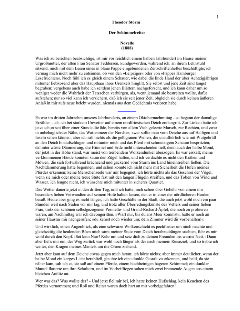 1 Theodor Storm Der Schimmelreiter Novelle (1888) Was ich zu berichten beabsichtige, ist mir vor reichlich einem halben Jahrhundert im Hause meiner Urgroßmutter, der alten Frau Senator Feddersen, kundgeworden, während ich, an ihrem Lehnstuhl sitzend, mich mit dem Lesen eines in blaue Pappe eingebundenen Zeitschriftenheftes beschäftigte; ich vermag mich nicht mehr zu entsinnen, ob von den »Leipziger« oder von »Pappes Hamburger Lesefrüchten«. Noch fühl ich es gleich einem Schauer, wie dabei die linde Hand der über Achtzigjährigen mitunter liebkosend über das Haupthaar ihres Urenkels hinglitt. Sie selbst und jene Zeit sind längst begraben; vergebens auch habe ich seitdem jenen Blättern nachgeforscht, und ich kann daher um so weniger weder die Wahrheit der Tatsachen verbürgen, als, wenn jemand sie bestreiten wollte, dafür aufstehen; nur so viel kann ich versichern, daß ich sie seit jener Zeit, obgleich sie durch keinen äußeren Anlaß in mir aufs neue belebt wurden, niemals aus dem Gedächtnis verloren habe. Es war im dritten Jahrzehnt unseres Jahrhunderts, an einem Oktobernachmittag - so begann der damalige Erzähler -, als ich bei starkem Unwetter auf einem nordfriesischen Deich entlangritt. Zur Linken hatte ich jetzt schon seit über einer Stunde die öde, bereits von allem Vieh geleerte Marsch, zur Rechten, und zwar in unbehaglichster Nähe, das Wattenmeer der Nordsee; zwar sollte man vom Deiche aus auf Halligen und Inseln sehen können; aber ich sah nichts als die gelbgrauen Wellen, die unaufhörlich wie mit Wutgebrüll an den Deich hinaufschlugen und mitunter mich und das Pferd mit schmutzigem Schaum bespritzten; dahinter wüste Dämmerung, die Himmel und Erde nicht unterscheiden ließ; denn auch der halbe Mond, der jetzt in der Höhe stand, war meist von treibendem Wolkendunkel überzogen. Es war eiskalt; meine verklommenen Hände konnten kaum den Zügel halten, und ich verdachte es nicht den Krähen und Möwen, die sich fortwährend krächzend und gackernd vom Sturm ins Land hineintreiben ließen. Die Nachtdämmerung hatte begonnen, und schon konnte ich nicht mehr mit Sicherheit die Hufen meines Pferdes erkennen; keine Menschenseele war mir begegnet, ich hörte nichts als das Geschrei der Vögel, wenn sie mich oder meine treue Stute fast mit den langen Flügeln streiften, und das Toben von Wind und Wasser. Ich leugne nicht, ich wünschte mich mitunter in sicheres Quartier. Das Wetter dauerte jetzt in den dritten Tag, und ich hatte mich schon über Gebühr von einem mir besonders lieben Verwandten auf seinem Hofe halten lassen, den er in einer der nördlicheren Harden besaß. Heute aber ging es nicht länger; ich hatte Geschäfte in der Stadt, die auch jetzt wohl noch ein paar Stunden weit nach Süden vor mir lag, und trotz aller Überredungskünste des Vetters und seiner lieben Frau, trotz der schönen selbstgezogenen Perinette- und Grand-Richard-Äpfel, die noch zu probieren waren, am Nachmittag war ich davongeritten. »Wart nur, bis du ans Meer kommst«, hatte er noch an seiner Haustür mir nachgerufen; »du kehrst noch wieder um; dein Zimmer wird dir vorbehalten!« Und wirklich, einen Augenblick, als eine schwarze Wolkenschicht es pechfinster um mich machte und gleichzeitig die heulenden Böen mich samt meiner Stute vom Deich herabzudrängen suchten, fuhr es mir wohl durch den Kopf. ›Sei kein Narr! Kehr um und setz dich zu deinen Freunden ins warme Nest.‹ Dann aber fiel's mir ein, der Weg zurück war wohl noch länger als der nach meinem Reiseziel; und so trabte ich weiter, den Kragen meines Mantels um die Ohren ziehend. Jetzt aber kam auf dem Deiche etwas gegen mich heran; ich hörte nichts; aber immer deutlicher, wenn der halbe Mond ein karges Licht herabließ, glaubte ich eine dunkle Gestalt zu erkennen, und bald, da sie näher kam, sah ich es, sie saß auf einem Pferde, einem hochbeinigen hageren Schimmel; ein dunkler Mantel flatterte um ihre Schultern, und im Vorbeifliegen sahen mich zwei brennende Augen aus einem bleichen Antlitz an. Wer war das? Was wollte der? - Und jetzt fiel mir bei, ich hatte keinen Hufschlag, kein Keuchen des Pferdes vernommen; und Roß und Reiter waren doch hart an mir vorbeigefahren! 2 In Gedanken darüber ritt ich weiter, aber ich hatte nicht lange Zeit zum Denken, schon fuhr es von rückwärts wieder an mir vorbei; mir war, als streifte mich der fliegende Mantel, und die Erscheinung war, wie das erste Mal, lautlos an mir vorübergestoben. Dann sah ich sie fern und ferner vor mir; dann war's, als säh ich plötzlich ihren Schatten an der Binnenseite des Deiches hinuntergehen. Etwas zögernd ritt ich hintendrein. Als ich jene Stelle erreicht hatte, sah ich hart am Deich im Kooge unten das Wasser einer großen Wehle blinken - so nennen sie dort die Brüche, welche von den Sturmfluten in das Land gerissen werden und die dann meist als kleine, aber tiefgründige Teiche stehen bleiben. Das Wasser war, trotz des schützenden Deiches, auffallend bewegt; der Reiter konnte es nicht getrübt haben; ich sah nichts weiter von ihm. Aber ein anderes sah ich, das ich mit Freuden jetzt begrüßte: vor mir, von unten aus dem Kooge, schimmerten eine Menge zerstreuter Lichtscheine zu mir herauf, sie schienen aus jenen langgestreckten friesischen Häusern zu kommen, die vereinzelt auf mehr oder minder hohen Werften lagen, dicht vor mir aber auf halber Höhe des Binnendeiches lag ein großes Haus derselben Art; an der Südseite, rechts von der Haustür, sah ich alle Fenster erleuchtet; dahinter gewahrte ich Menschen und glaubte trotz des Sturmes sie zu hören. Mein Pferd war schon von selbst auf den Weg am Deich hinabgeschritten, der mich vor die Tür des Hauses führte. Ich sah wohl, daß es ein Wirtshaus war; denn vor den Fenstern gewahrte ich die sogenannten »Ricks«, das heißt auf zwei Ständern ruhende Balken mit großen eisernen Ringen, zum Anbinden des Viehes und der Pferde, die hier haltmachten. Ich band das meine an einen derselben und 