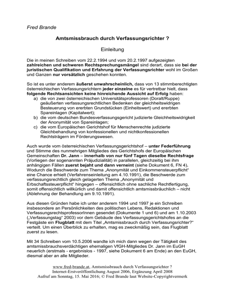 Fred Brande Amtsmissbrauch durch Verfassungsrichter ? Einleitung Die in meinen Schreiben vom 22.2.1994 und vom 20.2.1997 aufgezeigten zahlreichen und schweren Rechtsprechungsmängel sind derart, dass sie bei der juristischen Qualifikation und Erfahrung der Verfassungsrichter wohl im Großen und Ganzen nur vorsätzlich geschehen konnten. So ist es unter anderem äußerst unwahrscheinlich, dass von 13 stimmberechtigten österreichischen Verfassungsrichtern jeder einzelne es für vertretbar hielt, dass folgende Rechtsansichten keine hinreichende Aussicht auf Erfolg haben: a) die von zwei österreichischen Universitätsprofessoren (Doralt/Ruppe) geäußerten verfassungsrechtlichen Bedenken der gleichheitswidrigen Besteuerung von ererbten Grundstücken (Einheitswert) und ererbten Spareinlagen (Kapitalwert); b) die vom deutschen Bundesverfassungsgericht judizierte Gleichheitswidrigkeit der Anonymität von Spareinlagen; c) die vom Europäischen Gerichtshof für Menschenrechte judizierte Gleichbehandlung von konfessionellen und nichtkonfessionellen Rechtsträgern im Förderungswesen. Auch wurde vom österreichischen Verfassungsgerichtshof – unter Federführung und Stimme des nunmehrigen Mitgliedes des Gerichtshofs der Europäischen Gemeinschaften Dr. Jann – innerhalb von nur fünf Tagen dieselbe Rechtsfrage (Vorliegen der sogenannten Präjudizialität) in parallelen, gleichzeitig bei ihm anhängigen Fällen zuerst bejaht und dann verneint (siehe Dokument 6, FN 4). Wodurch die Beschwerde zum Thema „Anonymität und Einkommensteuerpflicht“ eine Chance erhielt (Verfahrenseinleitung am 4.10.1991), die Beschwerde zum verfassungsrechtlich gleich gelagerten Thema „Anonymität und Erbschaftssteuerpflicht“ hingegen – offensichtlich ohne sachliche Rechtfertigung, somit offensichtlich willkürlich und damit offensichtlich amtsmissbräuchlich – nicht (Ablehnung der Behandlung am 9.10.1991). Aus diesen Gründen habe ich unter anderem 1994 und 1997 je ein Schreiben insbesondere an Persönlichkeiten des politischen Lebens, Redaktionen und VerfassungsrechtsprofessorInnen gesendet (Dokumente 1 und 6) und am 1.10.2003 („Verfassungstag“ 2003) vor dem Gebäude des Verfassungsgerichtshofes an die Festgäste ein Flugblatt mit dem Titel „Amtsmissbrauch durch Verfassungsrichter?“ verteilt. Um einen Überblick zu erhalten, mag es zweckmäßig sein, das Flugblatt zuerst zu lesen. Mit 34 Schreiben vom 10.5.2006 wandte ich mich dann wegen der Tätigkeit des amtsmissbrauchsverdächtigen ehemaligen VfGH-Mitgliedes Dr. Jann im EuGH neuerlich (erstmals - ergebnislos - 1997, siehe Dokument 6 am Ende) an den EuGH, diesmal aber an alle Mitglieder. www.fred-brande.at, Amtsmissbrauch durch Verfassungsrichter ? Internet-Erstveröffentlichung August 2006, Ergänzung April 2008 Aufruf am Sonntag, 15. Mai 2016; © Fred Brande laut Website-Copyrightvermerk 2 Die Schreiben wurden mir zurückgesendet, zunächst von der EuGH-Kanzlei und dann von der EuGH-Kanzlei im Auftrag von Präsident Vassilios Skouris. (Ich hatte das Schreiben an jedes einzelne EuGH-Mitglied in einem separaten Kuvert adressiert, die Kuverts aber aus Kostengründen gemeinsam versendet.) Ein drittes Mal habe ich die Briefe dann (Postaufgabe 14.6.2006) einzeln eingeschrieben gesendet (nicht mehr gesendet die Briefe an Präsident Skouris und Kanzler Grass), aber keine einzige Empfangsbestätigung erhalten. Ich vermutete daher, dass auch die einzeln gesendeten Briefe im Auftrag von Präsident Skouris von der EuGH-Kanzlei zurückgehalten wurden, und sandte 24 Briefe an Ersatz-Adressen (letzte Postaufgabe 12.7.2006). Mit Stand 29.8.2006 waren fünf dieser Briefe als unzustellbar zurückgekommen. Die dargelegte Nicht-Weiterleitung der Briefe an die einzelnen EuGH-Mitglieder würde nach österreichischem Recht den Verdacht der Unterdrückung von Briefen gemäß § 118 Abs 3 Strafgesetzbuch begründen. Sie wäre gemäß § 118 Abs 4 in Verbindung mit § 74 Abs 1 Z 4b Strafgesetzbuch ein sogenanntes Ermächtigungsdelikt. Diese Einleitung abschließend darf ich darauf hinweisen, dass die österreichische Bundesverfassung vom 1. Oktober 1920 zu keiner Zeit für irgend ein Staatsorgan oder Mitglied eines solchen eine Bestimmung kannte, die der ersten oder dritten Feststellung des im Rahmen der österreichischen Dezemberverfassung 1867 erlassenen Artikels 1 des Staatsgrundgesetzes vom 21.12.1867 RGBl 145 über die Ausübung der Regierungs- und der Vollzugsgewalt entspräche, welche Bestimmung lautete: „Der Kaiser ist geheiligt, unverletzlich und unverantwortlich.“ www.fred-brande.at, Amtsmissbrauch durch Verfassungsrichter ? Internet-Erstveröffentlichung August 2006, Ergänzung April 2008 Aufruf am Sonntag, 15. Mai 2016; © Fred Brande laut Website-Copyrightvermerk 3 Inhaltsverzeichnis Einleitung …………………………………………………………………….………… Seite 1 Dokument 1: Mein Schreiben vom 22. Feber 1994 an alle Mitglieder des Verfassungsgerichtshofes ………………………………………………………………. Seite 4 Dokument 2: Antwort der Generalsekretärin des Verfassungsgerichtshofes vom 7. März 1994 ……………………………………………………………………………….………… Seite 13 Dokument 3: Mein Schreiben vom 28. März 1994 insbesondere an Persönlichkeiten des politischen Lebens, Redaktionen und VerfassungsrechtsprofessorInnen …………….. Seite 13 Dokument 4: Antwort von NR-Präs Dr. Heinz Fischer vom 13. Juli 1994 …………... Seite 14 Dokument 5: Meine Rückantwort vom 23. November 1994 …………………………. Seite 15 Dokument 6: Mein (ergänzendes) Schreiben vom 20. Feber 1997 an die Familienredaktionen aller bedeutenden österreichischen Tages- und Wochenzeitungen …………………… Seite 17 Dokument 7: Graphische Darstellung zu meiner VfGH-Beschwerde B 4669/96 vom 14. November 1996 betreffend Erziehungsgeld ……….…………………