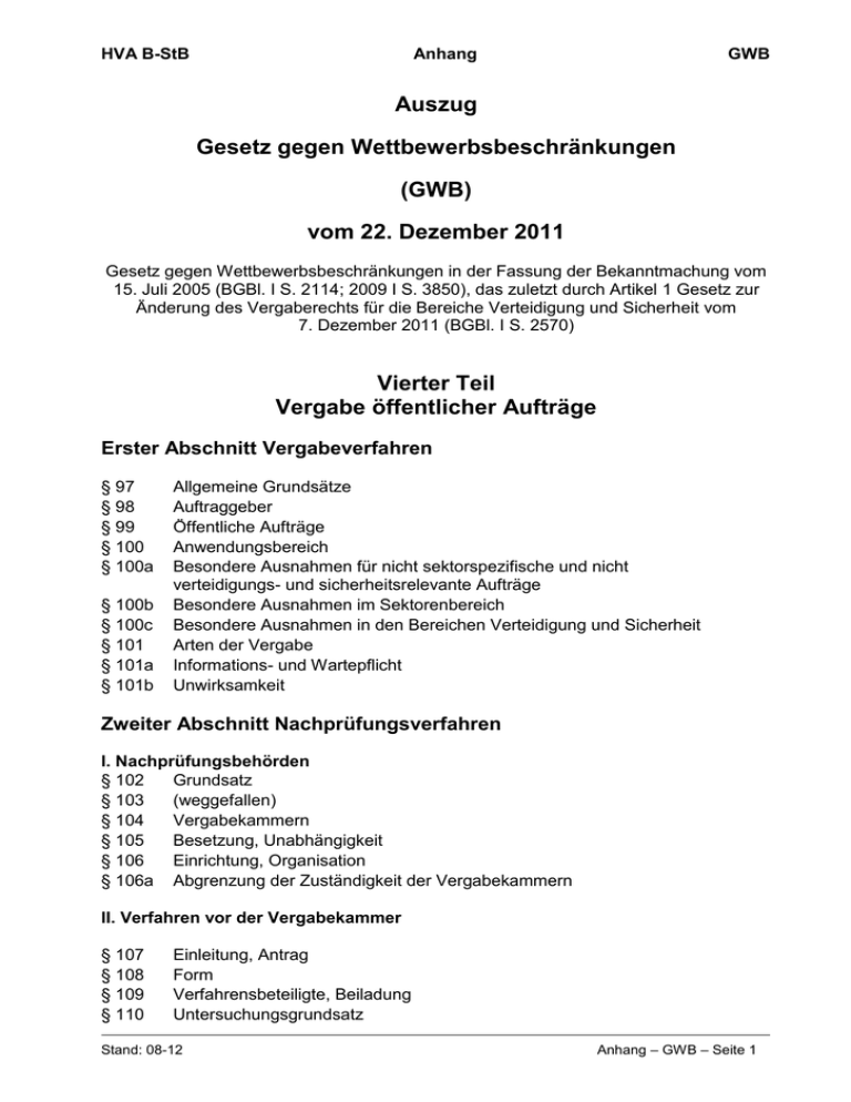 HVA B-StB Anhang GWB Auszug Gesetz gegen Wettbewerbsbeschränkungen (GWB) vom 22. Dezember 2011 Gesetz gegen Wettbewerbsbeschränkungen in der Fassung der Bekanntmachung vom 15. Juli 2005 (BGBl. I S. 2114; 2009 I S. 3850), das zuletzt durch Artikel 1 Gesetz zur Änderung des Vergaberechts für die Bereiche Verteidigung und Sicherheit vom 7. Dezember 2011 (BGBl. I S. 2570) Vierter Teil Vergabe öffentlicher Aufträge Erster Abschnitt Vergabeverfahren § 97 § 98 § 99 § 100 § 100a § 100b § 100c § 101 § 101a § 101b Allgemeine Grundsätze Auftraggeber Öffentliche Aufträge Anwendungsbereich Besondere Ausnahmen für nicht sektorspezifische und nicht verteidigungs- und sicherheitsrelevante Aufträge Besondere Ausnahmen im Sektorenbereich Besondere Ausnahmen in den Bereichen Verteidigung und Sicherheit Arten der Vergabe Informations- und Wartepflicht Unwirksamkeit Zweiter Abschnitt Nachprüfungsverfahren I. Nachprüfungsbehörden § 102 Grundsatz § 103 (weggefallen) § 104 Vergabekammern § 105 Besetzung, Unabhängigkeit § 106 Einrichtung, Organisation § 106a Abgrenzung der Zuständigkeit der Vergabekammern II. Verfahren vor der Vergabekammer § 107 § 108 § 109 § 110 Einleitung, Antrag Form Verfahrensbeteiligte, Beiladung Untersuchungsgrundsatz Stand: 08-12 Anhang – GWB – Seite 1 HVA B-StB § 110a § 111 § 112 § 113 § 114 § 115 § 115a Anhang GWB Aufbewahrung vertraulicher Unterlagen Akteneinsicht Mündliche Verhandlung Beschleunigung Entscheidung der Vergabekammer Aussetzung des Vergabeverfahrens Ausschluss von abweichendem Landesrecht III. Sofortige Beschwerde § 116 § 117 § 118 § 119 § 120 § 121 § 122 § 123 § 124 Zulässigkeit, Zuständigkeit Frist, Form Wirkung Beteiligte am Beschwerdeverfahren Verfahrensvorschriften Vorabentscheidung über den Zuschlag Ende des Vergabeverfahrens nach Entscheidung des Beschwerdegerichts Beschwerdeentscheidung Bindungswirkung und Vorlagepflicht Dritter Abschnitt Sonstige Regelungen § 125 § 126 § 127 § 127a § 128 § 129 § 129a § 129b Schadensersatz bei Rechtsmissbrauch Anspruch auf Ersatz des Vertrauensschadens Ermächtigungen Kosten für Gutachten und Stellungnahmen nach der Sektorenverordnung, Verordnungsermächtigung Kosten des Verfahrens vor der Vergabekammer Korrekturmechanismus der Kommission Unterrichtungspflichten der Nachprüfungsinstanzen Regelung für Auftraggeber nach dem Bundesberggesetz Fünfter Teil Anwendungsbereich des Gesetzes § 130 Unternehmen der öffentlichen Hand, Geltungsbereich Sechster Teil Übergangs- und Schlussbestimmungen § 131 Übergangsbestimmungen Anlage (zu § 98 Nr. 4) Stand: 08-12 Anhang – GWB – Seite 2 HVA B-StB Vierter Teil Vergabe öffentlicher Aufträge Erster Abschnitt: Vergabeverfahren § 97 Allgemeine Grundsätze (1) Öffentliche Auftraggeber beschaffen Waren, Bau- und Dienstleistungen nach Maßgabe der folgenden Vorschriften im Wettbewerb und im Wege transparenter Vergabeverfahren. (2) Die Teilnehmer an einem Vergabeverfahren sind gleich zu behandeln, es sei denn, eine Benachteiligung ist auf Grund dieses Gesetzes ausdrücklich geboten oder gestattet. (3) Mittelständische Interessen sind bei der Vergabe öffentlicher Aufträge vornehmlich zu berücksichtigen. Leistungen sind in der Menge aufgeteilt (Teillose) und getrennt nach Art oder Fachgebiet (Fachlose) zu vergeben. Mehrere Teil- oder Fachlose dürfen zusammen vergeben werden, wenn wirtschaftliche oder technische Gründe dies erfordern. Wird ein Unternehmen, das nicht öffentlicher Auftraggeber ist, mit der Wahrnehmung oder Durchführung einer öffentlichen Aufgabe betraut, verpflichtet der Auftraggeber das Unternehmen, sofern es Unteraufträge an Dritte vergibt, nach den Sätzen 1 bis 3 zu verfahren. (4) Aufträge werden an fachkundige, leistungsfähige sowie gesetzestreue und zuverlässige Unternehmen vergeben. Für die Auftragsausführung können zusätzliche Anforderungen an Auftragnehmer gestellt werden, die insbesondere soziale, umweltbezogene oder innovative Aspekte betreffen, wenn sie im sachlichen Zusammenhang mit dem Auftragsgegenstand stehen und sich aus der Leistungsbeschreibung ergeben. Andere oder weitergehende Anforderungen dürfen an Auftragnehmer nur gestellt werden, wenn dies durch Bundes- oder Landesgesetz vorgesehen ist. Stand: 08-12 Anhang GWB (4a) Auftraggeber können Präqualifikationssysteme einrichten oder zulassen, mit denen die Eignung von Unternehmen nachgewiesen werden kann. (5) Der Zuschlag wird auf schaftlichste Angebot erteilt. das wirt- (6) Die Bundesregierung wird ermächtigt, durch Rechtsverordnung mit Zustimmung des Bundesrates nähere Bestimmungen über das bei der Vergabe einzuhaltende Verfahren zu treffen, insbesondere über die Bekanntmachung, den Ablauf und die Arten der Vergabe, über die Auswahl und Prüfung der Unternehmen und Angebote, über den Abschluss des Vertrages und sonstige Fragen des Vergabeverfahrens. (7) Die Unternehmen haben Anspruch darauf, dass der Auftraggeber die Bestimmungen über das Vergabeverfahren einhält. § 98 Auftraggeber Öffentliche Auftraggeber im Sinne dieses Teils sind: 1. Gebietskörperschaften sowie deren Sondervermögen, 2. andere juristische Personen des öffentlichen und des privaten Rechts, die zu dem besonderen Zweck gegründet wurden, im Allgemeininteresse liegende Aufgaben nichtgewerblicher Art zu erfüllen, wenn Stellen, die unter Nummer 1 oder 3 fallen, sie einzeln oder gemeinsam durch Beteiligung oder auf sonstige Weise überwiegend finanzieren oder über ihre Leitung die Aufsicht ausüben oder mehr als die Hälfte der Mitglieder eines ihrer zur Geschäftsführung oder zur Aufsicht berufenen Organe bestimmt haben. Das Gleiche gilt dann, wenn die Stelle, die einzeln oder gemeinsam mit anderen die überwiegende Finanzierung gewährt oder die Mehrheit der Mitglieder eines zur Geschäftsführung oder Aufsicht berufenen Organs bestimmt hat, unter Satz 1 fällt, Anhang – GWB – Seite 3 HVA B-StB 3. Verbände, deren Mitglieder unter Numm
