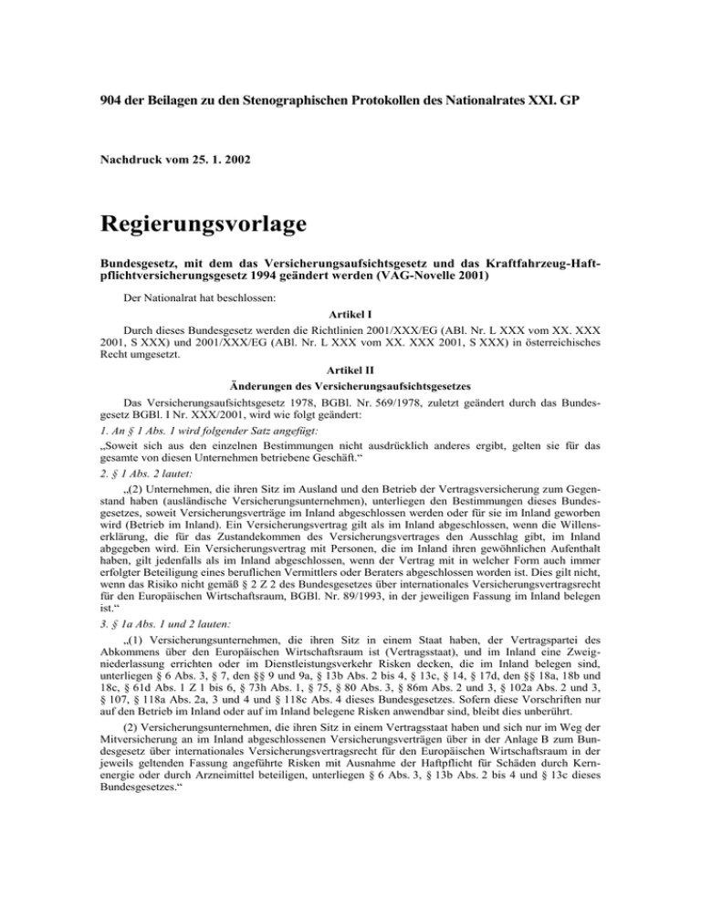 904 der Beilagen zu den Stenographischen Protokollen des Nationalrates XXI. GP Nachdruck vom 25. 1. 2002 Regierungsvorlage Bundesgesetz, mit dem das Versicherungsaufsichtsgesetz und das Kraftfahrzeug-Haftpflichtversicherungsgesetz 1994 geändert werden (VAG-Novelle 2001) Der Nationalrat hat beschlossen: Artikel I Durch dieses Bundesgesetz werden die Richtlinien 2001/XXX/EG (ABl. Nr. L XXX vom XX. XXX 2001, S XXX) und 2001/XXX/EG (ABl. Nr. L XXX vom XX. XXX 2001, S XXX) in österreichisches Recht umgesetzt. Artikel II Änderungen des Versicherungsaufsichtsgesetzes Das Versicherungsaufsichtsgesetz 1978, BGBl. Nr. 569/1978, zuletzt geändert durch das Bundesgesetz BGBl. I Nr. XXX/2001, wird wie folgt geändert: 1. An § 1 Abs. 1 wird folgender Satz angefügt: „Soweit sich aus den einzelnen Bestimmungen nicht ausdrücklich anderes ergibt, gelten sie für das gesamte von diesen Unternehmen betriebene Geschäft.“ 2. § 1 Abs. 2 lautet: „(2) Unternehmen, die ihren Sitz im Ausland und den Betrieb der Vertragsversicherung zum Gegenstand haben (ausländische Versicherungsunternehmen), unterliegen den Bestimmungen dieses Bundesgesetzes, soweit Versicherungsverträge im Inland abgeschlossen werden oder für sie im Inland geworben wird (Betrieb im Inland). Ein Versicherungsvertrag gilt als im Inland abgeschlossen, wenn die Willenserklärung, die für das Zustandekommen des Versicherungsvertrages den Ausschlag gibt, im Inland abgegeben wird. Ein Versicherungsvertrag mit Personen, die im Inland ihren gewöhnlichen Aufenthalt haben, gilt jedenfalls als im Inland abgeschlossen, wenn der Vertrag mit in welcher Form auch immer erfolgter Beteiligung eines beruflichen Vermittlers oder Beraters abgeschlossen worden ist. Dies gilt nicht, wenn das Risiko nicht gemäß § 2 Z 2 des Bundesgesetzes über internationales Versicherungsvertragsrecht für den Europäischen Wirtschaftsraum, BGBl. Nr. 89/1993, in der jeweiligen Fassung im Inland belegen ist.“ 3. § 1a Abs. 1 und 2 lauten: „(1) Versicherungsunternehmen, die ihren Sitz in einem Staat haben, der Vertragspartei des Abkommens über den Europäischen Wirtschaftsraum ist (Vertragsstaat), und im Inland eine Zweigniederlassung errichten oder im Dienstleistungsverkehr Risken decken, die im Inland belegen sind, unterliegen § 6 Abs. 3, § 7, den §§ 9 und 9a, § 13b Abs. 2 bis 4, § 13c, § 14, § 17d, den §§ 18a, 18b und 18c, § 61d Abs. 1 Z 1 bis 6, § 73h Abs. 1, § 75, § 80 Abs. 3, § 86m Abs. 2 und 3, § 102a Abs. 2 und 3, § 107, § 118a Abs. 2a, 3 und 4 und § 118c Abs. 4 dieses Bundesgesetzes. Sofern diese Vorschriften nur auf den Betrieb im Inland oder auf im Inland belegene Risken anwendbar sind, bleibt dies unberührt. (2) Versicherungsunternehmen, die ihren Sitz in einem Vertragsstaat haben und sich nur im Weg der Mitversicherung an im Inland abgeschlossenen Versicherungsverträgen über in der Anlage B zum Bundesgesetz über internationales Versicherungsvertragsrecht für den Europäischen Wirtschaftsraum in der jeweils geltenden Fassung angeführte Risken mit Ausnahme der Haftpflicht für Schäden durch Kernenergie oder durch Arzneimittel beteiligen, unterliegen § 6 Abs. 3, § 13b Abs. 2 bis 4 und § 13c dieses Bundesgesetzes.“ 2 904 der Beilagen 4. § 2 Abs. 2 Z 1 lautet: „1. § 3 Abs. 1 und 3, § 4 Abs. 1 erster Satz, Abs. 6 Z 1, 1a und 3 bis 6, Abs. 7 und Abs. 9, § 4a Abs. 3, § 7a Abs. 1, 3 und 4, § 7b Abs. 1 und 3, § 8 Abs. 1 und Abs. 2 Z 3, § 11 Abs. 1 und 3, § 11a, § 17b, die §§ 73b bis 73d, § 73f Abs. 1, Abs. 2 Z 3 und Abs. 4, die §§ 86a bis 86m, § 99, § 100 Abs. 2, die §§ 101 und 102, die §§ 103 und 104, § 104a Abs. 1, 1a und 2, § 104b, § 105, § 107b Abs. 1 Z 1, 2 und 7, § 108a Z 1, die §§ 109 und 110, § 112 Z 4, die §§ 115 bis 117 und Abschnitt A Z 1 der Anlage D,“ 5. § 4 Abs. 6 Z 1 lautet: „1. bei den Mitgliedern des Vorstandes ein Ausschließungsgrund im Sinne des § 13 GewO 1994 in der jeweils geltenden Fassung vorliegt oder diese Personen nicht über die zur Erfüllung ihrer Aufgaben erforderliche persönliche Zuverlässigkeit und fachliche Eignung verfügen; die fachliche Eignung setzt ausreichende theoretische und praktische Kenntnisse im Versicherungsgeschäft sowie Leitungserfahrung voraus; sie ist in der Regel anzunehmen, wenn eine zumindest dreijährige leitende Tätigkeit bei einem Versicherungsunternehmen von vergleichbarer Größe und Geschäftsart nachgewiesen wird; besteht der Vorstand aus mehr als zwei Personen, so genügen bei den weiteren Mitgliedern des Vorstands theoretische und praktischen Kenntnisse auf anderen Gebieten, die für den Betrieb des Versicherungsgeschäftes von wesentlicher Bedeutung sind, und eine leitende Tätigkeit bei entsprechenden Unternehmen,“ 6. Nach § 4 Abs. 6 Z 1 wird folgende Z 1a eingefügt: „1a. nicht mindestens ein Mitglied des Vorstands seinen Hauptwohnsitz im Inland hat und nicht mindestens ein Mitglied des Vorstands die deutsche Sprache beherrscht,“ 7. § 4 Abs. 6 Z 3 lautet: „3. die Eigenmittel nicht den Mindestbetrag des Garantiefonds gemäß § 73f Abs. 2 und 3 erreichen,“ 8. An § 4a wird folgender Abs. 3 angefügt: „(3) Vor Erteilung der Konzession an ein Versicherungsunternehmen, das 1. ein Tochterunternehmen im Sinne des § 244 HGB in der jeweils geltenden Fassung eines Versicherungsunternehmens, eines Kreditinstitutes oder einer Wertpapierfirma ist, die in einem anderen Vertragsstaat zugelassen sind, 2. ein Tochterunternehmen im Sinne des § 244 HGB in der jeweils geltenden Fassung eines Unternehmens ist, das auch Mutterunternehmen eines Versicherungsunternehmens, eines Kreditinstitutes oder einer Wertpapierfirma ist, die in einem anderen Vertragsstaat zugelassen sind, 3. durch die gleichen natürlichen oder juristischen Personen wie ein Versicherungsunternehmen, ein Kreditinstitut oder eine Wertpapierfirma, die in einem anderen Vertragsstaat zugelassen sind, kontrolliert wird, hat die FMA eine Stellungnahme der zustä