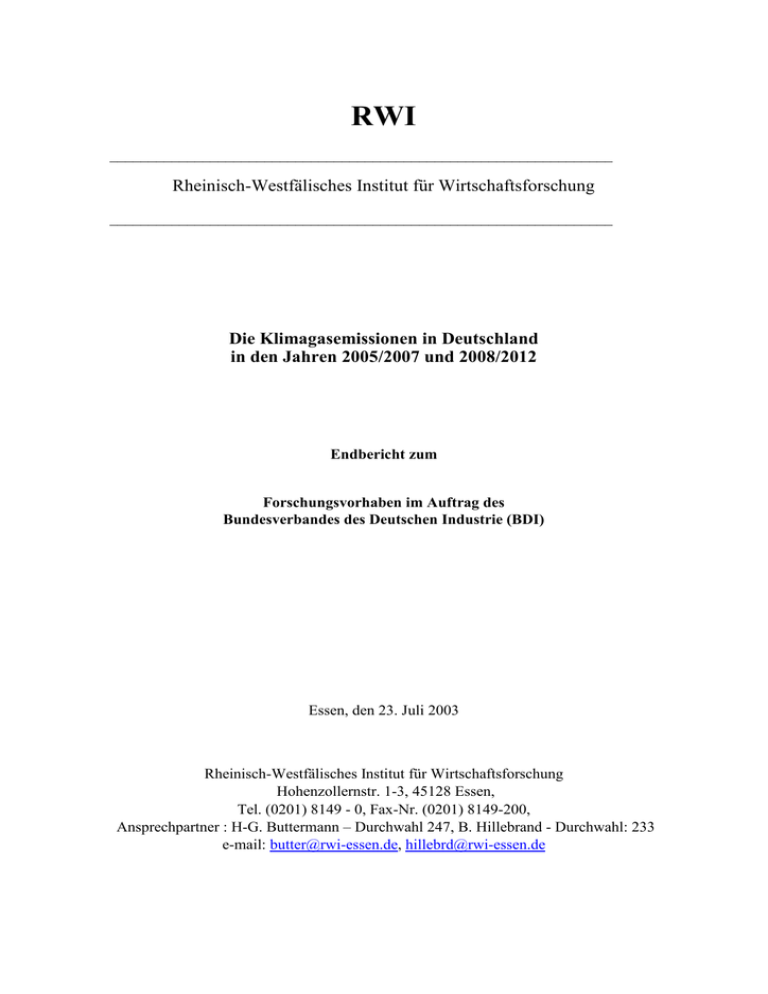 RWI _________________________________________________________________ Rheinisch-Westfälisches Institut für Wirtschaftsforschung _________________________________________________________________ Die Klimagasemissionen in Deutschland in den Jahren 2005/2007 und 2008/2012 Endbericht zum Forschungsvorhaben im Auftrag des Bundesverbandes des Deutschen Industrie (BDI) Essen, den 23. Juli 2003 Rheinisch-Westfälisches Institut für Wirtschaftsforschung Hohenzollernstr. 1-3, 45128 Essen, Tel. (0201) 8149 - 0, Fax-Nr. (0201) 8149-200, Ansprechpartner : H-G. Buttermann – Durchwahl 247, B. Hillebrand - Durchwahl: 233 e-mail: [email protected], [email protected] Projektleitung: Bearbeiter: Bernhard Hillebrand Hans Georg Buttermann Inhaltsverzeichnis 1. Problemstellung und Aufbau der Untersuchung .................................................1 2. Basisjahr und Entwicklung bis 2001 ...................................................................2 3. Rahmenbedingungen der Prognose .....................................................................7 4. Prognose der Treibhausgasemissionen für die beiden Handelsperioden...........14 5. Unsicherheiten der Prognose .............................................................................22 5.1 Ausstieg aus der Kernenergie ............................................................................22 5.2 Weltwirtschaftliche Unsicherheiten ..................................................................24 5.3 Binnenwirtschaftliche Unsicherheiten............................................................... 27 6. Zusammenfassende Bewertung .........................................................................30 I ––––––––––––––––––––––––––––––––––––––––––––––––RWI II ––––––––––––––––––––––––––––––––––––––––––––––––RWI Verzeichnis der Tabellen Tabelle 1: Bilanz der sechs Klimagase in Deutschland im Basisjahr und Ziel 2008/12 .............. ............................................................................................ 3 Tabelle 2: Beobachtete Entwicklung der sechs Klimagase in Deutschland, in Mill. t CO2-Äquivalente, 1990 bis 2001 ....................................................5 Tabelle 3: CO2-Emissionen in Deutschland, in Mill. t, 1990 bis 2001 .......................... 6 Tabelle 4: Annahmen zur gesamtwirtschaftlichen Entwicklung, 2000 bis 2012.............8 Tabelle 5: Preisentwicklung ausgewählter Primärenergieträger, 2000 bis 2012 ...........10 Tabelle 6: Die gesamtwirtschaftliche Entwicklung in Deutschland, 2005 bis 2012 .....11 Tabelle 7: Produktionsentwicklung in der Industrie, 2005 bis 2007 ............................. 12 Tabelle 8: Produktionsentwicklung in der Industrie, 2008 bis 2012 ............................. 13 Tabelle 9: Spezifische CO2-Emissionen der Industrie, 2005 bis 2007 .......................... 14 Tabelle 10: Spezifische CO2-Emissionen der Industrie, 2008 bis 2012 .......................... 15 Tabelle 11: CO2-Emissionen in der ersten Handelsperiode, 2005 bis 2007 .................... 16 Tabelle 12: CO2-Emissionen in der zweiten Handelsperiode, 2008 bis 2012 .................18 Tabelle 13: Klimagasemissionen in der ersten Handelsperiode, 2005 bis 2007..............17 Tabelle 14: Klimagasemissionen in der zweiten Handelsperiode, 2008 bis 2012 ..........19 Tabelle 15: Zeitprofil des Ausstiegs aus der Kernenergie, 2005 bis 2020 ...................... 21 III ––––––––––––––––––––––––––––––––––––––––––––––––RWI Tabelle 16: Ausstieg aus der Kernenergie und CO2-Emissionen, 2005 bis 2012 ............23 Tabelle 17: Alternative weltwirtschaftliche Entwicklungen, 2005 bis 2012 ...................25 Tabelle 18: Klimagasemissionen und weltwirtschaftliche Entwicklung, 2008 bis 2012 ................... .......................................................................................... 26 Tabelle 19: Alternative binnenwirtschaftliche Entwicklungen, 2005 bis 2012 ...............27 Tabelle 20: Klimagasemissionen und binnenwirtschaftliche Entwicklung, 2008 bis 2012 ................... .......................................................................................... 29 Tabelle 21: Bandbreite der Klimagasemissionen, 2008 bis 2012 ....................................31 IV 1. Problemstellung und Aufbau der Untersuchung Am 2. Juli 2003 hat das EU-Parlament in zweiter Lesung den Gemeinsamen Standpunkt des Ministerrats vom 18. März 2003 zur Einführung eines EU-weiten Handels mit Treibhausgasemissionen einschließlich der zuvor im Konsens mit Ministerrat und EUKommission erzielten Änderungen gebilligt. Eine endgültige Verabschiedung ist deswegen in naher Zukunft zu erwarten. Die Richtlinie sieht vor, mit Beginn des Jahres 2005 für die aus Anlagen der Energiewirtschaft und ausgewählter energieintensiver Produktionsprozesse stammenden Mengen an Kohlendioxid (CO2) ein Handelssystem einzuführen und damit einen Teil der Minderungsverpflichtungen, die sich aus dem Kyoto-Protokoll ergeben, zu erfüllen. Da mit dem Emissionshandel nur ein Teil der Minderungsverpflichtungen erfüllt werden kann, müssen die im Rahmen des Handelssystem zugewiesenen Rechte (gemäß Anhang III der Richtlinie) konsistent mit den Emissionszielen der EU insgesamt wie auch der einzelnen Mitgliedstaaten sein. Der Zuweisung von Emissionsrechten an einzelne Anlagen muss ein nationaler Allokationsplan vorausgehen, der mit den im EU-burden-sharing festgelegten Emissionszielen und der nationalen Klimaschutzpolitik konsistent ist. In Deutschland sind seit Beginn der neunziger Jahre eine Vielzahl von Maßnahmen ergriffen worden, mit denen eine Reduktion der klimawirksamen Spurengase erreicht werden soll. Das Maßnahmenbündel reicht von ordnungsrechtliche