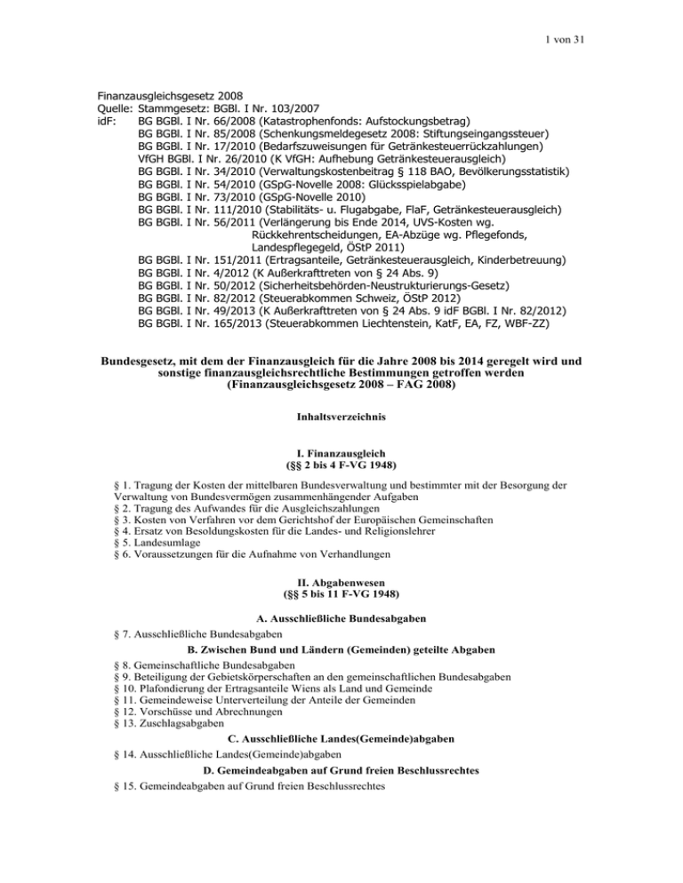 1 von 31 Finanzausgleichsgesetz 2008 Quelle: Stammgesetz: BGBl. I Nr. 103/2007 idF: BG BGBl. I Nr. 66/2008 (Katastrophenfonds: Aufstockungsbetrag) BG BGBl. I Nr. 85/2008 (Schenkungsmeldegesetz 2008: Stiftungseingangssteuer) BG BGBl. I Nr. 17/2010 (Bedarfszuweisungen für Getränkesteuerrückzahlungen) VfGH BGBl. I Nr. 26/2010 (K VfGH: Aufhebung Getränkesteuerausgleich) BG BGBl. I Nr. 34/2010 (Verwaltungskostenbeitrag § 118 BAO, Bevölkerungsstatistik) BG BGBl. I Nr. 54/2010 (GSpG-Novelle 2008: Glücksspielabgabe) BG BGBl. I Nr. 73/2010 (GSpG-Novelle 2010) BG BGBl. I Nr. 111/2010 (Stabilitäts- u. Flugabgabe, FlaF, Getränkesteuerausgleich) BG BGBl. I Nr. 56/2011 (Verlängerung bis Ende 2014, UVS-Kosten wg. Rückkehrentscheidungen, EA-Abzüge wg. Pflegefonds, Landespflegegeld, ÖStP 2011) BG BGBl. I Nr. 151/2011 (Ertragsanteile, Getränkesteuerausgleich, Kinderbetreuung) BG BGBl. I Nr. 4/2012 (K Außerkrafttreten von § 24 Abs. 9) BG BGBl. I Nr. 50/2012 (Sicherheitsbehörden-Neustrukturierungs-Gesetz) BG BGBl. I Nr. 82/2012 (Steuerabkommen Schweiz, ÖStP 2012) BG BGBl. I Nr. 49/2013 (K Außerkrafttreten von § 24 Abs. 9 idF BGBl. I Nr. 82/2012) BG BGBl. I Nr. 165/2013 (Steuerabkommen Liechtenstein, KatF, EA, FZ, WBF-ZZ) Bundesgesetz, mit dem der Finanzausgleich für die Jahre 2008 bis 2014 geregelt wird und sonstige finanzausgleichsrechtliche Bestimmungen getroffen werden (Finanzausgleichsgesetz 2008 – FAG 2008) Inhaltsverzeichnis I. Finanzausgleich (§§ 2 bis 4 F-VG 1948) § 1. Tragung der Kosten der mittelbaren Bundesverwaltung und bestimmter mit der Besorgung der Verwaltung von Bundesvermögen zusammenhängender Aufgaben § 2. Tragung des Aufwandes für die Ausgleichszahlungen § 3. Kosten von Verfahren vor dem Gerichtshof der Europäischen Gemeinschaften § 4. Ersatz von Besoldungskosten für die Landes- und Religionslehrer § 5. Landesumlage § 6. Voraussetzungen für die Aufnahme von Verhandlungen II. Abgabenwesen (§§ 5 bis 11 F-VG 1948) A. Ausschließliche Bundesabgaben § 7. Ausschließliche Bundesabgaben B. Zwischen Bund und Ländern (Gemeinden) geteilte Abgaben § 8. Gemeinschaftliche Bundesabgaben § 9. Beteiligung der Gebietskörperschaften an den gemeinschaftlichen Bundesabgaben § 10. Plafondierung der Ertragsanteile Wiens als Land und Gemeinde § 11. Gemeindeweise Unterverteilung der Anteile der Gemeinden § 12. Vorschüsse und Abrechnungen § 13. Zuschlagsabgaben C. Ausschließliche Landes(Gemeinde)abgaben § 14. Ausschließliche Landes(Gemeinde)abgaben D. Gemeindeabgaben auf Grund freien Beschlussrechtes § 15. Gemeindeabgaben auf Grund freien Beschlussrechtes 2 von 31 § 16. Kompetenzverteilung bei der Kommunalsteuer § 17. Interkommunaler Finanzausgleich für die Erträge aus der Kommunalsteuer § 18. Kompetenzverteilung bei der Grundsteuer und bei der Feuerschutzsteuer § 19. Eigener Wirkungsbereich der Gemeinden III. Finanzzuweisungen und Zuschüsse (§§ 12 und 13 F-VG 1948) Finanzzuweisungen § 20 Abs. 1: Finanzzuweisung an Gemeinden – öffentliche Personennahverkehrsunternehmen § 20 Abs. 2: Finanzzuweisung an Gemeinden – Personennahverkehrs-Investitionen § 20 Abs. 3: Finanzzuweisung an Statutarstädte ohne Bundespolizeibehörden § 21. Finanzzuweisung an Gemeinden – Finanzkraftstärkung § 22. Bedarfszuweisung an Länder – Haushaltsgleichgewicht Zuschüsse § 23 Abs. 1: Zweckzuschuss an Länder und Gemeinden – Theater § 23 Abs. 2: Zweckzuschuss an Länder – Krankenanstaltenfinanzierung (Gemeindeanteil) § 23 Abs. 3: Erstausstattung an Software § 23 Abs. 4: Zweckzuschuss – Kinderbetreuung und sprachliche Frühförderung IV. Sonder- und Schlussbestimmungen § 24. Inkrafttreten, Sonderbestimmungen § 25. Außerkrafttreten I. Finanzausgleich (§§ 2 bis 4 F-VG 1948) Tragung der Kosten der mittelbaren Bundesverwaltung und bestimmter mit der Besorgung der Verwaltung von Bundesvermögen zusammenhängender Aufgaben § 1. (1) Im Bereich der mittelbaren Bundesverwaltung (Artikel 102 B-VG) tragen die Länder den Personal- und Sachaufwand und die Ruhe- und Versorgungsgenüsse der mit der Besorgung dieser Verwaltung betrauten Bediensteten nach Maßgabe der folgenden Bestimmungen: 1. Die Länder tragen den Aufwand für die Dienstbezüge der bei den Behörden der allgemeinen Verwaltung in den Ländern einschließlich der Agrarbehörden erster und zweiter Instanz in Verwendung stehenden Bediensteten. Unter Dienstbezügen im Sinne dieser Bestimmung sind alle Bezüge und Zuwendungen zu verstehen, auf die solche Bedienstete auf Grund des Dienstverhältnisses Anspruch haben oder die im Zusammenhang mit dem Dienstverhältnis gewährt werden. 2. Die Länder tragen die Ruhegenüsse der unter Z 1 bezeichneten Bediensteten und die Versorgungsgenüsse nach solchen Bediensteten, a) wenn die Ruhe- oder Versorgungsgenüsse in der Zeit vom 1. Oktober 1925 bis 13. März 1938 angefallen sind, b) wenn sich die Bediensteten am 13. März 1938 im Dienststand befunden haben, aber in einen der nach den Bestimmungen des Beamten-Überleitungsgesetzes, StGBl. Nr. 134/1945, neu gebildeten Personalstände nicht übernommen worden sind, c) wenn die Bediensteten in den neu gebildeten Personalstand aus Anlass der Bildung nach § 7 des Beamten-Überleitungsgesetzes oder später übernommen worden sind. 3. Die Länder tragen den Sachaufwand der unter Z 1 angeführten Behörden in dem sich aus den jeweils geltenden Vorschriften ergebenden Ausmaß. Unter Sachaufwand im Sinne dieser Bestimmung ist der gesamte Amtssachaufwand einschließlich aller Reisekosten zu verstehen. (2) Bei den nach Art. 104 Abs. 2 B-VG den Ländern bei der Verwaltung bundeseigener Liegenschaften übertragenen Aufgaben wird der damit verbundene Aufwand wie folgt getragen: 1. Das Land trägt den Personal- und Sachaufwand im Sinne des Abs. 1 sowie den Aufwand für Vermessungsarbeiten durch Dritte. Der Bund ersetzt dem Land allerdings den Aufwand für 3 von 31 Vermessungsarbeiten durch Dritte, soweit diese Arbeiten vom z