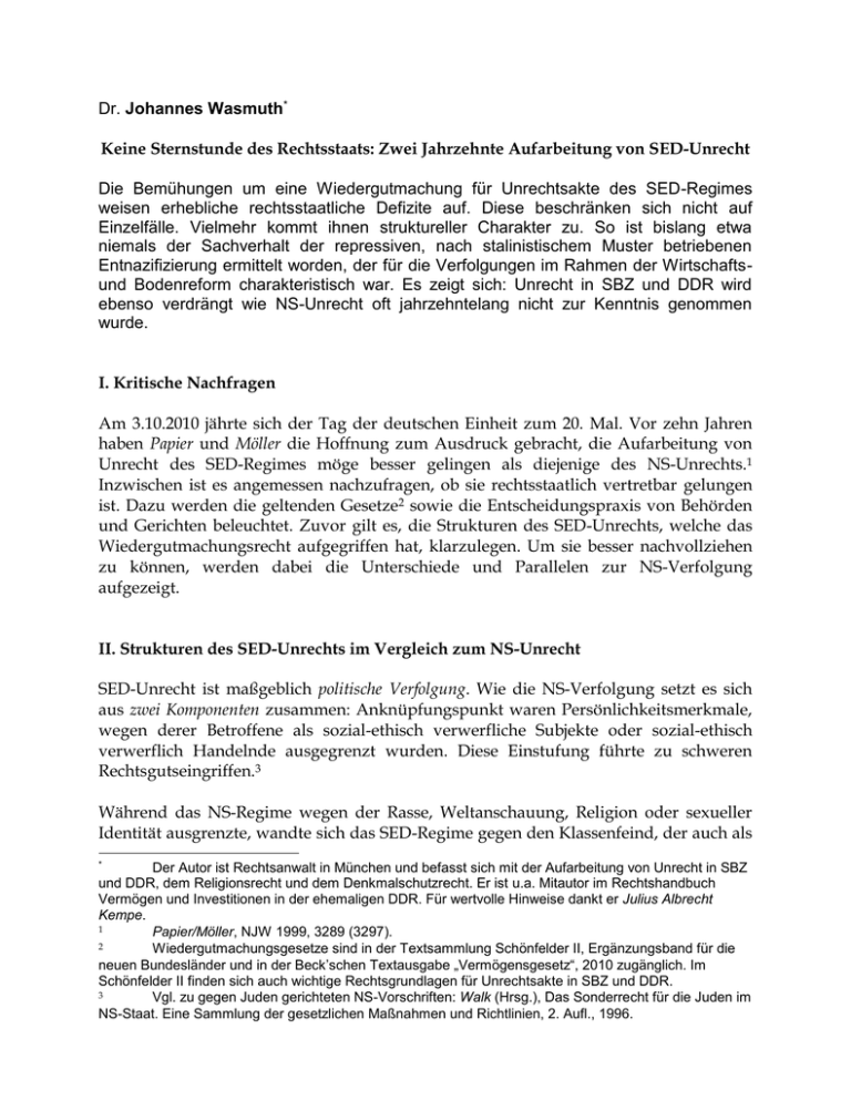 Dr. Johannes Wasmuth* Keine Sternstunde des Rechtsstaats: Zwei Jahrzehnte Aufarbeitung von SED-Unrecht Die Bemühungen um eine Wiedergutmachung für Unrechtsakte des SED-Regimes weisen erhebliche rechtsstaatliche Defizite auf. Diese beschränken sich nicht auf Einzelfälle. Vielmehr kommt ihnen struktureller Charakter zu. So ist bislang etwa niemals der Sachverhalt der repressiven, nach stalinistischem Muster betriebenen Entnazifizierung ermittelt worden, der für die Verfolgungen im Rahmen der Wirtschaftsund Bodenreform charakteristisch war. Es zeigt sich: Unrecht in SBZ und DDR wird ebenso verdrängt wie NS-Unrecht oft jahrzehntelang nicht zur Kenntnis genommen wurde. I. Kritische Nachfragen Am 3.10.2010 jährte sich der Tag der deutschen Einheit zum 20. Mal. Vor zehn Jahren haben Papier und Möller die Hoffnung zum Ausdruck gebracht, die Aufarbeitung von Unrecht des SED-Regimes möge besser gelingen als diejenige des NS-Unrechts.1 Inzwischen ist es angemessen nachzufragen, ob sie rechtsstaatlich vertretbar gelungen ist. Dazu werden die geltenden Gesetze2 sowie die Entscheidungspraxis von Behörden und Gerichten beleuchtet. Zuvor gilt es, die Strukturen des SED-Unrechts, welche das Wiedergutmachungsrecht aufgegriffen hat, klarzulegen. Um sie besser nachvollziehen zu können, werden dabei die Unterschiede und Parallelen zur NS-Verfolgung aufgezeigt. II. Strukturen des SED-Unrechts im Vergleich zum NS-Unrecht SED-Unrecht ist maßgeblich politische Verfolgung. Wie die NS-Verfolgung setzt es sich aus zwei Komponenten zusammen: Anknüpfungspunkt waren Persönlichkeitsmerkmale, wegen derer Betroffene als sozial-ethisch verwerfliche Subjekte oder sozial-ethisch verwerflich Handelnde ausgegrenzt wurden. Diese Einstufung führte zu schweren Rechtsgutseingriffen.3 Während das NS-Regime wegen der Rasse, Weltanschauung, Religion oder sexueller Identität ausgrenzte, wandte sich das SED-Regime gegen den Klassenfeind, der auch als * Der Autor ist Rechtsanwalt in München und befasst sich mit der Aufarbeitung von Unrecht in SBZ und DDR, dem Religionsrecht und dem Denkmalschutzrecht. Er ist u.a. Mitautor im Rechtshandbuch Vermögen und Investitionen in der ehemaligen DDR. Für wertvolle Hinweise dankt er Julius Albrecht Kempe. 1 Papier/Möller, NJW 1999, 3289 (3297). 2 Wiedergutmachungsgesetze sind in der Textsammlung Schönfelder II, Ergänzungsband für die neuen Bundesländer und in der Beck’schen Textausgabe „Vermögensgesetz“, 2010 zugänglich. Im Schönfelder II finden sich auch wichtige Rechtsgrundlagen für Unrechtsakte in SBZ und DDR. 3 Vgl. zu gegen Juden gerichteten NS-Vorschriften: Walk (Hrsg.), Das Sonderrecht für die Juden im NS-Staat. Eine Sammlung der gesetzlichen Maßnahmen und Richtlinien, 2. Aufl., 1996. 2 Nazi- und Kriegsverbrecher,4 Saboteur, Revisionist, Schädling, Monopolkapitalist, Konterrevolutionär oder Kriegshetzer5 umschrieben wurde. Darauf gestützt wurde zur Machtusurpation unter dem harmlos klingenden Topos „antifaschistischdemokratischer Reformen,“ die nach marxistisch-leninistischem Verständnis Maßnahmen des Machtkampfs der Partei der Arbeiterklasse darstellten, der „schärfste Klassenkampf“ zur Realisierung der „Diktatur des Proletariats“ durchgeführt. 6 Wesentliche Unterschiede zum NS-Unrecht bestehen aber deshalb, weil rassische NSVerfolgung auf den systematischen Völkermord abzielte und diesen in erschreckendem Umfang auch verwirklicht hat.7 Etwa an Mitgliedern politischer Parteien und von Gewerkschaften hat aber auch das NS-Regmie keinen Völkermord verübt. Das ihnen angetane Maß an Unrecht 8 hat die SED-Verfolgung in SBZ und DDR im übrigen ebenfalls erreicht:9 Mit dem Einmarsch sowjetischer Truppen wurden auch deutsche Zivilisten interniert. Damit begann eine Verfolgung, die zu den grausamsten Akten stalinistischer Machtusurpation in der SBZ zählt. Sie wurde von Repressionsakten Sowjetischer Militärtribunale (SMT)10 und deutscher Sonderstrafgerichte einschließlich desjenigen in Waldheim11 fortgesetzt. Die Maßnahmen dienten vor allem der Ausschaltung von Klassenfeinden und Gegnern des Sowjetsystems. Sanktionen waren Todes- oder Regelstrafen von 25 Jahren Internierung oder Zwangsarbeit in Speziallagern.12 Dabei wurde der Tod zehntausender Deutscher in Kauf genommen. Bereits nach sowjetischen Angaben wurden zwischen 1945 und 1950 rd. 123.000 Deutsche inhaftiert. Davon sind rd. 43.000 aufgrund der katastrophalen Lagerbedingungen gestorben. 13.000 Personen wurden in sowjetische Arbeitslager verschleppt. Lediglich 45.000 Inhaftierte wurden später als entlassen registriert.13 Diese 4 Die Gleichsetzung von Klassenfeinden als Nazi- und Kriegsverbrecher war Folge der Ideologie des kommunistischen Antifaschismus; vgl. Wilhelm, Die Rolle von Partei und Staat bei der Durchführung der Enteignung der Nazi- und Kriegsverbrecher, 1980, S. 7. 5 Vgl. dazu: Schuller, Geschichte und Struktur des politischen Strafrechts der DDR bis 1968, 1980, S. 180ff., 206ff. 6 Zur stalinistischen Machtusurpation vgl. KPD-Urteil des BVerfG (BVerfGE 5, 85, 147ff.). In der DDR ist sie propagandistisch verharmlost worden, was ihre Wahrnehmung weiterhin trübt. 7 Vgl. nur Hilberg, Die Vernichtung der europäischen Juden, Bd. 2, 1997, S.287ff., 411ff., 927ff.; Friedländer, Das Dritte Reich und die Juden 1939-1945, Bd. 2, Die Jahre der Vernichtung, 2. Aufl., 2006, S. 29ff., 225ff., 427ff. 8 Vgl. Wasmuth, ZOV 2009, 110ff. 9 Diese Vergleichbarkeit wird oft übersehen, weil das NS-Unrecht allein mit dem Völkermord gleichgesetzt wird (so noch: KG, Beschluss vom 24.6.2010 - 2 Ws 191/10 REHA -, S. 12f. des amtl. Umdrucks). 10 Vgl. Hilger/Petrov, „Erledigung der Schmutzarbeit?“- Die sowjetischen Justiz- und Sicherheitsapparate in Deutschland, in: Hilger/Schmeitzner/Schmidt, Sowjetische Militärtribunale, Bd. 2, Die Verurteilung deutscher Zivilisten 1945-1955, 2003, S. 59ff.; Jeske/Schmidt, Zur Verfolgung von Kriegsund NS-Verbrechen durch sowjetische Militärtribunale in d