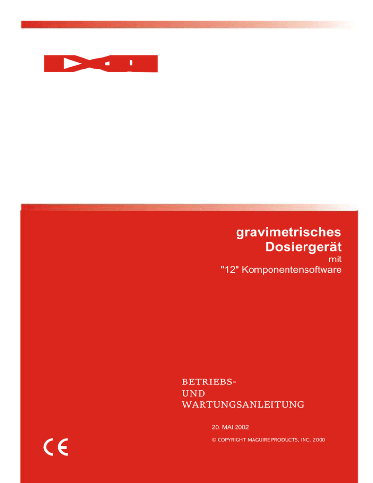 M A G U I R E gravimetrisches Dosiergerät mit "12" Komponentensoftware BETRIEBSUND WARTUNGSANLEITUNG 20. MAI 2002 © COPYRIGHT MAGUIRE PRODUCTS, INC. 2000 Maguire gravimetrisches Dosiergerät Betriebs- und Wartungsanleitung für die "12"-Software Inhaltsverzeichnis Inhaltsverzeichnis ............................................................................................................................... 2 EG-Konformitätserklärung ................................................................................................................. 4 EG-Konformitätserklärung ................................................................................................................. 4 ABSCHNITT 1 - INBETRIEBNAHME DES GRAVIMETRISCHEN DOSIERGERÄTES ..............5 Erste Schritte – Bitte diese Seite lesen! ............................................................................................ 5 Gefahrstellen ....................................................................................................................................... 6 Sicherheitsfunktionen ........................................................................................................................ 6 Einzelteile des gravimetrischen Dosiergerätes ................................................................................ 8 Einzelteile der Steuerung ................................................................................................................. 10 Montage- und Installationsanleitungen ........................................................................................... 11 Hinweise zur Verkabelung ................................................................................................................ 15 Erste Prüfung .................................................................................................................................... 16 Erstprüfungsdiagnose ...................................................................................................................... 17 Auswahl des richtigen Modells ........................................................................................................ 19 ABSCHNITT 2 - BETRIEB.........................................................................................................20 Wiegezellenkalibrierung ................................................................................................................... 20 Aktivierung von einzelnen Stationen ............................................................................................... 21 Definitionen von Materialtypen ........................................................................................................ 21 Einstellung von Materialtypen.......................................................................................................... 23 Beispiele für Einstellungen .............................................................................................................. 24 Material-Durchflusskalibrierung ...................................................................................................... 26 Eingabe von Rezepten ...................................................................................................................... 27 Zuweisen von Materialeinstellungen an die Dekadenschalter ...................................................... 27 Sonderanweisungen für bestimmte Modelle .................................................................................. 28 Anweisungen für normalen Betrieb ................................................................................................. 29 Normaler Betriebssequenz für jeden Zyklus ................................................................................... 30 Sonderfunktionen ............................................................................................................................. 31 Steuerung: Steuerungen und Ausgänge ......................................................................................... 33 Steuerungs-Tastenfeld – Zusammenfassung ................................................................................. 37 Steuerungs-Tastenfeld – Funktionsbeschreibung ......................................................................... 38 Die Bedeutung der Stern-Funktionen .............................................................................................. 44 Stern-Funktionen .............................................................................................................................. 45 Die Bedeutung der Parameter .......................................................................................................... 51 2 Einführung Parameter ...................................................................................................................... 52 Navigation zwischen Parametern .................................................................................................... 53 Parameterliste - Erläuterungen ........................................................................................................ 53 Allgemeine Parameter....................................................................................................................... 53 Stationsparameter............................................................................................................................. 55 Änderung der Parametereinstellungen ........................................................................................... 59 Speichern von Parametern im EEPROM ......................................................................................... 59 ABSCHNITT 3 - DRUCKAUSGABEN .......................................................................................61 Überwachung der Systemgenauigkeit............................................................................................. 61 *54 - Zyklus-Ausdruc