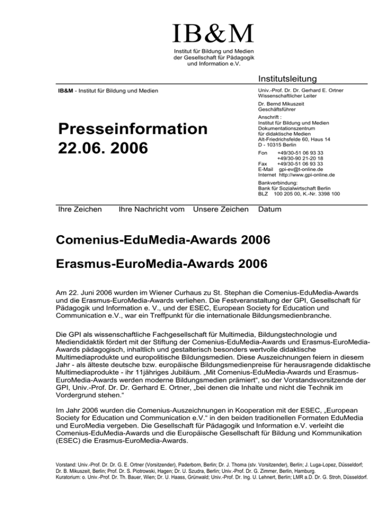 IB&M Institut für Bildung und Medien der Gesellschaft für Pädagogik und Information e.V. Institutsleitung Univ.-Prof. Dr. Dr. Gerhard E. Ortner Wissenschaftlicher Leiter IB&M - Institut für Bildung und Medien Dr. Bernd Mikuszeit Geschäftsführer Presseinformation 22.06. 2006 Anschrift : Institut für Bildung und Medien Dokumentationszentrum für didaktische Medien Alt-Friedrichsfelde 60, Haus 14 D - 10315 Berlin Fon +49/30-51 06 93 33 +49/30-90 21-20 18 Fax +49/30-51 06 93 33 E-Mail [email protected] Internet http://www.gpi-online.de Bankverbindung: Bank für Sozialwirtschaft Berlin BLZ 100 205 00, K.-Nr. 3398 100 Ihre Zeichen Ihre Nachricht vom Unsere Zeichen Datum Comenius-EduMedia-Awards 2006 Erasmus-EuroMedia-Awards 2006 Am 22. Juni 2006 wurden im Wiener Curhaus zu St. Stephan die Comenius-EduMedia-Awards und die Erasmus-EuroMedia-Awards verliehen. Die Festveranstaltung der GPI, Gesellschaft für Pädagogik und Information e. V., und der ESEC, European Society for Education und Communication e.V., war ein Treffpunkt für die internationale Bildungsmedienbranche. Die GPI als wissenschaftliche Fachgesellschaft für Multimedia, Bildungstechnologie und Mediendidaktik fördert mit der Stiftung der Comenius-EduMedia-Awards und Erasmus-EuroMediaAwards pädagogisch, inhaltlich und gestalterisch besonders wertvolle didaktische Multimediaprodukte und europolitische Bildungsmedien. Diese Auszeichnungen feiern in diesem Jahr - als älteste deutsche bzw. europäische Bildungsmedienpreise für herausragende didaktische Multimediaprodukte - ihr 11jähriges Jubiläum. „Mit Comenius-EduMedia-Awards und ErasmusEuroMedia-Awards werden moderne Bildungsmedien prämiert“, so der Vorstandsvorsitzende der GPI, Univ.-Prof. Dr. Dr. Gerhard E. Ortner, „bei denen die Inhalte und nicht die Technik im Vordergrund stehen.“ Im Jahr 2006 wurden die Comenius-Auszeichnungen in Kooperation mit der ESEC, „European Society for Education und Communication e.V.“ in den beiden traditionellen Formaten EduMedia und EuroMedia vergeben. Die Gesellschaft für Pädagogik und Information e.V. verleiht die Comenius-EduMedia-Awards und die Europäische Gesellschaft für Bildung und Kommunikation (ESEC) die Erasmus-EuroMedia-Awards. Vorstand: Univ.-Prof. Dr. Dr. G. E. Ortner (Vorsitzender), Paderborn, Berlin; Dr. J. Thoma (stv. Vorsitzender), Berlin; J. Luga-Lopez, Düsseldorf; Dr. B. Mikuszeit, Berlin; Prof. Dr. S. Piotrowski, Hagen; Dr. U. Szudra, Berlin; Univ.-Prof. Dr. G. Zimmer, Berlin, Hamburg. Kuratorium: o. Univ.-Prof. Dr. Th. Bauer, Wien; Dr. U. Haass, Grünwald; Univ.-Prof. Dr. Ing. U. Lehnert, Berlin; LMR a.D. Dr. G. Stroh, Düsseldorf. IB&M, Institut für Bildung und Medien der GPI 2 Alle Auszeichnungen sind Ehrenpreise und daher nicht mit einer finanziellen Zuwendung für Preisträger verbunden. Ihr Wert liegt vor allem darin, dass ausgezeichnete Projekte internationale Aufmerksamkeit erreichen. Von den Experten, Einreichern und Ausgezeichneten werden diese Preise als eine kompetente Vermittlungsinstanz zwischen unterschiedlichsten Projekten und Projektbetreibern geschätzt, wie der Präsident der Österreichischen Gesellschaft für Bildung und Kommunikation, o. Univ.Prof. Dr. Thomas A. Bauer, ausführte. Die Sieger des Medienwettbewerbs werden nach didaktisch und wissenschaftlich fundierter Begutachtung in einem herstellerneutralen Bewertungsverfahren ermittelt. In einem zweistufigen Vergabeverfahren wird über die Comenius-EduMedia-Awards für exemplarische didaktische Multimediaprodukte entschieden. Die Entscheidungen im Erasmus-EuroMedia-Award für hervorragende eurokulturelle Bildungsmedien werden von einer international besetzten Jury getroffen. Die Comenius-EduMedia-Auszeichnungen werden für hervorragende IKT-basierte Bildungsmedien aus allen Bildungsbereichen, Anwendungsfeldern und Bildungsinhaltsbereichen verliehen, die als CD-ROM, als DVD oder im Netz bzw. als hybrides Angebot, als Autorensystem, als Netzwerk oder als Plattform für Bildungszwecke zur Verfügung stehen. Erasmus-Euromedia-Auszeichnungen werden für Medienprogramme, Medienprodukte oder Medienproduktionen (elektronische Medien, Netz-Medien) vergeben, die das Thema Europa im Hinblick auf dessen Zielsetzungen, Perspektiven, Problembedingungen und Herausforderungen zum Inhalt haben. Die Zahl der Einreichungen zu den Comenius-EduMedia-Awards und den Erasmus-EuroMediaAwards hat sich gegenüber dem Start der Prämierung im Jahr 1995 vervielfacht und über Europa ausgedehnt. Teilnehmerländer waren 2006 Deutschland, Griechenland, Kroatien, Moldawien, Niederlande, Österreich, Schweiz, Slowenien, Tschechien, Ungarn und Zypern. 169 Comenius-EduMedia-Awards und Erasmus-EuroMedia-Awards für multimediale Produkte für Bildung und Kultur konnten in diesem Jahr vergeben werden. Das Comenius-EduMedia-Siegel, das den Autoren und Verlegern besondere didaktische und mediale Qualität ihrer Multimediaprodukte bescheinigt, erhielten 109 Preisträger. Der Comenius-EduMedia-Sonderpreis wurde fünfmal und der Comenius-EduMedia-Förderpreis einmal vergeben. Die bei Verlagen und Herstellern besonders begehrten Comenius-Edumedia-Medaillen vergab die Jury 2006 29mal für herausragende exemplarische Multimediaprodukte. Erasmus-EuroMedia-Auszeichnungen wurden 2006 für europolitische Bildungsmedien an Einrichtungen aus 10 Ländern vergeben. Achtmal wurden die Erasmus-EuroMedia-Medaillen, 15mal das Erasmus-EuroMedia-Siegel und zweimal der Erasmus-EuroMedia-Sonderpreis verliehen. Die außerordentlich große Resonanz, die die Medienwettbewerbe in Europa gefunden haben, unterstreicht die Bedeutung, die E-Learning und B-Education in den verschiedenen Bildungsformen und beim lebenslangen Lernen gewonnen haben. Tendenziell ist im Jahr 2006 eine Zunahme von interaktiven und multimedialen Lernsystemen und aus inhaltlicher Sicht von Multimediaprodukten für die ethische, zeitgeschichtliche und eurokulturelle Bildung festzustellen. 2006 nahmen der GPI-Vorstandsvorsitz