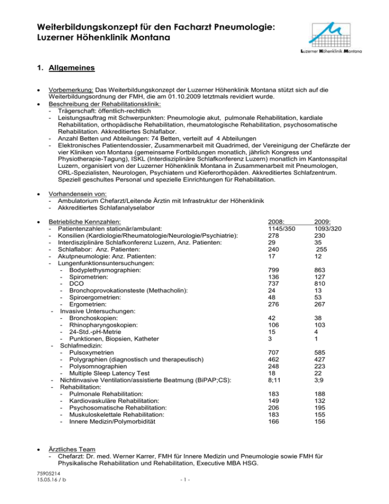 Weiterbildungskonzept für den Facharzt Pneumologie: Luzerner Höhenklinik Montana 1. Allgemeines Vorbemerkung: Das Weiterbildungskonzept der Luzerner Höhenklinik Montana stützt sich auf die Weiterbildungsordnung der FMH, die am 01.10.2009 letztmals revidiert wurde. Beschreibung der Rehabilitationsklinik: - Trägerschaft: öffentlich-rechtlich - Leistungsauftrag mit Schwerpunkten: Pneumologie akut, pulmonale Rehabilitation, kardiale Rehabilitation, orthopädische Rehabilitation, rheumatologische Rehabilitation, psychosomatische Rehabilitation. Akkreditiertes Schlaflabor. - Anzahl Betten und Abteilungen: 74 Betten, verteilt auf 4 Abteilungen - Elektronisches Patientendossier, Zusammenarbeit mit Quadrimed, der Vereinigung der Chefärzte der vier Kliniken von Montana (gemeinsame Fortbildungen monatlich, jährlich Kongress und Physiotherapie-Tagung), ISKL (Interdisziplinäre Schlafkonferenz Luzern) monatlich im Kantonsspital Luzern, organisiert von der Luzerner Höhenklinik Montana in Zusammenarbeit mit Pneumologen, ORL-Spezialisten, Neurologen, Psychiatern und Kieferorthopäden. Akkreditiertes Schlafzentrum. Speziell geschultes Personal und spezielle Einrichtungen für Rehabilitation. Vorhandensein von: - Ambulatorium Chefarzt/Leitende Ärztin mit Infrastruktur der Höhenklinik - Akkreditiertes Schlafanalyselabor Betriebliche Kennzahlen: - Patientenzahlen stationär/ambulant: - Konsilien (Kardiologie/Rheumatologie/Neurologie/Psychiatrie): - Interdisziplinäre Schlafkonferenz Luzern, Anz. Patienten: - Schlaflabor: Anz. Patienten: - Akutpneumologie: Anz. Patienten: - Lungenfunktionsuntersuchungen: - Bodyplethysmographien: - Spirometrien: - DCO - Bronchoprovokationsteste (Methacholin): - Spiroergometrien: - Ergometrien: - Invasive Untersuchungen: - Bronchoskopien: - Rhinopharyngoskopien: - 24-Std.-pH-Metrie - Punktionen, Biopsien, Katheter - Schlafmedizin: - Pulsoxymetrien - Polygraphien (diagnostisch und therapeutisch) - Polysomnographien - Multiple Sleep Latency Test - Nichtinvasive Ventilation/assistierte Beatmung (BiPAP;CS): - Rehabilitation: - Pulmonale Rehabilitation: - Kardiovaskuläre Rehabilitation: - Psychosomatische Rehabilitation: - Muskuloskelettale Rehabilitation: - Innere Medizin/Polymorbidität 2008: 1145/350 278 29 240 17 2009: 1093/320 230 35 255 12 799 136 737 24 48 276 863 127 810 13 53 267 42 106 15 3 38 103 4 1 707 462 248 18 8;11 585 427 223 22 3;9 183 149 206 183 166 188 132 195 155 156 Ärztliches Team - Chefarzt: Dr. med. Werner Karrer, FMH für Innere Medizin und Pneumologie sowie FMH für Physikalische Rehabilitation und Rehabilitation, Executive MBA HSG. 75905214 15.05.16 / b -1- Weiterbildungskonzept für den Facharzt Pneumologie: Luzerner Höhenklinik Montana - Leitende Ärztin: Dr. med. Helena Shang Meier, FMH für Innere Medizin und Pneumologie, FA SAPPM Oberarzt: Dr. med. Patrick Brun, FMH für Innere Medizin 2. Anzahl der Weiterbildungsstellen Facharztanwärter: 1 Verhältnis Weiterbildner/Zahl der Assistenten: 1:2 Spezieller Tutor für Assistenten: erfahrener Abteilungsarzt 3. Allgemeine Weiterbildungsziele analog Weiterbildungsprogramm Pneumologie, Ziff. 1.2 4. Weiterbildungsinhalte analog Weiterbildungsprogramm Pneumologie, Ziff. 3 Funktionslabor o Bodyplethysmographie o Ergospirometrie o Provokationstest o etc. Endoskopie o Rhinoskopie o Rhinopharyngoskopie o Bronchoskopie Schlaflabor o Respiratorische Polygraphie o Polysomnographie o MSLT, MWT o Aktigraphie o CPAP.Titration o Mechanische Heimventilation Arbeit auf der Abteilung mit o Akutpneumologischen Patienten o Pulmonale Rehabilitation o Tuberkulose (inkl MDR) Konsilien für andere Kliniken in Montana Mitarbeit bei klinischen Studien und deren Präsentation 5. Einführung in die Arbeitsstätte Vgl. Formular 1 und 2 im Anhang interne EDV-Plattform (Intranet, Lotus Notes). Es sind sämtliche Weisungen (Blaubuch) sowie QManagement elektronisch vorhanden: Folgende Datenbanken stehen zur Verfügung: LHM Weisungen LHM-Net Blaubuch Medizin LHM-Webseite Medikamentenliste LHM Medizinische Bibliothek Qualitätshandbuch Informatik-Help LHM Projekte 75905214 15.05.16 / b -2- LHM Formulare LHM Standards Gerätepark LHM Teaching Direkten Zugang aufs Internet Alle relevanten Zeitschriften und verschiedene Textbücher sind online zugänglich 6. Zeitlicher Ablauf der Vermittlung der Weiterbildungsinhalte 1. Jahr Basis: Einführung in die Pneumologie, Lungenfunktionsprüfung, Ergometrie und Ergospirometrie, Rehabilitationskonzepte, Basis der Schlafmedizin (Oxymetrie und respiratorische Polygraphie). Erlernen der Bronchoskopie mittels Phantom und an Patienten. 2. Jahr: Festigung der Kenntnisse aus dem 1. Jahr, insbesondere bronchoskopische Routine. Einführung in die Polysomnographie. Es wird ein Logbuch geführt (vgl. Beilage) 7. Lernunterstützende Massnahmen (gem. Ziff. 5 des Weiterbildungsprogrammes) Journal Club 1x wöchentlich Teaching Club (Assistenten-Curriculum) 1x wöchentlich Einstündige Fortbildung mit in- und externen Referenten 1x wöchentlich Fallvorstellungen 1x wöchentlich Labor-Teaching 1x wöchentlich Besuch nationaler Fortbildungen und Kongresse (SGP Jahresversammlung) 8. Dokumentation der gelernten/vermittelten Inhalte Dokumentation der durchgeführten Tätigkeiten gemäss Logbuch Jährliche fachspezifische FMH-Evaluationsprotokolle, FMH-Zeugnis und separate klinikspezifische Auflistung. 9. Evaluation a) Zielvereinbarung bei Stellenantritt mündlich und schriftlich b) Erste Evaluation nach 3-6 Monaten c) Weitere Evaluation jährlich, anhand FMH-Evaluationsformular 04.07.10 Dr. med. W. Karrer, Chefarzt Elfenstrasse 18, Postfach 170, CH-3000 Bern 15 Telefon +41 31 359 11 11, Fax +41 31 359 11 12 [email protected], www.fmh.ch Weiterbildungskonzepte für den Facharzt Pneumologie: Luzerner Höhenklinik Montana Anhang 1: Check-Liste für Ärzte zur Einführung was wer Für Villa Claire: Schlüssel an der Réception abholen Reception 08.00 h Vorstellung am Morgenrapport ChA/CoChA/OA Abgabe Pflichtenhe