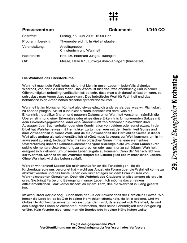 Pressezentrum Dokument: Sperrfrist: Freitag, 15. Juni 2001; 15:00 Uhr Programmbereich: Themenbereich 1: In Vielfalt glauben Veranstaltung: Arbeitsgruppe Christentum und Wahrheit Referent/in: Prof. Dr. Eberhard Jüngel, Tübingen Ort: Messe, Halle 6.1, Ludwig-Erhard-Anlage 1 (Innenstadt) 1/019 CO Die Wahrheit des Christentums Wahrheit macht die Welt heller, sie bringt Licht in unser Leben – jedenfalls diejenige Wahrheit, von der die Bibel redet. Das Wahre ist hier das, was offenkundig und in seiner Offenkundigkeit unbedingt verlässlich ist: so sehr, dass man sich darauf einlassen kann, so sehr, dass man Amen dazu sagen kann. Das hebräische Wort für Wahrheit und das hebräische Wort Amen haben dieselbe sprachliche Wurzel. Wahrheit ist im biblischen Kontext also etwas gänzlich anderes als das, was wir Richtigkeit zu nennen pflegen. Sie ist auch nicht einfach identisch mit dem, was die Erkenntnistheoretiker älteren und neueren Datums unter Wahrheit verstehen: nämlich die Übereinstimmung einer Erkenntnis oder eines diese Erkenntnis formulierenden Satzes mit dem Erkenntnisgegenstand, oder eine Übereinkunft von Menschen hinsichtlich ihrer Aussagen über Sachverhalte, oder eine Kombination von beidem oder sonst etwas. In der Bibel hat Wahrheit etwas mit Herrlichkeit zu tun, genauer mit der Herrlichkeit Gottes und ihrer Anwesenheit in dieser Welt. Und da die Anwesenheit der Herrlichkeit Gottes in dieser Welt alles andere als selbstverständlich ist (Gott muss ja eigens zur Welt kommen, um in ihr anwesend zu sein), bedeutet Wahrheit im biblischen Sinne immer eine elementare Unterbrechung unseres Lebenszusammenhanges: allerdings nicht um unser Leben durch solche elementare Unterbrechung zu zerbrechen oder auch nur zu schädigen. Wahrheit ereignet sich vielmehr, um unserem Leben zugute zu kommen. Denn der Mensch lebt von der Wahrheit. Mehr noch: die Wahrheit steigert die Lebendigkeit des menschlichen Lebens. Ohne Wahrheit wird das Leben schlaff. Werden wir konkret! Lassen Sie mich anknüpfen an die Tanzeinlagen, die die Kirchentagsregie uns verordnet hat – wohl aus Angst, ein Forum über die Wahrheit könne zu abstrakt werden und das bunte Leben des Kirchentages mit dem Grau in Grau von Wahrheitstheorien überziehen. Doch die Wahrheit des Glaubens ist alles andere als grau in grau. Sie bringt Farbe und Bewegung in unser Leben. Ich möchte das an einem alttestamentlichen Tanz verdeutlichen: an einem Tanz, den die Wahrheit in Gang gesetzt hat. Im alten Israel war die sog. Bundeslade der Ort der Anwesenheit der Herrlichkeit Gottes. Wo immer die Lade ist, da ist Gott in seiner Herrlichkeit offenkundig, da ist er präsent. Und wo Gottes Herrlichkeit gegenwärtig, wo sie zugänglich wird, da ereignet sich Wahrheit, da wird das alltägliche Leben so elementar unterbrochen, dass seine Lebendigkeit eine Steigerung erfährt. Kein Wunder also, dass man die Bundeslade in seiner Nähe haben wollte! Es gilt das gesprochene Wort. Veröffentlichung nur mit Genehmigung der Verfasserin/des Verfassers. 2 Von daher wird eine der seltsamsten Geschichten des Alten Testaments verständlich. Als es nämlich dem König David gelang, diese – in fremde Hände geratene –Lade heimzuholen nach Jerusalem, da fing er an zu tanzen: „Und David tanzte mit aller Macht vor dem Herrn her“ – so sehr, dass die ganze königliche Kleiderordnung durcheinander kam und der tanzende königliche Leib mehr entblößt als verhüllt war. Seine peinlich berührte Ehefrau, Michal, die Tochter Sauls, empfand das als Selbsterniedrigung der königlichen Majestät. Sie intervenierte. Doch David entschuldigte sich nicht, er gab nicht nach, sondern tanzte potenziert weiter und entgegnete seiner Frau: „Ja, tanzen will ich vor dem Herrn! ... Vor dem Herrn will ich springen und will tanzen vor ihm und mich erniedrigen mehr noch als diesmal“ (2.Sam 6). Eine korybantische Szene! Aber eine Szene, die der Wahrheit würdig ist! Denn im Tanz steigert sich unser Lebensgefühl. Tanzend schwingen wir über uns hinaus. Und genau das widerfährt uns, wenn das Leben zu seiner Wahrheit kommt. Das geschieht zumindest, wenn der Glaube zu seiner Wahrheit kommt. Dann wird unser Leben so elementar unterbrochen, dass wir außer uns geraten. Dann wird unser Leben – im besten Sinne des Wortes – ekstatisch. Im Neuen Testament wird derselbe Sachverhalt vor allem in Metaphern des Lichtes ausgedrückt. Denn Wahrheit ist – mit Martin Heidegger formuliert – ein Lichtungsgeschehen, das in die herrschende Finsternis einbricht. Wenn es wahr wird, wird es hell. Wenn sich Wahrheit ereignet, dann geht uns ein Licht auf, und zwar nicht nur im Intellekt, sondern auch im Herzen, das nach biblischem Verständnis das Zentrum der menschlichen Existenz ist. Und in diesem Licht sieht nicht nur das eigene Leben, da sieht die Welt anders aus. Wenn Wahrheit wirklich wird, dann widerfährt dieser Welt Aufklärung. Der christliche Glaube lebt von einer solchen durch Wahrheit bewirkten Aufklärung. Sie hat mit dem, was man sonst Aufklärung nennt, viel gemeinsam, ist aber gleichwohl von der sog. ersten und der sog. zweiten Aufklärung der Neuzeit, ja selbst von der antiken Aufklärung kategorial unterschieden. Mit der antiken Aufklärung der griechischen Philosophie verband das entstehende Christentum allerdings sehr viel mehr als mit der damaligen sog. mythischen Theologie und mit der damaligen sog. politischen Theologie. Denn die sog. natürliche Theologie, die Anwältin der antiken vorchristlichen Aufklärung, bestand gegenüber der sog. mythischen und der sog. politischen Theologie unbedingt auf Wahrheit. Was war der Anknüpfungspunkt für den christlichen Glauben, das war der Grund, warum das entstehende Christentum sich sehr viel eher und sehr viel besser mit der Aufklärung versprechenden philosophischen Theologie als mit der sog. mythischen und mit der sog. politischen Theologie als mit der sog. mythischen und mit der sog. politischen Theologie verständigen konnt