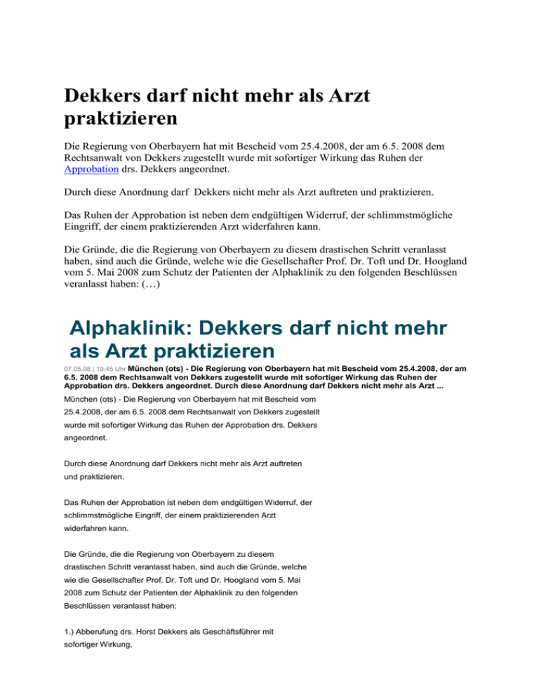 Dekkers darf nicht mehr als Arzt praktizieren Die Regierung von Oberbayern hat mit Bescheid vom 25.4.2008, der am 6.5. 2008 dem Rechtsanwalt von Dekkers zugestellt wurde mit sofortiger Wirkung das Ruhen der Approbation drs. Dekkers angeordnet. Durch diese Anordnung darf Dekkers nicht mehr als Arzt auftreten und praktizieren. Das Ruhen der Approbation ist neben dem endgültigen Widerruf, der schlimmstmögliche Eingriff, der einem praktizierenden Arzt widerfahren kann. Die Gründe, die die Regierung von Oberbayern zu diesem drastischen Schritt veranlasst haben, sind auch die Gründe, welche wie die Gesellschafter Prof. Dr. Toft und Dr. Hoogland vom 5. Mai 2008 zum Schutz der Patienten der Alphaklinik zu den folgenden Beschlüssen veranlasst haben: (…) Alphaklinik: Dekkers darf nicht mehr als Arzt praktizieren 07.05.08 | 19:45 Uhr München (ots) - Die Regierung von Oberbayern hat mit Bescheid vom 25.4.2008, der am 6.5. 2008 dem Rechtsanwalt von Dekkers zugestellt wurde mit sofortiger Wirkung das Ruhen der Approbation drs. Dekkers angeordnet. Durch diese Anordnung darf Dekkers nicht mehr als Arzt ... München (ots) - Die Regierung von Oberbayern hat mit Bescheid vom 25.4.2008, der am 6.5. 2008 dem Rechtsanwalt von Dekkers zugestellt wurde mit sofortiger Wirkung das Ruhen der Approbation drs. Dekkers angeordnet. Durch diese Anordnung darf Dekkers nicht mehr als Arzt auftreten und praktizieren. Das Ruhen der Approbation ist neben dem endgültigen Widerruf, der schlimmstmögliche Eingriff, der einem praktizierenden Arzt widerfahren kann. Die Gründe, die die Regierung von Oberbayern zu diesem drastischen Schritt veranlasst haben, sind auch die Gründe, welche wie die Gesellschafter Prof. Dr. Toft und Dr. Hoogland vom 5. Mai 2008 zum Schutz der Patienten der Alphaklinik zu den folgenden Beschlüssen veranlasst haben: 1.) Abberufung drs. Horst Dekkers als Geschäftsführer mit sofortiger Wirkung, 2.) Kündigung des Belegarztvertrages drs. Horst Dekkers, 3.) sofortiges Operationsverbot drs. Horst Dekkers in der Alphaklinik Das Ruhen der Approbation kann angeordnet werden, wenn gegen den betroffenen Arzt wegen des Verdachtes einer Straftat, aus dem sich seine Unwürdigkeit oder Unzuverlässigkeit ergeben kann, ein Strafverfahren eingeleitet ist oder dieser gesundheitlich (ggf. durch Sucht und/oder geistige oder körperliche Schwäche oder ähnliches) nicht mehr in der Lage ist, seinen Beruf ordnungsgemäss auszuüben bzw. Zweifel daran bestehen. Prof. Dr. Toft und Dr. Hoogland bedauern die Entwicklung. "Die Umstände waren für die Alphaklinik sehr belastend. Jetzt müssen wir wieder nach vorne sehen und wieder einen geregelten Ablauf auf hohem Niveau sicherstellen" so Toft. Die Münchner medizinrechtliche Sozietät Putz & Steldinger die das Verfahren gegen Dekkers am 27.2.2008 beantragt hatte, begrüßt die Entscheidung der Regierung von Oberbayern: "Künftige Fehlbehandlungen und Gefahren werden endlich wirksam unterbunden. Nun geht es darum, dass die bisherigen Opfer angemessen entschädigt werden." so Rechtsanwalt Putz. Originaltext: Alphaklinik GmbH Digitale Pressemappe: http://www.presseportal.de/pm/37889 Pressemappe via RSS : http://www.presseportal.de/rss/pm_37889.rss2 Pressekontakt: STADTGESPRÄCH - PUBLIC RELATIONS [DPRG] Orleansstrasse 34 81667 München Hakan Günay Tel.: +49 (0)89 961.644.60 Fax: +49 (0)89 961.644.59 E-Mail: [email protected] Internet: www.agenturstadtgespraech.de http://www.ad-hoc-news.de/alphaklinik-dekkers-darf-nicht-mehr-als-arzt-praktizieren-/de/Politik/16758895 Doctorandus an der Fräse Von Traufetter, Gerald Ein Promi-Chirurg aus München soll Patienten ohne medizinische Indikation an der Wirbelsäule operiert haben. Jetzt sieht er sich einer Klagewelle gegenüber. An den Tag, als die Zeit seines Leidens begann, kann sich Gerhard K. noch genau erinnern: Am 19. Oktober 2004 lag der Frankfurter Werbeunternehmer in einem Operationssaal in München. Wegen Rückenproblemen sollte er an der Halswirbelsäule operiert werden. Trotz der lokalen Betäubung spürte K. plötzlich einen heftigen Schmerz. Was los war, merkte der damals 67-Jährige erst, als man ihn nach der Operation auf die Beine stellte. K. knickte ein. Er spürte sein rechtes Bein nicht mehr. Der Chirurg jedoch habe ihn, ohne sich um die Lähmungserscheinungen zu kümmern, gleich am folgenden Tag zur nächsten Operation einbestellt, diesmal an einem Lendenwirbel. Anschließend entschwand er zu einem Kongress in den USA. Zehn Tage musste K. in der Klinik ausharren. Erst dann wurde er, auf dringende Intervention eines externen Facharztes, zur Notoperation in das Klinikum Bogenhausen gebracht. Die Lähmung hatte inzwischen das andere Bein und beide Arme erfasst. Noch heute kann K. sich kaum länger als zehn Minuten auf den Beinen halten. Was dem Firmenchef widerfahren sein soll, steht in einer Klageschrift, die derzeit vor dem Landgericht München I verhandelt wird. Der Beklagte heißt Horst Dekkers, Mitbesitzer der Münchner Alpha-Klinik. Er bestreitet, Fehler gemacht zu haben. Mehr noch: Dekkers ließ seinen Patienten von einem Detektivbüro beschatten, um ihn der Heuchelei zu überführen. "Wir haben auf Schadensersatz geklagt", sagt K.s Anwältin Marga Wolpert. Der Beklagte ist den Richtern der 9. Zivilkammer nicht unbekannt: Schon einmal wurde er hier zu Schadensersatz rechtskräftig verurteilt. Verblüffend erinnert die Urteilsbegründung an die Klageschrift im Fall K.: Ein erster Eingriff sei "medizinisch nicht indiziert" gewesen, und "als Folge dieser fehlerhaften Operation ergaben sich die beiden Folgeeingriffe ... die ebenso wenig geeignet waren, den Grundleiden des Klägers zu begegnen" (Aktenzeichen: 9 O 24834/04). Dekkers sieht auch hier keinen Fehler seinerseits - der Gerichtsgutachter habe eben nur den Standpunkt einer Ärztemehrheit vertreten. Nun aber muss sich der geschäftstüchtige Mediziner einer ganzen Flut von Klagen erwehren: "Ein starkes Dutzend Fälle", so der Sprecher der Kammer, T