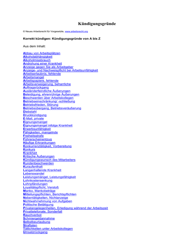 Kündigungsgründe © Neues Arbeitsrecht für Vorgesetzte, www.arbeitsrecht.org Korrekt kündigen: Kündigungsgründe von A bis Z Aus dem Inhalt: Abbau von Arbeitsplätzen Alkoholabhängigkeit Alkoholmissbrauch Androhung einer Krankheit Anzeige gegen Sie als Arbeitgeber Anzeige- und Nachweispflicht bei Arbeitsunfähigkeit Arbeitserlaubnis, fehlende Arbeitsmangel Arbeitspapiere, fehlende Arbeitsverweigerung, beharrliche Auftragsrückgang Ausländerfeindliche Äußerungen Beleidigung, ehrenrührige Äußerungen Beschwerden über Arbeitskollegen Betriebseinschränkung/ -schließung Betriebsfrieden, Störung Betriebsübergang, Betriebsveräußerung Diebstahl Druckkündigung E-Mail, private Eignungsmangel Eignungsmangel infolge Krankheit Erwerbsunfähigkeit Fähigkeiten, mangelnde Freiheitsstrafe Führerscheinentzug Häufige Erkrankungen Konkurrenztätigkeit, Vorbereitung Konkurs Krankheit Kritische Äußerungen Kündigungswunsch des Mitarbeiters Kundenbeschwerden Kuraufenthalt Langanhaltende Krankheit Lebenswandel Leistungsmängel, Leistungsfähigkeit Lohnkostensenkung Lohnpfändungen Loyalitätspflicht, Verstoß Manko, Mankobeträge Mitteilungspflichten, Berichtspflichten Nebentätigkeiten, Nichtanzeige Nichtwahrnehmung von Aufgaben Politische Betätigung Privatangelegenheiten, Erledigung während der Arbeitszeit Privattelefonate, Sonderfall Rauchverbot Schmiergeldannahme Selbstbeurlaubung Straftaten Tätlichkeiten unter Arbeitskollegen Umsatzrückgang Unentschuldigtes Fehlen Unerlaubte Einsicht in Personalakten/ unerlaubter EDV-Zugriff Unrentabilität Untersuchungshaft Urlaubsüberschreitung Verdacht (einer strafbaren Handlung) Verzögerung der Genesung Vortäuschen von Arbeitsunfähigkeit Wegfall des Arbeitsplatzes Wettbewerbstätigkeit Zuspätkommen Abbau von Arbeitsplätzen Der Abbau von Arbeitsplätzen spielt bei betriebsbedingten Kündigungen eine große Rolle. Es gehört zwar zu Ihrer unternehmerischen Entscheidungsfreiheit, die Anzahl der Arbeitsplätze in Ihrem Betrieb festzulegen, mit denen Sie Ihr geschäftliches Ziel verfolgen. Trotzdem reicht in einem Kündigungsschutzprozess Ihre Behauptung nicht aus, Sie hätten sich zu einem Abbau von Arbeitsplätzen entschlossen und deshalb Ihren Mitarbeitern gekündigt. Statt dessen müssen Sie im Einzelnen darlegen, wie sich Ihre unternehmerische Entscheidung auf die Anzahl der von Ihnen benötigten Arbeitsplätze auswirkt und warum Sie einen oder mehrere Mitarbeiter nicht mehr weiter beschäftigen können. Der Wegfall von Arbeitsplätzen muss also darauf beruhen, dass Sie Ihre unternehmerische Entscheidung (beispielsweise eine bestimmte Rationalisierungsmaßnahme) umgesetzt haben. In der gerichtlichen Praxis ist in diesem Zusammenhang häufig vom Begriff der Leistungsverdichtung die Rede. Das heißt, wenn Sie die Aufgaben Ihres Unternehmens in Zukunft mit weniger Mitarbeitern bewältigen wollen, müssen die verbleibenden Arbeitnehmer mehr leisten. Für Sie ist im Streitfall entscheidend, dass Sie darstellen können, wie die von dem gekündigten Mitarbeiter übernommenen Aufgaben in Zukunft verteilt werden. Beispiel: 2 statt 4 Mitarbeiter In Ihrem Betrieb beschäftigen Sie in einem Produktionssektor 4 Mitarbeiter in Vollschicht. Sie wollen die Abteilung unverändert fortbestehen lassen, aber aus Kostengründen die Arbeiten zukünftig nur noch von 2 Mitarbeitern verrichten lassen. Folge: Ihr bloßer Hinweis auf diese Personalentscheidung („2 statt 4 Mitarbeiter“) reicht nicht aus, um Ihre betriebsbedingte Kündigung wirksam zu machen. Vielmehr müssen Sie ein „dringendes betriebliches Erfordernis“ darlegen, das zum Wegfall der Arbeitsplätze von 2 Mitarbeitern führt. Dieses dringende betriebliche Erfordernis ist zwingend für die Annahme eines betriebsbedingten Kündigungsgrundes. Zusätzlich haben Sie darzustellen, wie die von den 2 gekündigten Mitarbeitern bisher verrichteten Arbeiten in Zukunft verteilt werden. Ihre Personalmaßnahme und die zukünftige Verteilung der Aufgaben, die Ihr gekündigter Mitarbeiter bisher erledigt hat, müssen Sie anhand eines Konzepts nachvollziehbar darlegen. Das können Sie beispielsweise in Form einer organisatorischen Änderung der Arbeitsabläufe, einer Produktionseinschränkung oder sonstiger tatsächlicher Rationalisierungsmaßnahmen (Landesarbeitsgericht (LAG) Düsseldorf, Urteil vom 18.11.1997, Aktenzeichen: 6 Sa 1329/97; in: Entscheidungen der Landesarbeitsgerichte (LAGE) Nr. 46 zu § 1 Kündigungsschutzgesetz (KSchG) Betriebsbedingte Kündigung). Teilzeitkräfte: Hier müssen Sie eine Sozialauswahl durchführen Ein spezielles Problem kann auftreten, wenn Sie sich aus betriebsbedingten Gründen von einer Teilzeitkraft trennen wollen, die die gleiche Tätigkeit wie Vollzeitkräfte erledigt. Bei jeder betriebsbedingten Kündigung haben Sie unter vergleichbaren Mitarbeitern eine soziale Auswahl zu treffen. Es kann daher sein, dass die Teilzeitkraft sozial schützenswerter ist als eine der Vollzeitkräfte. Beispiel: Kündigung einer Teilzeitkraft Sie betreiben ein Designstudio mit 8 Mitarbeitern. Neben Ihrer Teilzeitkraft Dora T. sind noch 3 Vollzeitkräfte mit dem Entwurf von Textilmustern beschäftigt. Sie beabsichtigen, in Zukunft nur noch Vollzeit-kräfte als Textilmustergestalter einzusetzen. Daher wollen Sie sich von Dora T. trennen. Dora T. ist jedoch älter und länger bei Ihnen beschäftigt als Claudia P., die als Vollzeitkraft Textilmuster entwirft. Folge: Dora T. und Claudia P. verrichten – mit Ausnahme der unterschiedlichen Arbeitszeit – identische Arbeiten. Sie müssen daher zwischen beiden eine soziale Auswahl vornehmen, die zu Ungunsten von Claudia P. ausfallen würde. Sie haben aber die unternehmerische Entscheidung getroffen, zukünftig nur noch Vollzeitkräfte als Textilmustergestalterinnen einzusetzen. Wenn Sie das – notfalls vor Gericht – im Einzelnen darlegen und Ihre Gründe für diese Entscheidung plausibel erklären können, müssen Sie die Sozialauswahl nicht