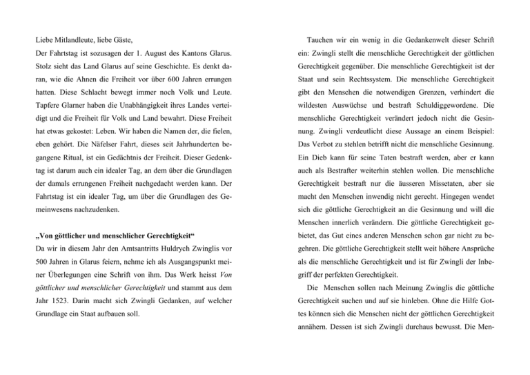 Liebe Mitlandleute, liebe Gäste, Tauchen wir ein wenig in die Gedankenwelt dieser Schrift Der Fahrtstag ist sozusagen der 1. August des Kantons Glarus. ein: Zwingli stellt die menschliche Gerechtigkeit der göttlichen Stolz sieht das Land Glarus auf seine Geschichte. Es denkt da- Gerechtigkeit gegenüber. Die menschliche Gerechtigkeit ist der ran, wie die Ahnen die Freiheit vor über 600 Jahren errungen Staat und sein Rechtssystem. Die menschliche Gerechtigkeit hatten. Diese Schlacht bewegt immer noch Volk und Leute. gibt den Menschen die notwendigen Grenzen, verhindert die Tapfere Glarner haben die Unabhängigkeit ihres Landes vertei- wildesten Auswüchse und bestraft Schuldiggewordene. Die digt und die Freiheit für Volk und Land bewahrt. Diese Freiheit menschliche Gerechtigkeit verändert jedoch nicht die Gesin- hat etwas gekostet: Leben. Wir haben die Namen der, die fielen, nung. Zwingli verdeutlicht diese Aussage an einem Beispiel: eben gehört. Die Näfelser Fahrt, dieses seit Jahrhunderten be- Das Verbot zu stehlen betrifft nicht die menschliche Gesinnung. gangene Ritual, ist ein Gedächtnis der Freiheit. Dieser Gedenk- Ein Dieb kann für seine Taten bestraft werden, aber er kann tag ist darum auch ein idealer Tag, an dem über die Grundlagen auch als Bestrafter weiterhin stehlen wollen. Die menschliche der damals errungenen Freiheit nachgedacht werden kann. Der Gerechtigkeit bestraft nur die äusseren Missetaten, aber sie Fahrtstag ist ein idealer Tag, um über die Grundlagen des Ge- macht den Menschen inwendig nicht gerecht. Hingegen wendet meinwesens nachzudenken. sich die göttliche Gerechtigkeit an die Gesinnung und will die Menschen innerlich verändern. Die göttliche Gerechtigkeit ge- „Von göttlicher und menschlicher Gerechtigkeit“ bietet, das Gut eines anderen Menschen schon gar nicht zu be- Da wir in diesem Jahr den Amtsantritts Huldrych Zwinglis vor gehren. Die göttliche Gerechtigkeit stellt weit höhere Ansprüche 500 Jahren in Glarus feiern, nehme ich als Ausgangspunkt mei- als die menschliche Gerechtigkeit und ist für Zwingli der Inbe- ner Überlegungen eine Schrift von ihm. Das Werk heisst Von griff der perfekten Gerechtigkeit. göttlicher und menschlicher Gerechtigkeit und stammt aus dem Die Menschen sollen nach Meinung Zwinglis die göttliche Jahr 1523. Darin macht sich Zwingli Gedanken, auf welcher Gerechtigkeit suchen und auf sie hinleben. Ohne die Hilfe Got- Grundlage ein Staat aufbauen soll. tes können sich die Menschen nicht der göttlichen Gerechtigkeit annähern. Dessen ist sich Zwingli durchaus bewusst. Die Men- schen sind auf die göttliche Unterstützung angewiesen. Die sollen sich vom Geist der göttlichen Gerechtigkeit erfüllen las- menschliche Gerechtigkeit soll sich auf die göttliche Gerechtig- sen und sich von ihr anstecken lassen. Es geht für Zwingli um keit ausrichten. Zwingli weist den Regierungen den besonderen die Frage nach der Ausrichtung der Politik. Während die Auftrag zu, sich um die Förderung der göttlichen Gerechtigkeit menschliche Gerechtigkeit das Schlimmste verhindert, verweist zu kümmern. Gerade die Christen sind nach Meinung Zwinglis die göttliche Gerechtigkeit auf Werte wie Grosszügigkeit, die besten Staatsbürger. Die wahren Christen sind innerlich neu- Nächstenliebe und Gemeinnutz. Die göttliche Gerechtigkeit er- orientiert und bedürfen der Strafe eigentlich gar nicht mehr. Für mahnt zum grosszügigen Dienst am Nächsten und verbietet die Zwingli muss daher die göttliche Gerechtigkeit die innere Benachteiligung der Mitmenschen. Die göttliche Gerechtigkeit Grundlage des Staates sein. will Gemeinnutz statt Eigennutz. Die göttliche Gerechtigkeit will den Dienst am Nächsten und keine egoistische Engstirnig- Die göttliche Gerechtigkeit – ein Leuchtturm keit. Die Schrift Von göttlicher und menschlicher Gerechtigkeit fragt nach den geistigen Grundlagen eines Gemeinwesens und gibt als In der Einsicht liegt die Kraft zum Guten. Antwort: Die göttliche Gerechtigkeit soll die Grundlage jedes Der Staat ist für Zwingli eine provisorische Ordnungsgrösse. Gemeinwesens sein. Will Zwingli einen totalitären Gottesstaat, Gott hat den Staat als Garant der öffentlichen Ordnung einge- in dem mit der Bibel regiert wird? Nein, die menschliche Ge- setzt. Der Staat soll durchgreifen und Missetäter bestrafen. Dass rechtigkeit, die der Staat verkörpert, ist für Zwingli zu schwach die menschliche Gerechtigkeit ihrer Aufgabe aber nachkommen und verändert die Menschen nicht. Die menschliche Gerechtig- kann, muss sie mit Personal und Mitteln ausgestattet werden. keit hat sich darum nach der göttlichen Gerechtigkeit auszurich- Polizei und Justiz benötigen genügend Ressourcen, um ihrer ten, denn nur sie verändert die Menschen. Die göttliche Gerech- Aufgaben zu erfüllen. Im Kanton Glarus – so gewinne ich den tigkeit ist der Leuchtturm für die menschliche Gerechtigkeit. Eindruck - soll gerade bei der konkreten Umsetzung der Zwingli will keinen Himmel auf Erden. Der Staat soll nicht mit der Bibel als Gesetzbuch regieren, sondern die Gesetzgeber menschlichen Gerechtigkeit gespart werden. Trotz wachsender Aufgabenlast erhält die Polizei kaum zusätzliche Mittel. Ebenso Die göttliche Gerechtigkeit relativiert die menschliche Ge- sollen die Gerichte sparen, obwohl die Last der Fälle zunimmt. rechtigkeit Zwingli sieht durchaus die Grenzen der menschlichen Ge- Die göttliche Gerechtigkeit relativiert die menschliche Gerech- rechtigkeit: Es macht keinen Sinn, an jeder Ecke einen Polizis- tigkeit. Der Staat ist eine provisorische Ordnungsgrösse, die für ten zu postieren und die Strafen zu verschärfen. Der ehemalige die menschliche Gerechtigkeit zuständig ist. Der Staat ist keine Glarner Pfarrer hält die Erziehung auf der Grundlage der göttli- Ersatzreligion, der eine eigene göttliche Gerechtigkeit verkör- chen Gerechtigkeit für sinnvoller. Die Menschen können nur das pern will. Gegenüber einem solchen Staat gilt a