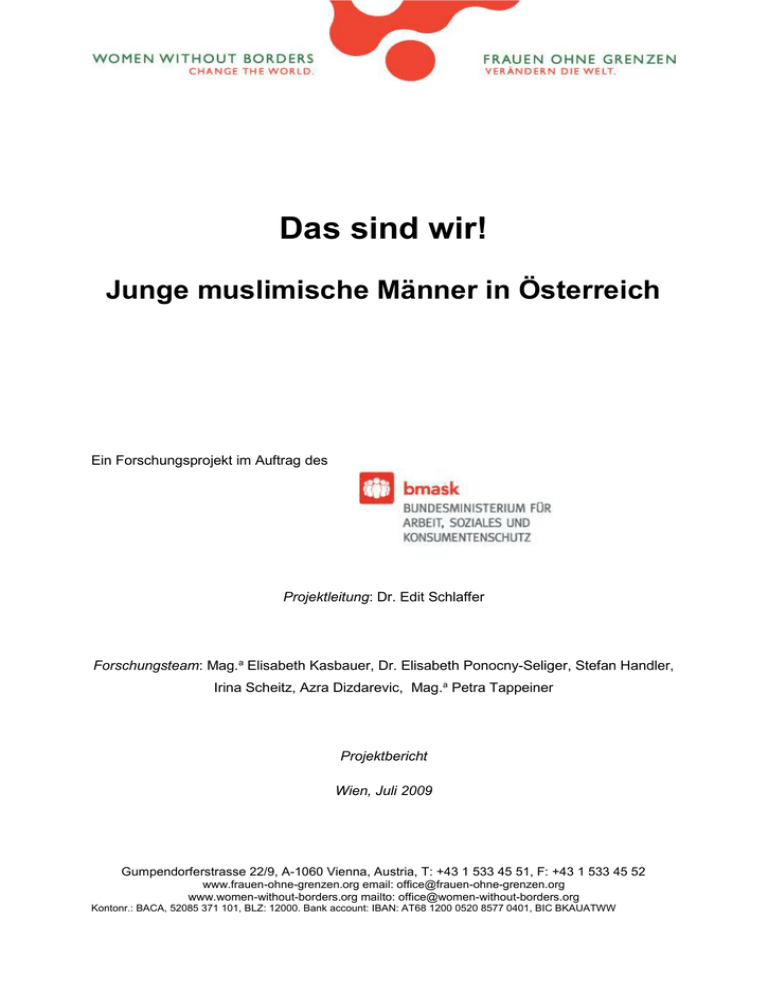 Das sind wir! Junge muslimische Männer in Österreich Ein Forschungsprojekt im Auftrag des Projektleitung: Dr. Edit Schlaffer Forschungsteam: Mag.a Elisabeth Kasbauer, Dr. Elisabeth Ponocny-Seliger, Stefan Handler, Irina Scheitz, Azra Dizdarevic, Mag.a Petra Tappeiner Projektbericht Wien, Juli 2009 Gumpendorferstrasse 22/9, A-1060 Vienna, Austria, T: +43 1 533 45 51, F: +43 1 533 45 52 www.frauen-ohne-grenzen.org email: [email protected] www.women-without-borders.org mailto: [email protected] Kontonr.: BACA, 52085 371 101, BLZ: 12000. Bank account: IBAN: AT68 1200 0520 8577 0401, BIC BKAUATWW Inhaltsverzeichnis Einleitung S. 4 1. Beschreibung der Stichprobe 1.1. Zusammensetzung der Stichprobe und Methodik 1.2. Soziodemographische Merkmale S. 6 S. 6 S. 6 2. Ausbildung und Beruf: Wunsch und Wirklichkeit S. 9 3. Die Lebensplanung: ein ambivalenter Blick in die Zukunft S. 12 4. Einstellungen zum anderen Geschlecht S. 16 5. Heimatgefühle in Transit S. 21 6. Das macht uns Sorgen, das macht uns Spaß S. 25 7. Der Blick auf „die anderen“ und das eigene soziale Netz S. 31 8. Religion, Demokratie und Politik S. 34 9. Mein Leben in Österreich S. 39 10. Stimmen der muslimischen Jugendlichen zu Religion S. 40 11. Stimmen der muslimischen Jugendlichen zu Politik und Medien S. 44 12. Stimmen der muslimischen Jugendlichen zu Geschlechterrollen und Familienbildern S. 46 13. Vorschläge für Maßnahmen S. 49 14. Zusammenfassung S. 50 Literatur S. 52 Anhang – Tabellen S. 57 2 Abbildungsverzeichnis Abbildung1:Religionszugehörigkeit der Kontrollgruppe……………………………….....7 Abbildung 2: Sonntagsfrage ........................................................................................9 Abbildung 3: Ausbildung und Beruf ........................................................................... 11 Abbildung 4: Lebensplanung .....................................................................................15 Abbildung 5: Die zukünftige Ehefrau ......................................................................... 17 Abbildung 6: Einstellung zum anderen Geschlecht ................................................... 20 Abbildung 7: Heimatgefühle in Transit und Medien ................................................... 22 Abbildung 8: Rauchen, Alkohol, Schweinefleisch ...................................................... 23 Abbildung 9: Meine Wunschliste ................................................................................ 24 Abbildung 10: Darüber mache ich mir Sorgen ........................................................... 26 Abbildung 11: Selbsteinschätzung ............................................................................ 27 Abbildung 12: Ich lese eine österreichische Zeitung .................................................. 29 Abbildung 13: Freizeitbeschäftigung .......................................................................... 30 Abbildung 14: Mein soziales Netz .............................................................................. 33 Abbildung 15: Religion ............................................................................................... 37 Abbildung 16: Demokratie ......................................................................................... 38 Abbildung 17: Mein Leben in Österreich .................................................................... 40 3 Einleitung Schätzungen zufolge bekennen sich in Österreich heute etwa 400.000 Menschen zum Islam. Der Großteil davon besitzt die türkische Staatsbürgerschaft, gefolgt von Österreich und dem ehemaligen Jugoslawien. Fast die Hälfte der muslimischen Bevölkerung ist unter 25, fast ein Drittel zwischen 25 und 39 Jahren. Die letzten statistischen Daten stammen von der Volkszählung 2001, damals lebten in Österreich 338.998 MuslimInnen. Den höchsten muslimischen Bevölkerungsanteil hat Vorarlberg, gefolgt von Wien, Salzburg, Oberösterreich und Tirol. Im Burgenland sind lediglich 1,6 % MuslimInnen registriert. Der Islam stellt die am schnellsten wachsende Religionsgemeinschaft dar. Die Zahl der MuslimInnen in Österreich hat sich seit 1991 verdoppelt und sie sind damit die zweitgrößte Bevölkerungsgruppe des Landes. Auf europäischer Basis wird Österreichs Islamdialog als modellhaft angesehen, hat jedoch auch das Etikett „Donau-Islam“, was unter anderem aus den Erfahrungen ÖsterreichUngarns resultiert.1 Das Islamgesetz von 1910 garantiert freie und öffentliche Religionsausübung und die 1979 gegründete islamischen Glaubensgemeinschaft (IGGiÖ) stellt die offizielle Vertretung der MuslimInnen in Österreich dar. Österreich hat in den letzten Jahren eine Reihe von Einrichtungen für im Land lebende MuslimInnen etabliert; beispielsweise ist es der jungen muslimischen Generation möglich, vom Kindergarten bis zur Fachschule eine Ausbildung an islamischen Bildungseinrichtungen zu absolvieren. Die internationale Literatur spricht hier von einem „Muslim space“, einem eigenen Raum, den sich die MuslimInnen für das tägliche Leben geschaffen haben: von Bildungseinrichtungen über Lebensmittelgeschäfte, Gebetsräumlichkeiten bis zu Kulturzentren, die auch umstritten sind. Muslimische Frauen sind im Fokus der Aufmerksamkeit; sie erfahren Unterstützung, haben Anlaufstellen und Diskussionsforen. Die heranwachsenden männlichen muslimischen Jugendlichen hingegen werden häufig mit Skepsis betrachtet, sich selbst überlassen und als potentielle Hardliner etikettiert. Die jungen muslimischen Männer müssen gezielt in den Dialog der Kulturen eingebunden werden. Dieses Projekt soll einen Beitrag leisten, die Lebensrealitäten der jungen muslimischen Männer kennen zu lernen und sie dabei zu unterstützen, in der österreichischen Gesellschaft „anzukommen“. 1 vgl. Potz, Richard: Islamischer Religionsunterreicht in Österreich und Deutschland. Bericht zu einem Forschungsprojekt, ÖNB, Wien 2005 4 Ideologische Differenzen müssen ernst genom