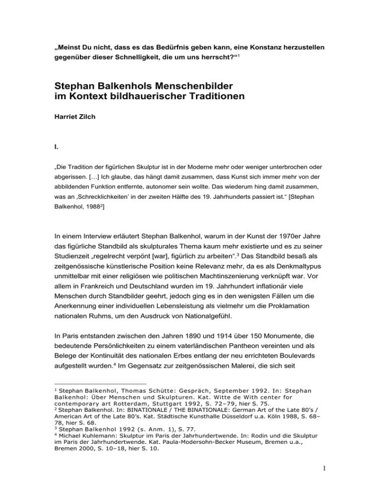 „Meinst Du nicht, dass es das Bedürfnis geben kann, eine Konstanz herzustellen gegenüber dieser Schnelligkeit, die um uns herrscht?“1 Stephan Balkenhols Menschenbilder im Kontext bildhauerischer Traditionen Harriet Zilch I. „Die Tradition der figürlichen Skulptur ist in der Moderne mehr oder weniger unterbrochen oder abgerissen. […] Ich glaube, das hängt damit zusammen, dass Kunst sich immer mehr von der abbildenden Funktion entfernte, autonomer sein wollte. Das wiederum hing damit zusammen, was an ‚Schrecklichkeiten’ in der zweiten Hälfte des 19. Jahrhunderts passiert ist.“ [Stephan Balkenhol, 19882] In einem Interview erläutert Stephan Balkenhol, warum in der Kunst der 1970er Jahre das figürliche Standbild als skulpturales Thema kaum mehr existierte und es zu seiner Studienzeit „regelrecht verpönt [war], figürlich zu arbeiten“.3 Das Standbild besaß als zeitgenössische künstlerische Position keine Relevanz mehr, da es als Denkmaltypus unmittelbar mit einer religiösen wie politischen Machtinszenierung verknüpft war. Vor allem in Frankreich und Deutschland wurden im 19. Jahrhundert inflationär viele Menschen durch Standbilder geehrt, jedoch ging es in den wenigsten Fällen um die Anerkennung einer individuellen Lebensleistung als vielmehr um die Proklamation nationalen Ruhms, um den Ausdruck von Nationalgefühl. In Paris entstanden zwischen den Jahren 1890 und 1914 über 150 Monumente, die bedeutende Persönlichkeiten zu einem vaterländischen Pantheon vereinten und als Belege der Kontinuität des nationalen Erbes entlang der neu errichteten Boulevards aufgestellt wurden.4 Im Gegensatz zur zeitgenössischen Malerei, die sich seit Stephan Balkenhol, Thomas Schütte: Gespräch, September 1992. In: Stephan Balkenhol: Über Menschen und Skulpturen. Kat. Witte de With center for contemporary art Rotterdam, Stuttgart 1992, S. 72–79, hier S. 75. 2 Stephan Balkenhol. In: BINATIONALE / THE BINATIONALE: German Art of the Late 80’s / American Art of the Late 80’s. Kat. Städtische Kunsthalle Düsseldorf u.a. Köln 1988, S. 68– 78, hier S. 68. 3 Stephan Balkenhol 1992 (s. Anm. 1), S. 77. 4 Michael Kuhlemann: Skulptur im Paris der Jahrhundertwende. In: Rodin und die Skulptur im Paris der Jahrhundertwende. Kat. Paula-Modersohn-Becker Museum, Bremen u.a., Bremen 2000, S. 10–18, hier S. 10. 1 1 Jahrzehnten von den akademischen Vorgaben löste, erwies sich die Bildhauerei des Historismus als fortschrittsresistent. Sie hielt an kanonisierten Formidealen fest, so dass Baudelaire bereits 1846 erläuterte, warum „die Bildhauerei ein Ärgernis“5 sei. Auch Deutschland erlebte während des Kaiserreiches 1871 bis 1918 eine Denkmalflut: Zu Ehren Kaiser Wilhelms I. wurden nach dessen Tod 1888 eine große Zahl von Statuen und Reiterstandbildern errichtet, und um den 1890 entlassenen Reichskanzler Bismarck entwickelte sich eine nahezu kultische Verehrung. Bis 1914 wurden in Deutschland über 500 Denkmäler errichtet: Gedenksteine, Porträtbüsten, Standbilder und Reliefs sowie die so genannten „Bismarck-Türme“. In jüngster Zeit assoziieren sich Standbilder zumeist mit den massenmedial genutzten Bildern ihres Sturzes: stürzende Leninfiguren, die als Zeugnisse eines posthumen, politisch initiierten Personenkultes ihre Existenzberechtigung in einem wiedervereinigten Deutschland verloren zu haben schienen. Den Mensch und Diktator Saddam Hussein sahen wir ebenso stürzen wie im April 2003 seinen gigantischen bronzenen Repräsentanten. Diese Statue war Ausdruck einer Machtinszenierung, die sich heute gedanklich vor allem mit diktatorischen Ländern verbindet; Insignien der Macht, deren Aufstellung, aber auch Sturz, politisch inszeniert und manipulativ genutzt werden: die Renaissance eines politisch motivierten Ikonoklasmus. Diese Stichworte verdeutlichen: Insbesondere der Denkmaltypus des Standbildes wurde sowohl in der Vergangenheit als auch in der Gegenwart für religiöse und politische Darstellungen ge- und missbraucht und erscheint dahin gehend „vorbelastet“. Stephan Balkenhol weiß von dieser Gefahr. Interviews zeugen von einer intensiven gedanklichen Auseinandersetzung. Fotografien und Zeichnungen, die in den 1980er Jahren in den Museen von Kairo, Kopenhagen, London, Hamburg, München, Paris und Rom entstehen, dokumentieren sein Interesse an der Geschichte der figürlichen Skulptur. Dabei ist es kein Zufall, dass eigenes künstlerisches Interesse an der Figur und Studium der Bildhauereigeschichte zeitgleich einsetzen. In einem der ersten öffentlichkeitswirksamen Großprojekte – der Skulpturenausstellung im Hamburger Jenisch-Park6 – orientiert sich Stephan Balkenhol 1986 in seinem Beitrag gerade an dem Denkmaltypus, der historisch besonders eng mit einer politischen Machtinszenierung verknüpft ist, dem Reiterdenkmal. Ähnlich dem Personendenkmal wurden Reiterstandbilder zur Manifestation einer amtlichen Autorität errichtet. Dabei ist die symbolische Aussagekraft eindeutig: Der reitende Herrscher sitzt fest in seinem Sattel und hält mit den Zügeln die Geschicke seines Landes und Vgl. Friedhelm Kemp, Claude Pichois (Hg.): Charles Baudelaire: Sämtliche Werke / Briefe. Frankfurt a.M. 1977, S. 273–276, hier S. 273. 6 Jenisch-Park-Skulptur, Kulturbehörde Hamburg, 1. Juni bis 30. November 1986. 5 2 seiner Untertanen in den Händen. Jedoch finden wir in Stephan Balkenhols „Reiter“ keinen Regenten hoch zu Ross, sondern einen unbenennbaren und unbenannten Mann, der attributlos und ohne pathetische Geste auf seinem Pferd sitzt. Reiter und Pferd präsentiert Balkenhol unterlebensgroß auf einer tischähnlichen Standfläche und steigert auf diesem Weg die Absurdität seines „Reiterstandbildes“. Er orientiert sich zwar an der Denkmaltradition, die Figur jedoch bleibt durch die Negierung sämtlicher Pathosformeln schlicht ein „Reiter“. Im Folgejahr positioniert der Künstler – als Beitrag zur Ausstellung „Skulptur.Projekte in Münster 1987“7 