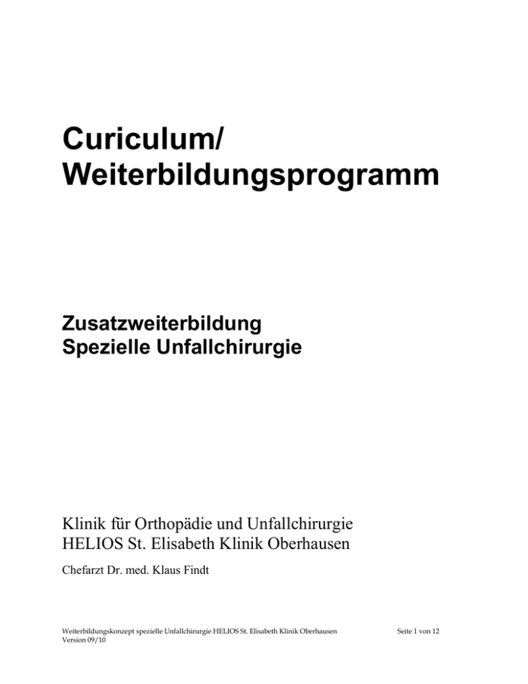 Curiculum/ Weiterbildungsprogramm Zusatzweiterbildung Spezielle Unfallchirurgie Klinik für Orthopädie und Unfallchirurgie HELIOS St. Elisabeth Klinik Oberhausen Chefarzt Dr. med. Klaus Findt Weiterbildungskonzept spezielle Unfallchirurgie HELIOS St. Elisabeth Klinik Oberhausen Version 09/10 Seite 1 von 12 1. Rahmenbedingungen der Ausbildung 1.1 Weiterbildungsordnung der Ärztekammer Nordrhein Die Weiterbildungsordnung (WBO) der Ärztekammer Nordrhein (ÄKNO) gilt gemäß den Beschlüssen der Kammerversammlungen der Ärztekammer Nordrhein vom 20. März und 20. November 2004, 12. Februar 2005 sowie vom 18. Juni 2005. Es erfolgte eine Änderung am 19. April 2008. Genehmigt ist sie durch Erlass des Ministeriums für Arbeit, Gesundheit und Soziales des Landes Nordrhein-Westfalen vom 30. Juni 2008 - C2 - 0810.47. Die aktuell gültige WBO ist am 1. Oktober 2008 in Kraft getreten. Diese WBO sieht eine strukturierte Weiterbildung der Ärzte, basierend auf dem jeweiligen Ausbildungsstand vor. Das vorliegende Weiterbildungskonzept orientiert sich an der WBO der ÄKNO. Dieses Weiterbildungskonzept definiert sowohl die zu vermittelnden Inhalte, als auch den zeitlichen Rahmen der Weiterbildung in der Ausbildung zu Facharzt für Orthopädie und Unfallchirurgie und der Zusatzweiterbildung spezielle Unfallchirurgie in unserer Klinik. Der Einfachheit halber wird in den weiteren Ausführungen nur die männliche Form verwendet. Sie steht stellvertretend für alle männlichen und weiblichen Personen. 1.2 Weiterbildungsstätte Die Klinik für Orthopädie und Unfallchirurgie der HELIOS St. Elisabeth Klinik Oberhausen stellt die Behandlung verletzter Patienten und von Patienten mit Erkrankungen des Bewegungsapparates im Oberhausener Süden sicher. Darüber hinaus hat die Klinik für Orthopädie und Unfallchirurgie der HELIOS St. Elisabeth Klinik Oberhausen ein überregionales Einzugsgebiet. Die Klinik verfügt über 36 Betten. Weitere Betten werden bei Bedarf belegt. Für die Behandlung privat versicherter Patienten stehen zusätzliche Betten in den Räumlichkeiten der HELIOS Privatkliniken GmbH zur Verfügung. In 2008 wurden insgesamt 1650 und im Jahre 2009 insgesamt 1857 Patienten ganz überwiegend operativ stationär in der Klinik für Orthopädie und Unfallchirurgie behandelt. Hinzu kamen 2011 ca. 250 ambulante Operationen bei insgesamt ca.15000 ambulant behandelten Patienten. Im Jahr 2011 werden mehr als 2100 Patienten stationär behandelt. Die Anzahl der behandelten Patienten wurde somit in den letzten Jahren kontinuierlich und erheblich gesteigert. Die durchschnittliche Verweildauer beträgt dabei ca. 5,6 Tage. Die Zulassung zum D-Arzt Verfahren der Berufsgenossenschaften liegt vor. Das operative Spektrum der Klinik umfasst die gesamte rekonstruktive Unfallchirurgie der Extremitäten, der Wirbelsäule und des Beckens. Weitere Schwerpunkte der Klinik liegen in der orthopädischen Weiterbildungskonzept spezielle Unfallchirurgie HELIOS St. Elisabeth Klinik Oberhausen Version 09/10 Seite 2 von 12 Chirurgie. Hervorzuheben sind die Endoprothetik der großen und kleinen Gelenke, die arthroskopische Knie- und Schultergelenkchirurgie und die Fußchirurgie. Eine Knochenbank wird in der Klinik betrieben. Die Primär- und Revisions- Endoprothetik des Hüft- und Kniegelenkes erfolgt nach anerkannten Konzepten. In der Regel kommen minimalinvasive Techniken, bei Bedarf unter Zuhilfenahme von Navigationssystemen zur Anwendung. In der Schulterchirurgie werden alle etablierten Techniken zum Gelenkerhalt und zur Endoprothetik in hoher Frequenz eingesetzt. Die Fußchirurgie ist nach funktionellen Gesichtspunkten ausgerichtet. Sie wird sowohl am Rück als auch am Vorfuß inklusive der Endoprothetik des oberen Sprunggelenkes vorgenommen. Es werden alle gängigen arthroskopischen Techniken der Kniegelenkchirurgie wie vordere und hintere Kreuzbandplastiken; Plastiken des medialen Patellofemoralen Bandes, Meniskusnähte, Knorpelknochentransplantationen, Meniskustransplantationen und Knorpelersatztherapien regelmäßig durchgeführt. In Kooperation mit dem in der Klinik ansässigen Therapädicum (Physiotherapie), sowie dem zur Klinik gehörigen Institut für Sportorthopädie und Sportkardiologie werden neben Breitensportlern zahlreiche Spitzen- und Profisportler des Olympiastützpunktes Rhein Ruhr und verschiedener Sportvereine der Region im Rahmen täglicher Sportlersprechstunden Sportmedizinisch betreut. Die Behandlung schwerverletzter Patienten erfolgt in Kooperation mit der Klinik für Anästhesie und der Klinik für Chirurgie. Eine nach modernen Standards ausgestattete und geführte interdisziplinäre Intensivstation mit 8 Bettplätzen steht zur Verfügung. Im Ausnahmefall (z.B. Großschadensfall, MANV) können dort 2 weitere Bettenplätze belegt werden. Im April 2010 erfolgte die Zertifizierung als lokales Traumazentrum für die Teilnahme am Traumanetzwerk Ruhrgebiet. Die Implementierung des Traumanetzwerkes Ruhrgebiet ist in den nächsten Monaten vorgesehen. Für die Notfallbehandlung steht die interdisziplinäre Notaufnahme mit einem großen Schockraum zur Verfügung. Die Untersuchung und Behandlung elektiver ambulanter Patienten wird in einer räumlich getrennten Ambulanz vorgenommen. Im Hause befindet sich über 24 Stunden ein Präsenslabor mit Blutdepot. Die Intensivstation stellt ein Reanimations-Team, welches bei Notfällen im Hause, in Zusammenarbeit mit dem diensthabenden Arzt der Klinik, die Versorgung im Sinne eines ALS (Advanced life support nach den aktuellen ERC Guidelines) sicherstellt. Weiterbildungskonzept spezielle Unfallchirurgie HELIOS St. Elisabeth Klinik Oberhausen Version 09/10 Seite 3 von 12 1.3 Weiterbildungsstellen Die Weiterbildungsteilnehmer streben die Zusatzweiterbildung spezielle Unfallchirurgie an. Die Arbeitszeit der Ärzte in Weiterbildung beträgt im Rahmen einer 40 Stunden Woche jeweils 8 Stunden im Tagdienst. Hinzukommen interdisziplinäre Bereitschaftsdienste zusammen mit der Klinik f