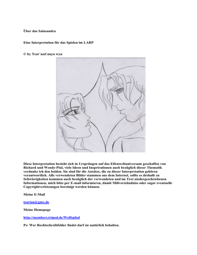 Über das Salasandra Eine Interpretation für das Spielen im LARP © by Tear´asel nuya wyn Diese Interpretation bezieht sich in Ursprüngen auf das Elfenweltuniversum geschaffen von Richard und Wendy-Pini, viele Ideen und Insprirationen auch bezüglich dieser Thematik verdanke ich den beiden. Sie sind für die Ansätze, die zu dieser Interpretation gehören verantwortlich. Alle verwendeten Bilder stammen aus dem Internet, sollte es deshalb zu Schwierigkeiten kommen auch bezüglich der verwendeten und im Text niedergeschriebenen Informationen, mich bitte per E-mail informieren, damit Mißverständniss oder sogar eventuelle Copyrightverletzungen bereinigt werden können. Meine E-Mail [email protected] Meine Homepage http://members.tripod.de/Wolfspfad Ps: Wer Rechtschreibfehler findet darf sie natürlich behalten. Inhaltsverzeichnis Vorwort............................................................................................................................................ 3 Bevor es mit dem Seelenband losgeht ..................................................................... 3 Das TAM ............................................................................................ 3 Das SENDEN ..................................................................................... 4 Allgemeines zum Seelenband ......................................................................................... 5 Die Arten eines Seelenbandes bei Elben ............................................................... 5 Eine nicht permanente Geistverschmelzung (Salasandra) ................. 5 Das „Erkennen“ .................................................................................. 7 ein freiwilliges von beiden Parteien geschlossenes „Seelenband“ .... 9 die Entreißung eines Seelennamens (Seelenraub) .............................. 9 Wie funktioniert ein einfaches Salasandra ....................................................... 10 Eine kleine Anleitung ....................................................................... 10 1. das spirituelle Erkennen............................................................. 11 2. das emotionale Senden .............................................................. 11 3. das Erleben des Salasandra ........................................................ 11 4. der Austausch der Erinnerungen und Gefühle .......................... 12 5. die innere Stärke ........................................................................ 12 Vorteile eines einfachen Salasandra ................................................. 12 Nachteile eines einfaches Salasandra ............................................... 13 Menschen, Elben und das Salasandra in all seinen Formen .............. 13 Vorwort Salasandra [saala sandra] = bedeutet aus dem Isdira (der Dsa-Sprache der Elben) übersetzt die Verschmelzung des Geistes oder der Seele. Über das sog. Seelenband kann man, wird es im Larp gebräuchlich, viel spektakuläres erfahren, jedoch auch durch die unzähligen Definitionen, die ein solches Seelenband beschreibt, viel falsch machen. Ich habe deshalb für alle daynitischen Elben, so wie als Prototyp meinen eigenen LarpCharakter, ein allgemeingültigen Leitfaden beschrieben, der helfen soll, dieses wunderbare Geschenk eines Seelenband richtig anzuwenden, sein Geschenk zu würdigen und ihm in-time gesehen, den nötigen Respekt, sowie den tatsächlichen Gebrauch eines solchen Bandes näher zu bringen. Es wird nämlich auf gut deutsch mehr als nur ein wenig Bockmist praktiziert. Bevor es mit dem Seelenband losgeht Ein Seelenband besitzt natürlich abgesehen von seiner eigentlichen Definition viele Möglichkeiten seiner Aufnahme und Darstellung. Aber wie alle Wege und deren Verzweigungen gibt es natürlich immer einen Ausgangspunkt, also eine grundsätzliche Definition, die ein solches Band klar beschreibt. Bevor man aber das eigentliche Seelenband in seinen Grundzügen erklären kann, bedarf es der Beschreibung zweier Faktoren, ohne die ein Seelenband nämlich gar nicht möglich wäre, ganz gleich wie es geschlossen wurde. 1. Das TAM 2. Das SENDEN Das TAM Jeder Elb, der an einem Selenband „beteiligt“ ist, ganz gleich welcher Art, muss ein sog. TAM besitzen, auch oft unter dem Begriff des „dritten Namens“ in der elbischen Welt erklärt wird. Allerdings muss der beteiligte Elb seinen Namen noch nicht kennen, er muss nur Gewissheit besitzen, ein TAM sein Eigen nennen zu können. Ist dies nicht der Fall und er nimmt an einem Salasandra teil, also an einer einfachen Geistverschmelzung, würde das den anderen Elben nichts ausmachen, wohl aber dem Elb, dem sein TAM fehlt. Er würde sich seiner inneren Leere bewusst werden, einer gewaltigen Leere, in der das TAM aller anderen beteiligten Elben widerhallt. Ich würde sagen, ein Elb ohne TAM, sollte seinen eigenen Freitod ab diesem Zeitpunkt mehr als nur befürworten. Aber das bleibt jedem Charakter frei auszuspielen. So jetzt wieder zurück zum Thema. Das TAM ist die Begrifflichkeit, die ich im weiteren Textverlauf benutzen möchte. Ein TAM macht einen Elben eigentlich erst zu dem was er ist. Es macht ihn gänzlich aus, ein Name, den jeder Elb im Laufe seines Erwachsenwerdens und seiner Lebenserfahrung in sich trägt und den er erst noch erkennen muss. Dieser Name ist unveränderlich und schließt in seinem Laut die ganze Wesenheit eines Elben ein. So könnte man eine einfache Rechnung aufstellen: TAM = Seele eines Elben Das TAM ist somit die größte Unantastbarkeit eines Elben, denn es ist alles was ihn ausmacht, alles was er von Geburt an war ist und immer sein wird. Ein Seelenname ist von Anfang vorhanden, jedoch nicht immer offensichtlich. Einige Elben werden erst ein paar Jahrhunderte alt, ehe sich ihr Seelenname offenbart. Dies geschieht selten durch Fremdeinwirkung, meist durch sich selbst. Gerade im LARP bleibt es jedem Charakter vorenthalten, sein inneres Erkennen auszuarbeiten und schließlich auszuspielen. Ein inn