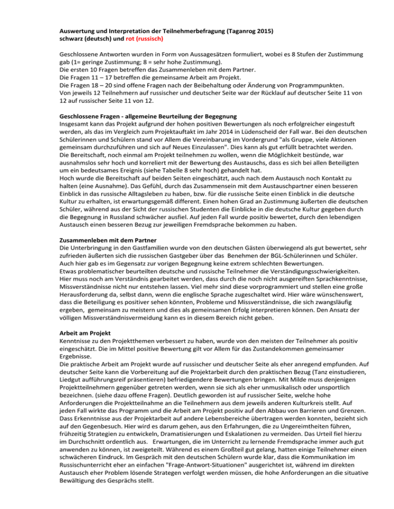Auswertung und Interpretation der Teilnehmerbefragung (Taganrog 2015) schwarz (deutsch) und rot (russisch) Geschlossene Antworten wurden in Form von Aussagesätzen formuliert, wobei es 8 Stufen der Zustimmung gab (1= geringe Zustimmung; 8 = sehr hohe Zustimmung). Die ersten 10 Fragen betreffen das Zusammenleben mit dem Partner. Die Fragen 11 – 17 betreffen die gemeinsame Arbeit am Projekt. Die Fragen 18 – 20 sind offene Fragen nach der Beibehaltung oder Änderung von Programmpunkten. Von jeweils 12 Teilnehmern auf russischer und deutscher Seite war der Rücklauf auf deutscher Seite 11 von 12 auf russischer Seite 11 von 12. Geschlossene Fragen - allgemeine Beurteilung der Begegnung Insgesamt kann das Projekt aufgrund der hohen positiven Bewertungen als noch erfolgreicher eingestuft werden, als das im Vergleich zum Projektauftakt im Jahr 2014 in Lüdenscheid der Fall war. Bei den deutschen Schülerinnen und Schülern stand vor Allem die Vereinbarung im Vordergrund "als Gruppe, viele Aktionen gemeinsam durchzuführen und sich auf Neues Einzulassen". Dies kann als gut erfüllt betrachtet werden. Die Bereitschaft, noch einmal am Projekt teilnehmen zu wollen, wenn die Möglichkeit bestünde, war ausnahmslos sehr hoch und korreliert mit der Bewertung des Austauschs, dass es sich bei allen Beteiligten um ein bedeutsames Ereignis (siehe Tabelle 8 sehr hoch) gehandelt hat. Hoch wurde die Bereitschaft auf beiden Seiten eingeschätzt, auch nach dem Austausch noch Kontakt zu halten (eine Ausnahme). Das Gefühl, durch das Zusammensein mit dem Austauschpartner einen besseren Einblick in das russische Alltagsleben zu haben, bzw. für die russische Seite einen Einblick in die deutsche Kultur zu erhalten, ist erwartungsgemäß different. Einen hohen Grad an Zustimmung äußerten die deutschen Schüler, während aus der Sicht der russischen Studenten die Einblicke in die deutsche Kultur gegeben durch die Begegnung in Russland schwächer ausfiel. Auf jeden Fall wurde positiv bewertet, durch den lebendigen Austausch einen besseren Bezug zur jeweiligen Fremdsprache bekommen zu haben. Zusammenleben mit dem Partner Die Unterbringung in den Gastfamilien wurde von den deutschen Gästen überwiegend als gut bewertet, sehr zufrieden äußerten sich die russischen Gastgeber über das Benehmen der BGL-Schülerinnen und Schüler. Auch hier gab es im Gegensatz zur vorigen Begegnung keine extrem schlechten Bewertungen. Etwas problematischer beurteilten deutsche und russische Teilnehmer die Verständigungsschwierigkeiten. Hier muss noch am Verständnis gearbeitet werden, dass durch die noch nicht ausgereiften Sprachkenntnisse, Missverständnisse nicht nur entstehen lassen. Viel mehr sind diese vorprogrammiert und stellen eine große Herausforderung da, selbst dann, wenn die englische Sprache zugeschaltet wird. Hier wäre wünschenswert, dass die Beteiligung es positiver sehen könnten, Probleme und Missverständnisse, die sich zwangsläufig ergeben, gemeinsam zu meistern und dies als gemeinsamen Erfolg interpretieren können. Den Ansatz der völligen Missverständnisvermeidung kann es in diesem Bereich nicht geben. Arbeit am Projekt Kenntnisse zu den Projektthemen verbessert zu haben, wurde von den meisten der Teilnehmer als positiv eingeschätzt. Die im Mittel positive Bewertung gilt vor Allem für das Zustandekommen gemeinsamer Ergebnisse. Die praktische Arbeit am Projekt wurde auf russischer und deutscher Seite als eher anregend empfunden. Auf deutscher Seite kann die Vorbereitung auf die Projektarbeit durch den praktischen Bezug (Tanz einstudieren, Liedgut aufführungsreif präsentieren) befriedigendere Bewertungen bringen. Mit Milde muss denjenigen Projektteilnehmern gegenüber getreten werden, wenn sie sich als eher unmusikalisch oder unsportlich bezeichnen. (siehe dazu offene Fragen). Deutlich geworden ist auf russischer Seite, welche hohe Anforderungen die Projektteilnahme an die Teilnehmern aus dem jeweils anderen Kulturkreis stellt. Auf jeden Fall wirkte das Programm und die Arbeit am Projekt positiv auf den Abbau von Barrieren und Grenzen. Dass Erkenntnisse aus der Projektarbeit auf andere Lebensbereiche übertragen werden konnten, bezieht sich auf den Gegenbesuch. Hier wird es darum gehen, aus den Erfahrungen, die zu Ungereimtheiten führen, frühzeitig Strategien zu entwickeln, Dramatisierungen und Eskalationen zu vermeiden. Das Urteil fiel hierzu im Durchschnitt ordentlich aus. Erwartungen, die im Unterricht zu lernende Fremdsprache immer auch gut anwenden zu können, ist zweigeteilt. Während es einem Großteil gut gelang, hatten einige Teilnehmer einen schwächeren Eindruck. Im Gespräch mit den deutschen Schülern wurde klar, dass die Kommunikation im Russischunterricht eher an einfachen "Frage-Antwort-Situationen" ausgerichtet ist, während im direkten Austausch eher Problem lösende Strategen verfolgt werden müssen, die hohe Anforderungen an die situative Bewältigung des Gesprächs stellt. Offene Fragen: Die Auswertung der offenen Fragen zeigt, dass nicht nur der unmittelbare Kontakt mit den Austauschpartnern ein zentrales Thema darstellt. Auch die Frage nach gemeinsamen Werten, die Suche nach Dingen, die Kultur ausmachen (Willkommenskultur - Gastfreundschaft; Esskultur - Gemeinsame Einnahme, Zubereitung von Speisen) wurden erkannt und wurden als Wunsch für zukünftige Begegnungen geäußert. Unternehmungen, durch die die beiden Kulturen aufgeschlossen werden und durch die Freundschaften entstehen, wurden ebenfalls hoch geschätzt (selbstständige gemeinsame Unternehmungen). Für die zukünftigen Begegnungen gibt es sehr viel versprechende Anregungen durch die deutschen und russischen Projektteilnehmer. 18. Was mir am Austausch besonders gut gefallen hat, (Maßnahmen unbedingt beibehalten): "die Gastfreundschaft (2 x); Einblick in das Leben der Gastfamilie; ein gemeinsames Projekt sollte beibehalten werden; dass die Russen und Deutschen fast das ganze Programm zusammen machen, das Programm (Tsch