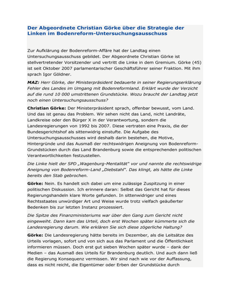 Der Abgeordnete Christian Görke über die Strategie der Linken im Bodenreform-Untersuchungsausschuss Zur Aufklärung der Bodenreform-Affäre hat der Landtag einen Untersuchungsausschuss gebildet. Der Abgeordnete Christian Görke ist stellvertretender Vorsitzender und vertritt die Linke in dem Gremium. Görke (45) ist seit Oktober 2007 parlamentarischer Geschäftsführer seiner Fraktion. Mit ihm sprach Igor Göldner. MAZ: Herr Görke, der Ministerpräsident bedauerte in seiner Regierungserklärung Fehler des Landes im Umgang mit Bodenreformland. Erklärt wurde der Verzicht auf die rund 10 000 umstrittenen Grundstücke. Wozu braucht der Landtag jetzt noch einen Untersuchungsausschuss? Christian Görke: Der Ministerpräsident sprach, offenbar bewusst, vom Land. Und das ist genau das Problem. Wir sehen nicht das Land, nicht Landräte, Landkreise oder den Bürger X in der Verantwortung, sondern die Landesregierungen von 1992 bis 2007. Diese vertraten eine Praxis, die der Bundesgerichtshof als sittenwidrig einstufte. Die Aufgabe des Untersuchungsausschusses wird deshalb darin bestehen, die Motive, Hintergründe und das Ausmaß der rechtswidrigen Aneignung von BodenreformGrundstücken durch das Land Brandenburg sowie die entsprechenden politischen Verantwortlichkeiten festzustellen. Die Linke hielt der SPD „Wagenburg-Mentalität“ vor und nannte die rechtswidrige Aneignung von Bodenreform-Land „Diebstahl“. Das klingt, als hätte die Linke bereits den Stab gebrochen. Görke: Nein. Es handelt sich dabei um eine zulässige Zuspitzung in einer politischen Diskussion. Ich erinnere daran: Selbst das Gericht hat für dieses Regierungshandeln klare Worte gefunden. In sittenwidriger und eines Rechtsstaates unwürdiger Art und Weise wurde trotz vielfach geäußerter Bedenken bis zur letzten Instanz prozessiert. Die Spitze des Finanzministeriums war über den Gang zum Gericht nicht eingeweiht. Dann kam das Urteil, doch erst Wochen später kümmerte sich die Landesregierung darum. Wie erklären Sie sich diese zögerliche Haltung? Görke: Die Landesregierung hätte bereits im Dezember, als die Leitsätze des Urteils vorlagen, sofort und von sich aus das Parlament und die Öffentlichkeit informieren müssen. Doch erst gut sieben Wochen später wurde – dank der Medien – das Ausmaß des Urteils für Brandenburg deutlich. Und auch dann ließ die Regierung Konsequenz vermissen. Wir sind nach wie vor der Auffassung, dass es nicht reicht, die Eigentümer oder Erben der Grundstücke durch Zeitungsannoncen zu suchen. Die Regierung ist in der Verantwortung, aktiv die Suche zu betreiben. Finden Sie es richtig, wie jetzt reagiert wird, unter anderem sollen die Grundbücher korrigiert werden? Görke: Die jetzigen Maßnahmen sind folgerichtig und zwingend geboten, um nachträglich dem Urteil zu entsprechen. Aber auch das hat mehrere Wochen gedauert. SPD und CDU halten der Linken Selbstgerechtigkeit vor und raten Ihrer Partei, sich mit Blick auf die eigene DDR-Vergangenheit bei diesem Thema zurückzuhalten. Ein berechtigter Einwand? Görke: Zurückhaltung ist nicht angesagt. In der DDR war der Umgang mit Grund und Boden ein völlig anderer. Bodeneigentum hatte kaum einen Wert, mit der Folge, dass die Eigentümerrechte oft nicht beachtet wurden. Das ist aus heutiger Sicht zu kritisieren. Mit dem so genannten Modrow-Gesetz im März 1990 wurde versucht, Klarheit in die Zuordnung von Bodenreformland zu bringen. Dann folgte das Zweite Vermögensrechtsänderungsgesetz, das für neue Unruhe und Ungerechtigkeiten sorgte, letztlich aber das Ziel hatte, Rechtsfrieden zu schaffen. Die Linke hat nie einen Hehl daraus gemacht, dass sie diese Vorschriften für falsch hielt. Worum es jedoch heute geht, ist die fehlerhafte Umsetzung des geltenden Rechts durch die Brandenburger Landesregierungen. Daher finde ich es nicht in Ordnung, dass SPD und CDU der Linken absprechen wollen, das Thema Bodenreformland auf die Tagesordnung zu setzen. Schließlich ist die SPD/CDU-Landesregierung mit ihrer Rechtsauffassung vor dem höchsten Gericht gescheitert. Die Sozialdemokraten sagen, sie wollten eine zügige Aufklärung der Vorgänge. Nehmen Sie das der SPD ab? Görke: SPD und CDU haben zumindest verbal betont, sie wollen die Vorgänge zügig aufhellen. Da haben wir Übereinstimmung. Sollte aber „gemauert“ oder „auf Zeit“ gespielt werden, wird die Linke sofort reagieren. Rechnen Sie denn mit einer „Mauertaktik“ der Koalition? Görke: Das wird sich zeigen. Die SPD macht momentan einen tief verunsicherten Eindruck. Dazu beigetragen hat sicher auch die Art und Weise, wie der Ministerpräsident seine Regierungserklärung im Landtag abgab. Es wurden bislang alle Fragen nach dem Ausmaß, den Verantwortlichkeiten und der Bewertung des Urteils umschifft. Die SPD vertiefte sich in der Debatte stattdessen über die Bodenreform im Allgemeinen, ging weit in die Geschichte zurück, redete über die „Modrow-Gesetze“ und beschuldigte die Linken. Das meinen wir, wenn wir von „Wagenburg-Mentalität“ der SPD sprechen. Aus der SPD wird der Linken offen gedroht, nicht zu überziehen, sonst würden die Chancen auf eine rot-rote Koalition nach der Landtagswahl 2009 schwinden. Werden Sie die SPD jetzt schonen? Görke: Nein, wir wollen Aufklärung mit aller Konsequenz. Darauf müssen sich SPD, aber auch CDU einstellen. Wir sind in der Opposition und wollen dieser Rolle gerecht werden. Welche prominenten Zeugen will die Linke vor den Ausschuss laden? Görke: Das ist noch offen. Wir werden Vertreter der Fachebenen hören, aber auch die damals und heute politisch Verantwortlichen. Da wir meistens am Dienstag tagen, wird der eine oder andere Minister nach der Kabinettssitzung sicher gleich den Weg in den Untersuchungsausschuss einschlagen können.