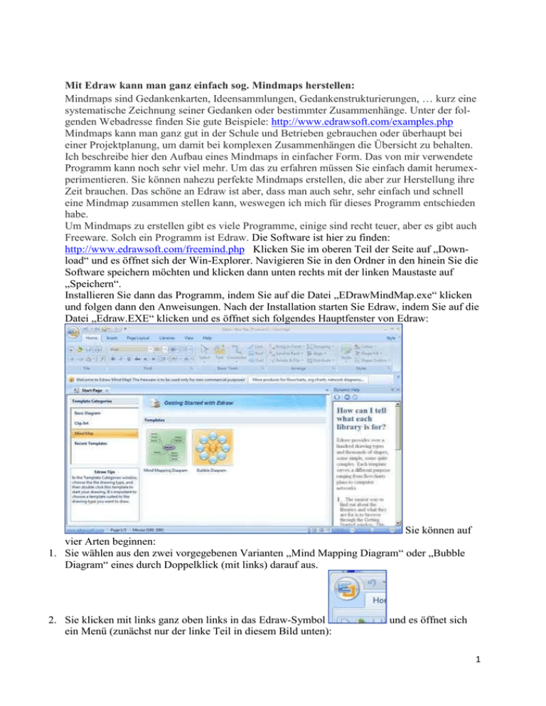 Mit Edraw kann man ganz einfach sog. Mindmaps herstellen: Mindmaps sind Gedankenkarten, Ideensammlungen, Gedankenstrukturierungen, … kurz eine systematische Zeichnung seiner Gedanken oder bestimmter Zusammenhänge. Unter der folgenden Webadresse finden Sie gute Beispiele: http://www.edrawsoft.com/examples.php Mindmaps kann man ganz gut in der Schule und Betrieben gebrauchen oder überhaupt bei einer Projektplanung, um damit bei komplexen Zusammenhängen die Übersicht zu behalten. Ich beschreibe hier den Aufbau eines Mindmaps in einfacher Form. Das von mir verwendete Programm kann noch sehr viel mehr. Um das zu erfahren müssen Sie einfach damit herumexperimentieren. Sie können nahezu perfekte Mindmaps erstellen, die aber zur Herstellung ihre Zeit brauchen. Das schöne an Edraw ist aber, dass man auch sehr, sehr einfach und schnell eine Mindmap zusammen stellen kann, weswegen ich mich für dieses Programm entschieden habe. Um Mindmaps zu erstellen gibt es viele Programme, einige sind recht teuer, aber es gibt auch Freeware. Solch ein Programm ist Edraw. Die Software ist hier zu finden: http://www.edrawsoft.com/freemind.php Klicken Sie im oberen Teil der Seite auf „Download“ und es öffnet sich der Win-Explorer. Navigieren Sie in den Ordner in den hinein Sie die Software speichern möchten und klicken dann unten rechts mit der linken Maustaste auf „Speichern“. Installieren Sie dann das Programm, indem Sie auf die Datei „EDrawMindMap.exe“ klicken und folgen dann den Anweisungen. Nach der Installation starten Sie Edraw, indem Sie auf die Datei „Edraw.EXE“ klicken und es öffnet sich folgendes Hauptfenster von Edraw: Sie können auf vier Arten beginnen: 1. Sie wählen aus den zwei vorgegebenen Varianten „Mind Mapping Diagram“ oder „Bubble Diagram“ eines durch Doppelklick (mit links) darauf aus. 2. Sie klicken mit links ganz oben links in das Edraw-Symbol ein Menü (zunächst nur der linke Teil in diesem Bild unten): und es öffnet sich 1 Führen Sie den Mauszeiger auf „New“ und es öffnet sich der rechte Teil dieses Menüs. Klicken Sie auf „Choose Drawing Type…“ und es öffnet sich folgende Ansicht im Hauptfenster: Sie können natürlich wie unter 1. Beschrieben starten, können aber auch weitere Vorlagen anzeigen lassen: Klicken Sie links auf eine der Vorgaben „Basic Diagram“, Clip Art“, Mind Map“ (ist standardmäßig geöffnet) oder „Recent Templates“. 3. Sie führen den ersten Schritt unter 2. Aus, wählen dann aber „New Drawing“ und es öffnet sich das leere Arbeitsfenster. Ich werde von diesem Fall ausgehen. 4. Eigentlich wie 3., Sie wählen wie unter 2., dort aber dann „Basic Diagram“ und im nächsten Fenster „Blank Drawing“ jeweils immer durch einen Doppelklick mit links. Es öffnet sich dann das leere neue Arbeitsblatt: 2 Klicken Sie ganz unten links auf „Libraries“ und links im Hauptfenster ändert sich die Ansicht: Die Unterpunkte sind alle noch geschlossen. Um sie zu öffnen klicken Sie mit links auf das kleine Pluszeichen davor (wie hier noch vor „Basic Diagrams“ und es öffnen sich weitere Unterpunkte. Sie können jetzt hier noch einmal zwischen Vorgabenlayouts wählen. Klicken Sie dazu auf eine Vorgabe, z. B. „SelfAnalisys“ und darunter 3 erscheint die Vorschau dazu: Wenn Ihnen die Vorgabe gefällt, klicken Sie doppelt mit links auf den Eintrag oben, also hier auf „SelfAnalisys“ und sie öffnet sich im Hauptfenster: Sie können jetzt dieses Diagramm bearbeiten, was ich jetzt aber nur ganz kurz erläutere, denn diese Anleitung soll zeigen, wie man auf einem leeren Blatt ein Diagramm aufbaut. Also: Sie klicken auf ein Element dann wird es durch ein Viereck mit grünen Punkten an den Ecken und in der Randmitte jeweils markiert. Drücken Sie die „Entf“-Taste und das Objekt wird gelöscht. Klicken Sie doppelt in ein markiertes Objekt, dann können Sie es bearbeiten, z. B. den Text löschen und durch neuen ersetzen. Weitere Möglichkeiten werden in meine Beschreibung hiernach kommen. Ein Mindmap auf einem leeren Blatt aufbauen. Starten Sie also, wie unter 4. Beschrieben, ein leeres Arbeitsblatt:Zunächst sollten Sie die Blattgröße einstellen, was wichtig ist, wenn man das hinterher vielleicht ausdrucken möchte. Gehen Sie mit der Maus ganz nach oben in die Befehlszeile 4 und klicken Sie mit links auf den Reiter „Page Layout“, sodass er, wie hier geschehen, heller hervorgehoben ist. Klicken Sie sodann auf das dritte Symbol von links und es öffnet sich ein langes Menü. Klicken Sie in dem Menü mit links auf „A4 Sheet…“. Das Menü schließt sich. Als nächstes ist es sehr hilfreich, wenn man die sog. „Libraries“ links am Rand hat, das sind Inhaltsobjekte, die Sie für Mindmaps brauchen. Wenn die nicht schon am linken Rand sowieso stehen, dann holen Sie sie folgendermaßen: Klicken Sie in der Befehlszeile oben auf „View“ (Ansicht) und in der Symbolleiste darunter erscheinen neue Symbole: Sie klicken mit links ganz links auf das erste Symbol „Libraries“ und links am Rand 5 im Hauptfenster öffnen sich also die Libraries. Sie sehen gerade noch zwei Pfeile aus den Libraries. Klicken Sie jetzt auf das kleine nach unten zeigende schwarze Dreieck hinter dem Buchsymbol und es öffnet sich ein Menü. Gehen Sie mit dem Mauszeiger auf einen der Begriffe „Clip Art“, „General“ oder „Min Map“ und es öffnet sich zur Seite ein wei- teres Menü: Dort klicken Sie mit links auf einen Eintrag, z. B. „Basic Drawing Shapes“ und rechts am Rand öffnet sich zusätzlich zur bereits geöffneten Bibliothek eine weitere, was Sie daran erkennen können, dass unter dem Buchsym- bol eine weitere Zeile steht: Hier sind im Ganzen 4 Libraries geöffnet. Klicken Sie auf eine und es öffnen sich dazu darunter die dazugehörigen Symbole. Hier sehen Sie die Symbole, die zu „Connectors“ gehören. Wählen Sie eine Librarie darüber erscheinen deren Symbole und die vorherige Librarie verschwindet ganz