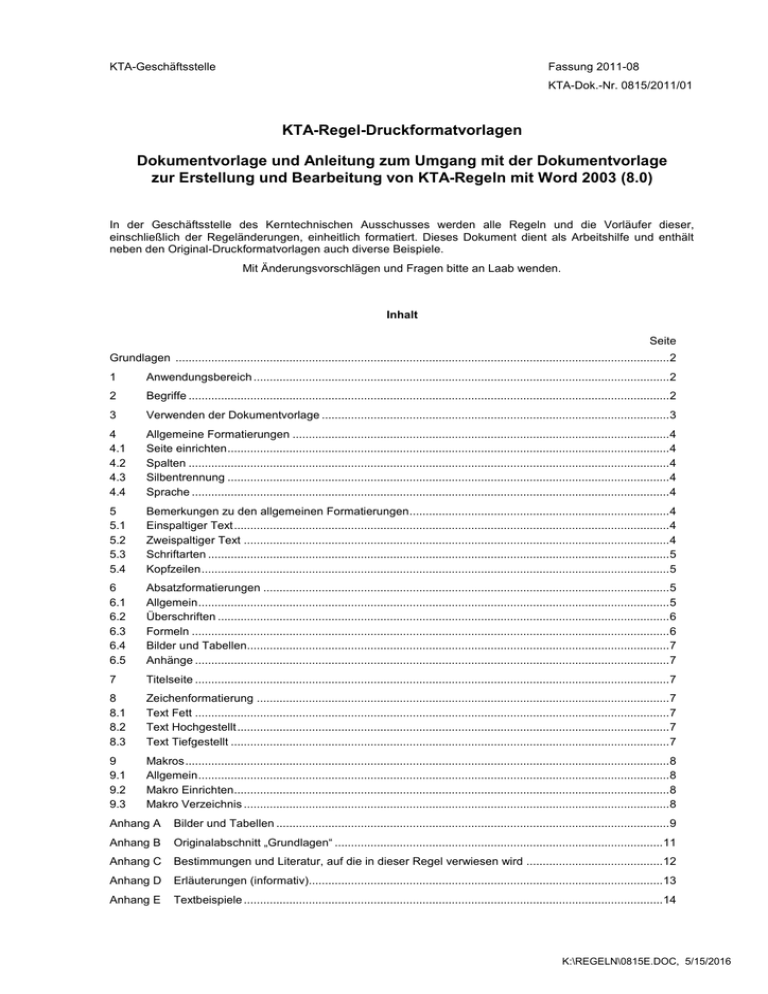 KTA-Geschäftsstelle Fassung 2011-08 KTA-Dok.-Nr. 0815/2011/01 KTA-Regel-Druckformatvorlagen Dokumentvorlage und Anleitung zum Umgang mit der Dokumentvorlage zur Erstellung und Bearbeitung von KTA-Regeln mit Word 2003 (8.0) In der Geschäftsstelle des Kerntechnischen Ausschusses werden alle Regeln und die Vorläufer dieser, einschließlich der Regeländerungen, einheitlich formatiert. Dieses Dokument dient als Arbeitshilfe und enthält neben den Original-Druckformatvorlagen auch diverse Beispiele. Mit Änderungsvorschlägen und Fragen bitte an Laab wenden. Inhalt Seite Grundlagen ........................................................................................................................................................ 2 1 Anwendungsbereich ................................................................................................................................ 2 2 Begriffe .................................................................................................................................................... 2 3 Verwenden der Dokumentvorlage ........................................................................................................... 3 4 4.1 4.2 4.3 4.4 Allgemeine Formatierungen .................................................................................................................... 4 Seite einrichten ........................................................................................................................................ 4 Spalten .................................................................................................................................................... 4 Silbentrennung ........................................................................................................................................ 4 Sprache ................................................................................................................................................... 4 5 5.1 5.2 5.3 5.4 Bemerkungen zu den allgemeinen Formatierungen................................................................................ 4 Einspaltiger Text ...................................................................................................................................... 4 Zweispaltiger Text ................................................................................................................................... 4 Schriftarten .............................................................................................................................................. 5 Kopfzeilen ................................................................................................................................................ 5 6 6.1 6.2 6.3 6.4 6.5 Absatzformatierungen ............................................................................................................................. 5 Allgemein ................................................................................................................................................. 5 Überschriften ........................................................................................................................................... 6 Formeln ................................................................................................................................................... 6 Bilder und Tabellen.................................................................................................................................. 7 Anhänge .................................................................................................................................................. 7 7 Titelseite .................................................................................................................................................. 7 8 8.1 8.2 8.3 Zeichenformatierung ............................................................................................................................... 7 Text Fett .................................................................................................................................................. 7 Text Hochgestellt ..................................................................................................................................... 7 Text Tiefgestellt ....................................................................................................................................... 7 9 9.1 9.2 9.3 Makros ..................................................................................................................................................... 8 Allgemein ................................................................................................................................................. 8 Makro Einrichten...................................................................................................................................... 8 Makro Verzeichnis ................................................................................................................................... 8 Anhang A Bilder und Tabellen ......................................................................................................................... 9 Anhang B Originalabschnitt „Grundlagen“ ..................................................................................................... 11 Anhang C Bestimmungen und Literatur, auf die in dieser Regel verwiesen wird .......................................... 12 Anhang D Erläuterungen (informativ)............................................................................................................. 13 Anhang E Textbeispiele ................................................................................................................................. 14 K:\REGELN\0815E.DOC, 5/15/2016 KTA 0815.1 Seite 2 Grundlagen (1) Diese Datei soll helfen, KTA-Regeln einheitlich zu formatieren. 