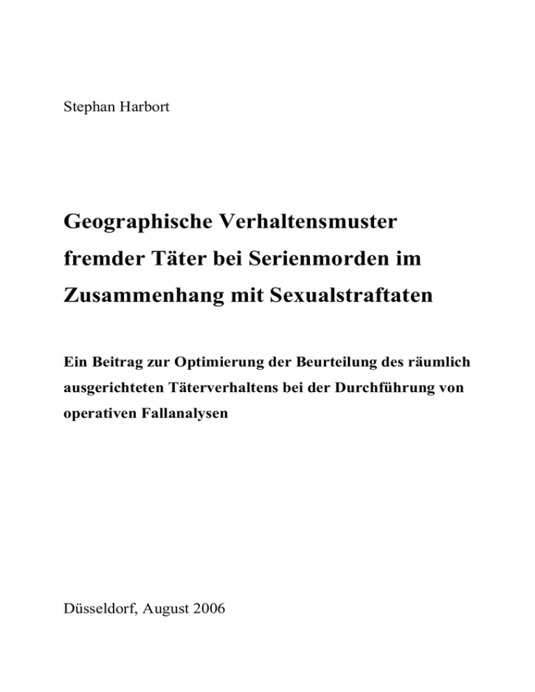 Stephan Harbort Geographische Verhaltensmuster fremder Täter bei Serienmorden im Zusammenhang mit Sexualstraftaten Ein Beitrag zur Optimierung der Beurteilung des räumlich ausgerichteten Täterverhaltens bei der Durchführung von operativen Fallanalysen Düsseldorf, August 2006 Inhalt I. Vorbemerkungen 3 II. Untersuchungsgegenstand und Methodik 4 III. Ausgangshypothesen 7 IV. Untersuchungsergebnisse 10 1. Regionale/überregionale Taten 10 2. Differenzierung der Entfernungskategorien 16 3. Differierende Tatorte 17 4. Räumliches Verhalten bei Tatortwechsel 20 5. Städtische/ländliche Taten 22 6. Geplante/nicht geplante Taten 24 7. Täter-Opfer-Beziehung 25 8. Lebensalter der Täter 27 9. Polizeiliche Vorerkenntnisse 28 10. Kinder als Opfer 30 11. Intelligenz der Täter 32 12. Beschaffenheit der Tatorte 34 V. Empirisches Täterprofil 36 VI. Zusammenfassung der wesentlichen Ergebnisse 37 VII. Überprüfung der Ausgangshypothesen 39 VIII. Fazit und Ausblick 45 Literatur 47 2 I. Vorbemerkungen Die Taten von Serien-Sexualmördern beunruhigen nicht nur die Bevölkerung in besonderem Maße, sondern erfordern i. d. Regel einen kriminalistischen Kraftakt – mit ungewissem Ausgang. Die erheblichen kriminalistischen Probleme können an konkreten Zahlen abgelesen werden: im Zuge der vorliegenden Studie konnte festgestellt werden, dass die Täter durchschnittlich erst nach drei Jahren und zwei Monaten gefasst werden konnten. Stellte man die bisher nicht aufgeklärten Mordserien im Untersuchungszeitraum in Rechnung, würde sich dieser Wert wenigstens verdoppeln. Im Mittelwert wurden durch die Probanden im genannten Zeitraum drei Opfer getötet. Das geographische Verhalten von Serienmördern ist im deutschsprachigen Raum bisher kaum untersucht worden, die vorliegende Studie befasst sich erstmals für Deutschland in einem repräsentativen Rahmen mit Serien-Sexualmördern. Dabei sind die Verteilung von Kriminalität im Allgemeinen und spezifische Verhaltensmuster im Besonderen aus kriminalistisch-kriminologischer Sicht von enormer Bedeutung. Denn die Planungen und Vorbereitungen des Täters umfassen neben Überlegungen zu Tatmittel, Tatzeit und Opfertyp insbesondere konkrete Tatörtlichkeiten (z. B. Wohnung des Täters/Opfers) oder bestimmte Regionen (z. B. Stadtteile oder Naherholungsgebiete), in denen sich Tatgelegenheiten ergeben können und sollen. Deshalb darf angenommen werden, dass die geographisch ausgerichtete Vorgehensweise des Täters nicht zufällig ist und mit eigenen Lebenserfahrungen und Alltagsroutinen korrespondiert bzw. durch diese determiniert wird. Im Rahmen der vorliegenden Studie soll näher untersucht werden, ob bei Morden im Zusammenhang mit Sexualstraftaten (bis vor kurzem wurde dieser Deliktsbereich noch als Sexualmord bezeichnet) ein Kontext besteht zwischen dem Lebensraum des Täters und seinem geographisch ausgerichteten Handeln. Und ob darüber hinaus geographische Verhaltensmuster existieren, die spezifische Merkmale der Täter (z. B. Alter oder polizeiliche Vorerkenntnisse) prädestinieren bzw. diskriminieren. Ferner soll überprüft werden, ob das geographische Verhalten von Einmal- und Serienmördern vergleichbar ist. Abschließend soll nach signifikanten, vor alledem aber fahndungsrelevanten Merkmalen gefragt werden, die den Tätertypus des Serien-Sexualmörders charakterisieren können. 3 II. Untersuchungsgegenstand und Methodik 1. Terminologie Mordserie: Eine Serienstraftat im Sinne dieser Untersuchung liegt vor, wenn im Urteil mindestens zwei Taten abgeurteilt wurden, bei denen der Täter verschiedene Opfer zu unterschiedlichen Tatzeiten tötete. Zwischen den Taten muss einerseits ein gewisser zeitlicher Zusammenhang bestehen und andererseits ein Zeitraum der so genannten emotionalen Abkühlung liegen, in der sich der Täter konsolidieren konnte. Der neuen Tat geht ein separater Tatentschluss voraus. Die Taten müssen mindestens das Versuchsstadium erreicht haben. (Dern et al., BKA, 2004) Mörder im Zusammenhang mit Sexualstraftat (im Folgenden der Einfachheit halber als Sexualmörder bezeichnet): Probanden, deren Tatausführung vor, während oder nach dem (versuchten) Tötungsakt eine den Tatentschluss wesentlich beeinflussende sexuelle Komponente beinhaltet. (Harbort, Kriminalistik 1999, 646) 2. Untersuchungsgut Gegenstand der Untersuchung sind Serienmorde im Zusammenhang mit Sexualstraftaten (im Folgenden der Einfachheit halber als Serien-Sexualmorde bzw. Serien-Sexualmörder bezeichnet) in der Bundesrepublik Deutschland und der ehemaligen DDR. Die vorliegende Untersuchung berücksichtigt ganz überwiegend Taten, bei denen zwischen Täter und Opfer keine Vorbeziehung bestand. „Fremd“ bedeutet also, dass sich Täter und Opfer nie oder unmittelbar am Tattag erstmals begegnet sind. Der Untersuchungszeitraum erstreckt sich von 1965 – 2005. Die gewonnenen Erkenntnisse sind somit repräsentativ für deutsche Verhältnisse. Es wurde genau dieses Zeitfenster ausgewählt, um eine Vergleichbarkeit mit der oben genannten BKA-Studie zu gewährleisten – dort wurden unter anderem überwiegend Sexualmorde als Einmaltaten von 1991 – 2001 untersucht. Auf eine Evaluation von Delikten, die sich vor 1965 ereigneten, wurde auch deshalb verzichtet, da die damaligen hier besonders relevanten Bedingungen (allgemeines Mobilitätsverhalten der Bevölkerung, Infrastrukturen etc.) nicht mit den heutigen Verhältnissen und Verhaltensweisen zu vergleichen sind und deshalb nur sehr bedingt geeignet erscheinen, um die Ergebnisse dieser Studie aktuell und künftig nutzen zu können. 4 Ausnahmsweise wurden Taten auch dann erfasst, die sich vor 1965 ereignet hatten, wenn der überwiegende Teil der übrigen Taten desselben Probanden nach 1965 verübt worden war. Nicht abgeurteilte Delikte wurden nicht erfasst, auch wenn sie aus kriminalpolizeilicher Sicht als „aufgeklärt“ gelten. Doppel- oder Dreifachmorde wurden als Einzeltat gewertet, sofern die Tötung der Opfer an demselben Tat