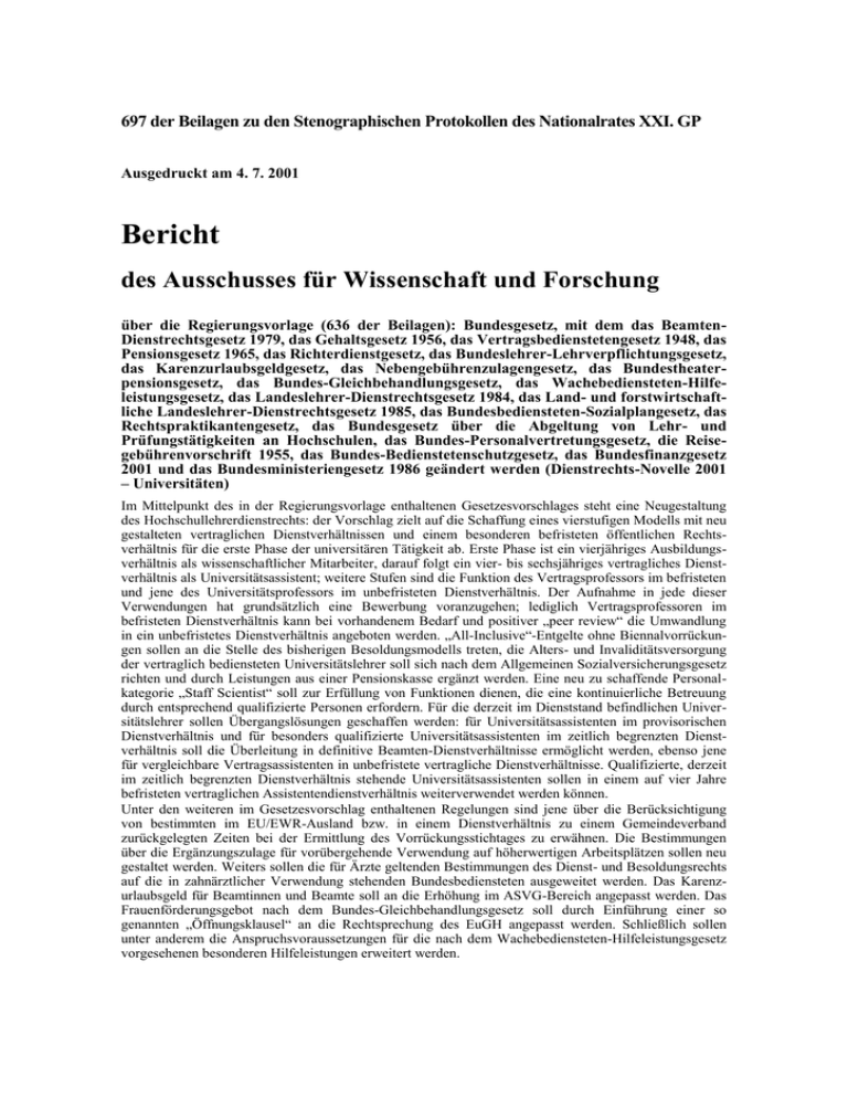 697 der Beilagen zu den Stenographischen Protokollen des Nationalrates XXI. GP Ausgedruckt am 4. 7. 2001 Bericht des Ausschusses für Wissenschaft und Forschung über die Regierungsvorlage (636 der Beilagen): Bundesgesetz, mit dem das BeamtenDienstrechtsgesetz 1979, das Gehaltsgesetz 1956, das Vertragsbedienstetengesetz 1948, das Pensionsgesetz 1965, das Richterdienstgesetz, das Bundeslehrer-Lehrverpflichtungsgesetz, das Karenzurlaubsgeldgesetz, das Nebengebührenzulagengesetz, das Bundestheaterpensionsgesetz, das Bundes-Gleichbehandlungsgesetz, das Wachebediensteten-Hilfeleistungsgesetz, das Landeslehrer-Dienstrechtsgesetz 1984, das Land- und forstwirtschaftliche Landeslehrer-Dienstrechtsgesetz 1985, das Bundesbediensteten-Sozialplangesetz, das Rechtspraktikantengesetz, das Bundesgesetz über die Abgeltung von Lehr- und Prüfungstätigkeiten an Hochschulen, das Bundes-Personalvertretungsgesetz, die Reisegebührenvorschrift 1955, das Bundes-Bedienstetenschutzgesetz, das Bundesfinanzgesetz 2001 und das Bundesministeriengesetz 1986 geändert werden (Dienstrechts-Novelle 2001 – Universitäten) Im Mittelpunkt des in der Regierungsvorlage enthaltenen Gesetzesvorschlages steht eine Neugestaltung des Hochschullehrerdienstrechts: der Vorschlag zielt auf die Schaffung eines vierstufigen Modells mit neu gestalteten vertraglichen Dienstverhältnissen und einem besonderen befristeten öffentlichen Rechtsverhältnis für die erste Phase der universitären Tätigkeit ab. Erste Phase ist ein vierjähriges Ausbildungsverhältnis als wissenschaftlicher Mitarbeiter, darauf folgt ein vier- bis sechsjähriges vertragliches Dienstverhältnis als Universitätsassistent; weitere Stufen sind die Funktion des Vertragsprofessors im befristeten und jene des Universitätsprofessors im unbefristeten Dienstverhältnis. Der Aufnahme in jede dieser Verwendungen hat grundsätzlich eine Bewerbung voranzugehen; lediglich Vertragsprofessoren im befristeten Dienstverhältnis kann bei vorhandenem Bedarf und positiver „peer review“ die Umwandlung in ein unbefristetes Dienstverhältnis angeboten werden. „All-Inclusive“-Entgelte ohne Biennalvorrückungen sollen an die Stelle des bisherigen Besoldungsmodells treten, die Alters- und Invaliditätsversorgung der vertraglich bediensteten Universitätslehrer soll sich nach dem Allgemeinen Sozialversicherungsgesetz richten und durch Leistungen aus einer Pensionskasse ergänzt werden. Eine neu zu schaffende Personalkategorie „Staff Scientist“ soll zur Erfüllung von Funktionen dienen, die eine kontinuierliche Betreuung durch entsprechend qualifizierte Personen erfordern. Für die derzeit im Dienststand befindlichen Universitätslehrer sollen Übergangslösungen geschaffen werden: für Universitätsassistenten im provisorischen Dienstverhältnis und für besonders qualifizierte Universitätsassistenten im zeitlich begrenzten Dienstverhältnis soll die Überleitung in definitive Beamten-Dienstverhältnisse ermöglicht werden, ebenso jene für vergleichbare Vertragsassistenten in unbefristete vertragliche Dienstverhältnisse. Qualifizierte, derzeit im zeitlich begrenzten Dienstverhältnis stehende Universitätsassistenten sollen in einem auf vier Jahre befristeten vertraglichen Assistentendienstverhältnis weiterverwendet werden können. Unter den weiteren im Gesetzesvorschlag enthaltenen Regelungen sind jene über die Berücksichtigung von bestimmten im EU/EWR-Ausland bzw. in einem Dienstverhältnis zu einem Gemeindeverband zurückgelegten Zeiten bei der Ermittlung des Vorrückungsstichtages zu erwähnen. Die Bestimmungen über die Ergänzungszulage für vorübergehende Verwendung auf höherwertigen Arbeitsplätzen sollen neu gestaltet werden. Weiters sollen die für Ärzte geltenden Bestimmungen des Dienst- und Besoldungsrechts auf die in zahnärztlicher Verwendung stehenden Bundesbediensteten ausgeweitet werden. Das Karenzurlaubsgeld für Beamtinnen und Beamte soll an die Erhöhung im ASVG-Bereich angepasst werden. Das Frauenförderungsgebot nach dem Bundes-Gleichbehandlungsgesetz soll durch Einführung einer so genannten „Öffnungsklausel“ an die Rechtsprechung des EuGH angepasst werden. Schließlich sollen unter anderem die Anspruchsvoraussetzungen für die nach dem Wachebediensteten-Hilfeleistungsgesetz vorgesehenen besonderen Hilfeleistungen erweitert werden. 2 697 der Beilagen Der Ausschuss für Wissenschaft und Forschung hat die gegenständliche Regierungsvorlage in seiner Sitzung am 22. Juni 2001 in Verhandlung genommen. Als Berichterstatter für den Ausschuss fungierte der Abgeordnete Mag. Dr. Udo Grollitsch. An der anschließenden Debatte beteiligten sich die Abgeordneten DDr. Erwin Niederwieser, Dr. Kurt Grünewald, Mag. Dr. Udo Grollitsch, Otto Pendl, Dr. Brigitte Povysil, Dr. Gertrude Brinek und Dr. Gerhart Bruckmann, die Vizekanzlerin und Bundesministerin für öffentliche Leistung und Sport Dr. Susanne Riess-Passer sowie die Bundesministerin für Bildung, Wissenschaft und Kultur Elisabeth Gehrer. Die Abgeordneten Dr. Martin Graf und Dr. Gertrude Brinek brachten einen Zusatz- und Abänderungsantrag ein. Hinsichtlich des Art. 1 (Beamten-Dienstrechtsgesetz 1979) des in der Regierungsvorlage enthaltenen Gesetzesvorschlages sieht dieser Zusatz- und Abänderungsantrag eine Änderung der Bezeichnung der Z 1 (die zur Z 1b wird) und Änderungen der Z 6, 14, 19, 24, 36 und 38 sowie die Einfügung neuer Z 1, 1a, 31a, 31b und 38a vor. In Art. 2 (Gehaltsgesetz 1956) sind Änderungen der Z 22 und 36 sowie die Einfügung neuer Z 10a, 17a und 19a vorgesehen. Hinsichtlich Art. 3 (Vertragsbedienstetengesetz 1948) schlägt der Zusatz- und Abänderungsantrag Änderungen der Z 14, 34 und 36, hinsichtlich Art. 4 (Pensionsgesetz 1965) eine Änderung der Z 2 und hinsichtlich Art. 5 (Richterdienstgesetz) eine Änderung der Z 2 vor. In Art. 9 (Bundestheaterpensionsgesetz) werden Änderungen der Z 2 und 3, in Art. 12 (Landeslehrer-Dienstrechtsgesetz 1984) die Einfügung neuer Z 1 