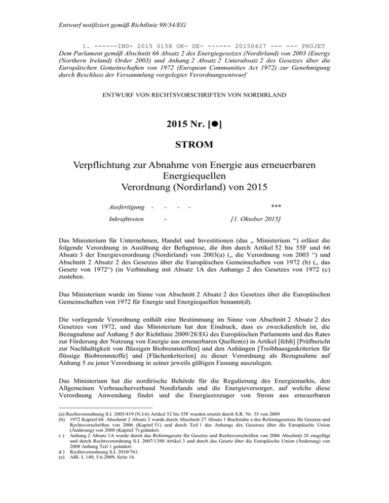 Entwurf notifiziert gemäß Richtlinie 98/34/EG 1. ------IND- 2015 0158 UK- DE- ------ 20150427 --- --- PROJET Dem Parlament gemäß Abschnitt 66 Absatz 2 des Energiegesetzes (Nordirland) von 2003 (Energy (Northern Ireland) Order 2003) und Anhang 2 Absatz 2 Unterabsatz 2 des Gesetzes über die Europäischen Gemeinschaften von 1972 (European Communities Act 1972) zur Genehmigung durch Beschluss der Versammlung vorgelegter Verordnungsentwurf ENTWURF VON RECHTSVORSCHRIFTEN VON NORDIRLAND 2015 Nr. [] STROM Verpflichtung zur Abnahme von Energie aus erneuerbaren Energiequellen Verordnung (Nordirland) von 2015 Ausfertigung - - Inkrafttreten - - - *** [1. Oktober 2015] Das Ministerium für Unternehmen, Handel und Investitionen (das „ Ministerium “) erlässt die folgende Verordnung in Ausübung der Befugnisse, die ihm durch Artikel 52 bis 55F und 66 Absatz 3 der Energieverordnung (Nordirland) von 2003(a) („ die Verordnung von 2003 “) und Abschnitt 2 Absatz 2 des Gesetzes über die Europäischen Gemeinschaften von 1972 (b) („ das Gesetz von 1972“) (in Verbindung mit Absatz 1A des Anhangs 2 des Gesetzes von 1972 (c) zustehen. Das Ministerium wurde im Sinne von Abschnitt 2 Absatz 2 des Gesetzes über die Europäischen Gemeinschaften von 1972 für Energie und Energiequellen benannt(d). Die vorliegende Verordnung enthält eine Bestimmung im Sinne von Abschnitt 2 Absatz 2 des Gesetzes von 1972, und das Ministerium hat den Eindruck, dass es zweckdienlich ist, die Bezugnahme auf Anhang 5 der Richtlinie 2009/28/EG des Europäischen Parlaments und des Rates zur Förderung der Nutzung von Energie aus erneuerbaren Quellen(e) in Artikel [fehlt] [Prüfbericht zur Nachhaltigkeit von flüssigen Biobrennstoffen] und den Anhängen [Treibhausgaskriterien für flüssige Biobrennstoffe] und [Flächenkriterien] zu dieser Verordnung als Bezugnahme auf Anhang 5 zu jener Verordnung in seiner jeweils gültigen Fassung auszulegen. Das Ministerium hat die nordirische Behörde für die Regulierung des Energiemarkts, den Allgemeinen Verbraucherverband Nordirlands und die Energieversorger, auf welche diese Verordnung Anwendung findet und die Energieerzeuger von Strom aus erneuerbaren (a) Rechtsverordnung S.I. 2003/419 (N.I.6) Artikel 52 bis 55F wurden ersetzt durch S.R. Nr. 35 von 2009 (b) 1972 Kapitel 68. Abschnitt 2 Absatz 2 wurde durch Abschnitt 27 Absatz 1 Buchstabe a des Reformgesetzes für Gesetze und Rechtsvorschriften von 2006 (Kapitel 51) und durch Teil 1 des Anhangs des Gesetzes über die Europäische Union (Änderung) von 2008 (Kapitel 7) geändert. c ) Anhang 2 Absatz 1A wurde durch das Reformgesetz für Gesetze und Rechtsvorschriften von 2006 Abschnitt 28 eingefügt und durch Rechtsverordnung S.I. 2007/1388 Artikel 3 und durch das Gesetz über die Europäische Union (Änderung) von 2008 Anhang Teil 1 geändert. d ) Rechtsverordnung S.I. 2010/761. (e) ABl. L 140, 5.6.2009, Seite 16. Energiequellen in Nordirland und andere Betroffene gemäß Artikel 55E der Verordnung von 2003 konsultiert. Gemäß Artikel 66 Absatz 2 des Gesetzes von 2003 und Nr. 2 Absatz 2 des Anhangs 2 zum Gesetz von 1972 wurde ein Entwurf dieses Verordnung der Versammlung vorgelegt und von dieser durch Entschließung angenommen. Das Ministerium erlässt die folgende Verordnung — TEIL 1 Einleitende Bestimmungen Zitierweise, Inkrafttreten und Geltungsbereich 1.— (1) Diese Verordnung kann als Verordnung über die Verpflichtung zur Abnahme von Energie aus erneuerbaren Energiequellen (Nordirland) von 2015 zitiert werden und tritt am [1. Oktober 2015] in Kraft. (2) In dieser Verordnung bedeutet „die Verordnung von 2009“ die Verordnung über die Verpflichtung zur Abnahme von Energie aus erneuerbaren Energiequellen (Nordirland) von 2009(a). Auslegung 2.—(1) In der vorliegenden Verordnung gelten folgende Begriffsbestimmungen— „Zulassung“ bedeutet in Bezug auf ein Kraftwerk die Zulassung des Kraftwerks durch die Behörde als Kraftwerk, das Strom aus erneuerbaren Energiequellen erzeugen kann (und umfasst eine Zulassung, die vor Inkrafttreten dieser Verordnung in Kraft trat); „zugelassen“ ist gemäß der Definition von „Zulassung“ auszulegen; „anaerobe Vergärung“ bezeichnet die bakterielle Vergärung organischen Materials unter Ausschluss freien Sauerstoffs; „tierische Exkremente“ bedeutet die Exkremente von Tieren und enthält Biomasse, die vollständig aus Exkrementen von Tieren stammt; „Biomasse“ ist gemäß Artikel [Biomasse und als Biomasse zu behandelnde Brennstoffe] auszulegen; „Biomaterial“ bezeichnet den biologisch abbaubaren Teil von— (a) Erzeugnissen, Abfällen und Reststoffen der Landwirtschaft mit biologischem Ursprung (einschließlich pflanzlicher und tierischer Stoffe), der Forstwirtschaft und damit verbundener Wirtschaftszweige (einschließlich der Fischerei und der Aquakultur) sowie (b) von industriellen, gewerblichen und kommunalen Abfällen; „ CHPQA “ bezeichnet die Qualitätssicherungsnorm für Kraft-Wärme-Kopplung (Combined Heat and Power Quality Assurance Standard) Ausgabe 5, veröffentlicht vom Ministerium für Energie und Klimawandel im November 2013 und Leitfaden Nr. 44 (Guidance Note 44) (Verwendung der CHPQA zur Unterstützung der Strommenge aus der Kraft-WärmeKupplung aus erneuerbaren Energien im Rahmen der Verpflichtung zur Abnahme von Energie aus erneuerbaren Energiequellen), Ausgabe 4, veröffentlicht vom Ministerium für Energie und Klimawandel im Dezember 2013 (b); (a) RECHTSVERORDNUNG S.R. Nr. 154 von 2009, geändert durch Rechtsverordnung S.R. Nr. 134 von 2010, Rechtsverordnung S.R. Nr. 169 von 2011, Rechtsverordnung S.R. Nr. 116 von 2013, Rechtsverordnung S.R. Nr. 174 von 2013 und Rechtsverordnung S.R. Nr.146 von 2014 (b) Diese Dokumente könne über die Website des Ministeriums für Energie und Klimawandel unter folgender Adresse eingeholt werden: 2 „KWK-Anlage“ bedeutet eine Anlage, bei der Strom gewonnen wird und die zu Zwecken betrieben wird (oder werden 