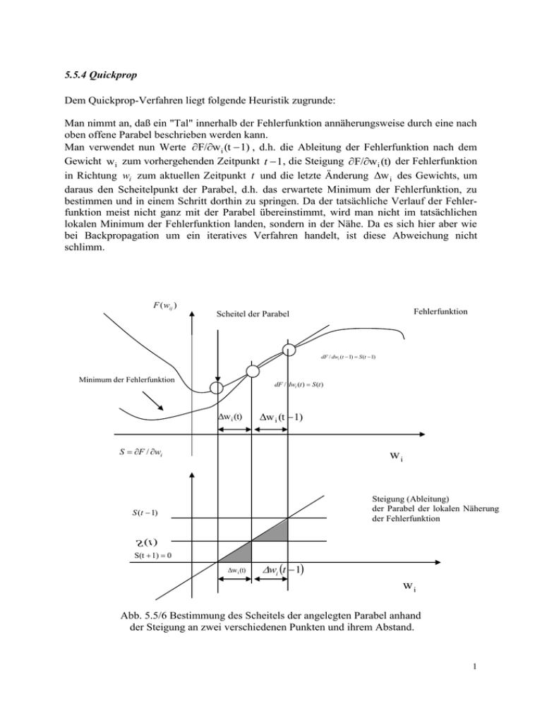 5.5.4 Quickprop Dem Quickprop-Verfahren liegt folgende Heuristik zugrunde: Man nimmt an, daß ein "Tal" innerhalb der Fehlerfunktion annäherungsweise durch eine nach oben offene Parabel beschrieben werden kann. Man verwendet nun Werte F/wi (t 1) , d.h. die Ableitung der Fehlerfunktion nach dem Gewicht wi zum vorhergehenden Zeitpunkt t 1, die Steigung F/w i (t) der Fehlerfunktion in Richtung wi zum aktuellen Zeitpunkt t und die letzte Änderung Δw i des Gewichts, um daraus den Scheitelpunkt der Parabel, d.h. das erwartete Minimum der Fehlerfunktion, zu bestimmen und in einem Schritt dorthin zu springen. Da der tatsächliche Verlauf der Fehlerfunktion meist nicht ganz mit der Parabel übereinstimmt, wird man nicht im tatsächlichen lokalen Minimum der Fehlerfunktion landen, sondern in der Nähe. Da es sich hier aber wie bei Backpropagation um ein iteratives Verfahren handelt, ist diese Abweichung nicht schlimm. F ( wij ) Fehlerfunktion Scheitel der Parabel dF / dwi (t 1) S (t 1) Minimum der Fehlerfunktion dF / dwi (t ) S (t ) Δw i (t) Δw i (t 1) S F / wi wi Steigung (Ableitung) der Parabel der lokalen Näherung der Fehlerfunktion S (t 1) S (t ) S(t 1) 0 Δw i (t) wi t 1 wi Abb. 5.5/6 Bestimmung des Scheitels der angelegten Parabel anhand der Steigung an zwei verschiedenen Punkten und ihrem Abstand. 1 Die angenäherte Bestimmung des lokalen Minimums wird dadurch sehr einfach und benötigt wie Backpropagation nur lokale Informationen eines Neuron Δ w i (t) S(t) Δ w i (t 1) S(t 1) S(t) Dabei ist S(t) F w i (t) die Steigerung der Fehlerfunktion in Richtung wi zum Zeitpunkt t . Die Herleitung dieser Formel ergibt sich direkt aus Abb. 5.5/6. Man sieht , wie der Scheitel der Parabel, für den die Steigung S(t 1) 0 ist, aus den beiden Steigungen S(t 1) und S (t ) und dem Abstand wi (t 1) berechnet werden kann. Zu bestimmen ist hier lediglich Δwi (t) , für das wegen der Ähnlichkeit der schraffierten Dreiecke in der Graphik der Ableitung der Parabel die Bedingung gilt Δw i (t) S(t) . Δw i (t 1) S(t 1) S(t) Man beachte, daß der Quotient dieser Gleichung im Prinzip einen veränderlichen MomentumTerm darstellt. Generell lassen sich vier Situationen unterscheiden: 1. Die aktuelle Steigung S( t ) ist kleiner als die vorhergehende Steigung S(t 1) , hat aber das gleiche Vorzeichen, d.h. S(t) S(t 1) und sgn (S(t)) sgn (S(t 1)) : Dann erfolgt die Gewichtsänderung in der gleichen Richtung wie vorher. 2. Die aktuelle Steigung verläuft in der umgekehrten Richtung wie die vorige Steigung S( t 1) , d.h. ( sgn S(t)) sgn (S(t 1)) : Dann haben wir ein Minimum übersprungen und sind jetzt auf der anderen Seite des Tales der Fehlerfunktion. In diesem Fall ergibt der nächste Schritt eine Position zwischen den beiden vorhergehenden Positionen. 3. Die aktuelle Steigung S( t ) ist gleich der vorhergehenden Steigung, d.h. S( t ) S( t 1) : Dann würde die Formel einen unendlich großen Schritt liefern bzw. das Simulationsprogramm würde wegen Division durch Null fehlerhaft abbrechen. 4. Die aktuelle Steigung S(t) ist größer als die vorhergehende Steigung mit gleichem Vorzeichen, d.h. S(t) S(t 1) und sgn (S(t)) sgn (S( t 1)) : In diesem Fall würde man rückwärts in Richtung eines lokalen Maximums gehen (weil der Algorithmus dann den Scheitel einer nach unten offenen Parabel sucht). Zur Lösung des Problems von Situation 3 kann man einen zusätzlichen Parameter einführen, den sog. Maximalen Wachtumsfaktor. Durch ihn wird über die zusätzliche Bedingung | Δwi (t) | μ | Δw i (t 1 ) | die Gewichtsänderung auf das max. μ -fache der letzten Änderung beschränkt. Hierbei sollte nicht zu groß gewählt werden. Als relativ guter Wert für μ hat sich eine Größenordnung 2 von 1,75 bis 2,25 bewährt. Bei Beginn des Verfahrens oder wenn der vorherige Schritt | Δw i (t) | 0 ist, muß der Lernprozeß (neu) gestartet werden. Üblicherweise geschieht dies durch das Standard-Backpropagation | Δw i (t) | - η F (t) wi Um die Gewichte nicht zu sehr anwachsen zu lassen, kann Quickprop zusätzlich mit Weight Decay kombiniert werden. Das Quickprop-Verfahren ist somit ein iteratives Verfahren zweiter Ordnung zur Bestimmung des Minimums der Fehlerfunktion eines Feedforward-Netzes, welches sich an das NewtonVerfahren anlehnt. Es wurde 1989 von Scott Fahlman entwickelt. In der Praxis hat es sich als ein relativ schnelles Verfahren bewährt, wobei wegen der zugrunde liegenden Heuristiken auch hier Gegenbeispiele existieren. Auch ist der Rechenaufwand für die einzelnen Schritte viel höher als bei dem Standard-Backpropagation-Verfahren. 3 5.5.5 Die δ - δ und die δ - δ -Regel Von Jacobs wurden 1988 in Zusammenarbeit mit Sutton folgende naheliegende Vorschläge zur Verbesserung der Backpropagation-Lernregel gemacht: Die Lernrate beeinflußt maßgeblich, wie stark die Gewichte modifiziert werden. Da aber eine einheitliche Lernrate nicht die, in jeder Dimension unterschiedliche, Krümmungseigenschaft der Fehleroberfläche berücksichtigt, sollte jedes Gewicht eine individuelle Lernrate besitzen. Jede Lernrate sollte mit der Zeit ihren Wert verändern können, da die Eigenschaften der Fehleroberfläche in einer Gewichts-Dimension nicht während des ganzen Verfahrens gleich bleiben. Dabei sollen die folgenden Heuristiken zur Steuerung der Lernraten benutzt werden: 1. Wenn die Ableitung für ein Gewicht über mehrere aufeinanderfolgende Schritte das gleiche Vorzeichen hat, wird seine Lernrate erhöht, da die Gewichts-Dimension dann meist schwach gekrümmt ist. 2. Wechselt die Ableitung für ein Gewicht dagegen in einigen aufeinanderfolgenden Schritten ihr Vorzeichen, so ist die Fehleroberfläche in der entsprechenden Koordinatenrichtung stark gekrümmt, weshalb die Lernrate verringert wird. Auch hier lassen sich Situationen konstruieren, bei denen diese Heuristiken nicht zutreffen und entsprechend dieses Verfahren versagt. Hierzu betrachtet man z.B. eine Oberfläche über einem zweidimensionalen Raum die ein Tal mit stark g