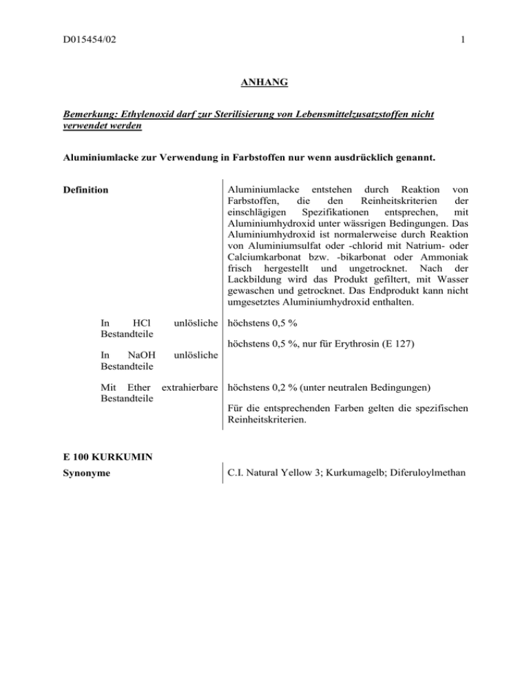D015454/02 1 ANHANG Bemerkung: Ethylenoxid darf zur Sterilisierung von Lebensmittelzusatzstoffen nicht verwendet werden Aluminiumlacke zur Verwendung in Farbstoffen nur wenn ausdrücklich genannt. Aluminiumlacke entstehen durch Reaktion von Farbstoffen, die den Reinheitskriterien der einschlägigen Spezifikationen entsprechen, mit Aluminiumhydroxid unter wässrigen Bedingungen. Das Aluminiumhydroxid ist normalerweise durch Reaktion von Aluminiumsulfat oder -chlorid mit Natrium- oder Calciumkarbonat bzw. -bikarbonat oder Ammoniak frisch hergestellt und ungetrocknet. Nach der Lackbildung wird das Produkt gefiltert, mit Wasser gewaschen und getrocknet. Das Endprodukt kann nicht umgesetztes Aluminiumhydroxid enthalten. Definition In HCl Bestandteile unlösliche höchstens 0,5 % höchstens 0,5 %, nur für Erythrosin (E 127) In NaOH Bestandteile unlösliche Mit Ether extrahierbare höchstens 0,2 % (unter neutralen Bedingungen) Bestandteile Für die entsprechenden Farben gelten die spezifischen Reinheitskriterien. E 100 KURKUMIN Synonyme 1 C.I. Natural Yellow 3; Kurkumagelb; Diferuloylmethan D015454/02 Definition 2 Kurkumin wird durch Lösungsmittel-Extraktion aus Kurkuma, d. h. gemahlenen Wurzeln von Curcuma longa L.-Arten, gewonnen. Konzentriertes Kurkuminpulver erhält man durch die Reinigung des Extraktes durch Kristallisierung. Das Produkt besteht im Wesentlichen aus Kurkuminen, d. h. dem färbenden Grundbestandteil (1,7-bis(4-Hydroxy-3methoxyphenyl)hepta-1,6-dien-3,5-dion) und seinen beiden Desmethoxy-Derivaten in unterschiedlichen Proportionen. Geringe Mengen an Öl bzw. Harz, die in Kurkuma von Natur aus vorhanden sind, können enthalten sein. Kurkumin wird auch in Form des Aluminiumlacks verwendet; der Aluminiumgehalt liegt unter 30 %. Zur Extraktion dürfen ausschließlich folgende Lösungsmittel verwendet werden: Ethylacetat, Aceton, Kohlendioxid, Dichlormethan, n-Buthanol, Methanol, Ethanol, Hexan, Propan-2-ol CI-Nr. 75300 EINECS 207-280-5 Chemische Bezeichnung I 1,7-bis(4-Hydroxy-3-Methoxyphenyl)hepta1,6-dien-3,5-dion II 1-(4-Hydroxyphenyl)-7-(4-Hydroxy-3Methoxyphenyl)hepta-1,6-dien-3,5-dion III 1,7-bis(4-Hydroxyphenyl)hepta-1,6-dien-3,5dion I C21H20O6 II C20H18O5 III C19H16O4 Chemische Formel Molmasse I. 368,39 II. 338,39 III. 308,39 Gehalt mindestens 90 % Farbstoffe insgesamt E1 cm1 % = 1607 bei ca. 426 nm in Ethanol Beschreibung Merkmale 2 orange-gelbes kristallines Pulver D015454/02 3 Spektrometrie Maximum in Ethanol bei ca. 426 nm Schmelzbereich 179—182 °C Reinheit Lösungsmittelreste Ethylacetat Aceton n-Butanol Methanol einzeln oder zusammengenommen höchstens 50 mg/kg Ethanol Hexan Propan-2-ol Dichlormethan: höchstens 10 mg/kg Arsen höchstens 3 mg/kg Blei höchstens 10 mg/kg Quecksilber höchstens 1 mg/kg Cadmium höchstens 1 mg/kg Aluminiumlacke dieses Farbstoffs sind zugelassen. E 101(i) RIBOFLAVIN Synonyme Lactoflavin Definition CI-Nr. 3 EINECS 201-507-1 Chemische Bezeichnung 7,8-Dimethyl-10-(D-ribo-2,3,4,5tetrahydroxypentyl)benzo(g)pteridin-2,4(3H,10H)-dion; 7,8-Dimethyl-10-(1′-D-ribityl)isoalloxazin Chemische Formel C17H20N4O6 Molmasse 376,37 Gehalt mindestens 98 %, wasserfrei D015454/02 4 E1 cm1 % = 328 bei ca. 444 nm in wässriger Lösung gelbes bis orange-gelbes kristallines Pulver, schwacher Geruch Beschreibung Merkmale Spektrometrie Das Verhältnis A375/A267 beträgt zwischen 0,31 und 0,33 in wässriger Lösung Das Verhältnis A444/A267 beträgt zwischen 0,36 und 0,39 Maximum in Wasser bei ca. 375 nm Spezifische Drehung [α]D20 zwischen –115° und –140° in 0,05 n Natronlauge Reinheit Trocknungsverlust höchstens 1,5 % (105 °C, 4 Stunden) Sulfatasche höchstens 0,1 % Primäre Amine aromatische höchstens 100 mg/kg (berechnet als Anilin) Arsen höchstens 3 mg/kg Blei höchstens 2 mg/kg Quecksilber höchstens 1 mg/kg Cadmium höchstens 1 mg/kg E 101(ii) RIBOFLAVIN-5′-PHOSPHAT Synonyme Riboflavin-5′-phosphatnatrium Definition Diese Spezifikationen gelten für Riboflavin-5′-phosphat mit geringeren Mengen von freiem Riboflavin und Riboflavindiphosphat. CI-Nr. EINECS 4 204-988-6 D015454/02 5 Chemische Bezeichnung Mononatrium(2R,3R,4S)-5-(3′)10′-dihydro-7′,8′dimethyl-2′,4′-dioxo-10′-benzo(g)pteridinyl)-2,3,4trihydroxypentylphosphat; Mononatriumsalz des 5′Monophosphatesters von Riboflavin Chemische Formel als Dihydrat: C17H20N4NaO9P · 2H2O in der wasserfreien Form: C17H20N4NaO9P Molmasse 514,36 Gehalt mindestens 95 % Farbstoffe insgesamt, berechnet als C17H20N4NaO9P.2H2O E1 cm1 % = 250 bei ca. 375 nm in wässriger Lösung gelbes bis orangefarbenes kristallines hygroskopisches Pulver, schwacher Geruch Beschreibung Merkmale Spektrometrie Das Verhältnis A375/A267 beträgt zwischen 0,30 und 0,34 in wässriger Lösung Das Verhältnis A444/A267 beträgt zwischen 0,35 und 0,40 Maximum in Wasser bei ca. 375 nm Spezifische Drehung [α]D20 zwischen +38° und +42° in 5 molarer HClLösung Reinheit Trocknungsverlust beim Dihydrat höchstens 8 % (100 °C, 5 Stunden im Vakuum über P2O5) Sulfatasche höchstens 25 % Anorganische Phosphate höchstens 1,0 % (berechnet als PO4, wasserfrei) Nebenfarbstoffe Riboflavin (frei): höchstens 6 % Riboflavindiphosphat: höchstens 6 % Primäre Amine Arsen 5 aromatische höchstens 70 mg/kg (berechnet als Anilin) höchstens 3 mg/kg D015454/02 6 Blei höchstens 2 mg/kg Quecksilber höchstens 1 mg/kg Cadmium höchstens 1 mg/kg E 102 TARTRAZIN Synonyme C.I. Food Yellow 4 Definition Tartrazin wird aus 4-Amino-benzensulfonsäure hergestellt, die mit Salzsäure und Natriumnitrit diazotiert wird. Die Azogruppe wird dann mit 4,5Dihydro-5-oxo-1-(4sulphophenyl)-1H-pyrazol-3carbonsäure oder mit dem Methylester, dem Ethylester oder einem Salz dieser Carbonsäure gekoppelt. Der entstandene Farbstoff wird gereinigt und als das Natriumsalz isoliert. Tartrazin besteht im Wesentlichen aus Trinatrium-5-hydroxy-1-(4-sulfophenyl)-4-(4sulfophenylazo)pyrazol-3-carboxylat und sonstigen Farbstoffen sowie Natriumchlorid und/oder Natriumsul