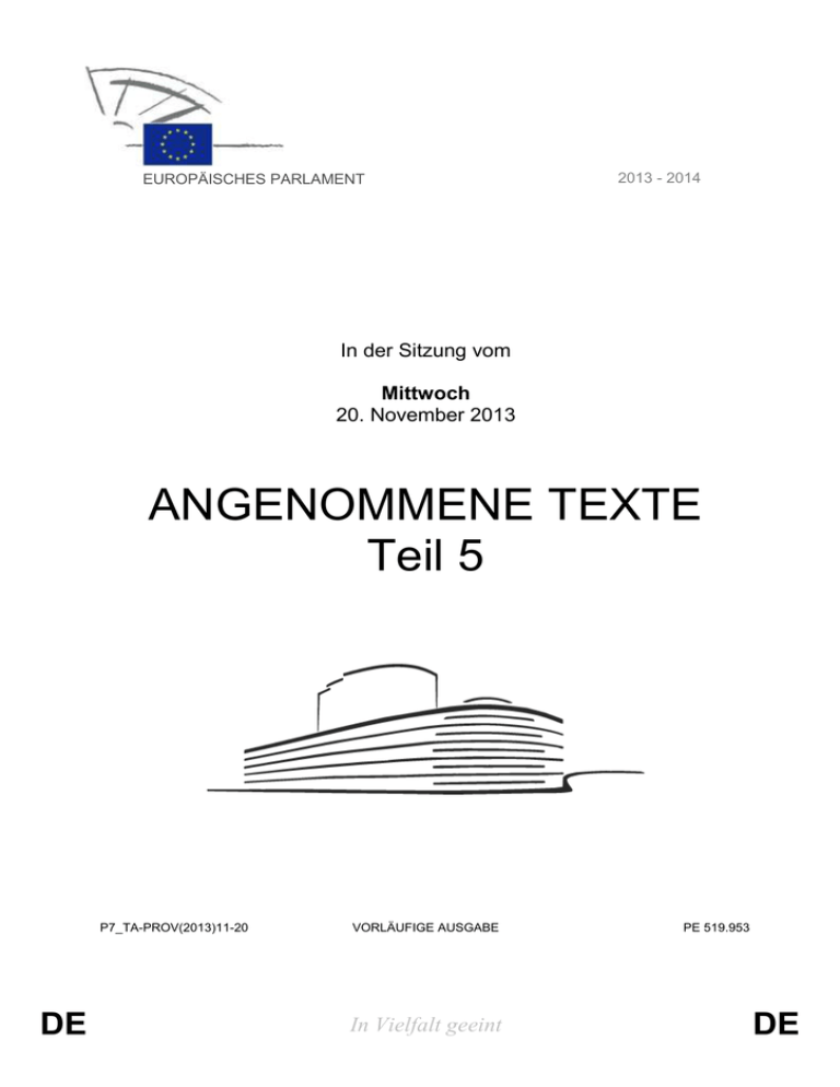 EUROPÄISCHES PARLAMENT 2013 - 2014 In der Sitzung vom Mittwoch 20. November 2013 ANGENOMMENE TEXTE Teil 5 P7_TA-PROV(2013)11-20 DE VORLÄUFIGE AUSGABE In Vielfalt geeint PE 519.953 DE INHALTSVERZEICHNIS VOM PARLAMENT ANGENOMMENE TEXTE P7_TA-PROV(2013)0492 Gemeinsame Marktorganisation für landwirtschaftliche Erzeugnisse ***I (A7-0366/2013 - Berichterstatter: Michel Dantin) Legislative Entschließung des Europäischen Parlaments vom 20. November 2013 zu dem Vorschlag für eine Verordnung des Europäischen Parlaments und des Rates über eine gemeinsame Marktorganisation für landwirtschaftliche Erzeugnisse (Verordnung „Einheitliche GMO“) (COM(2011)0626 – C7-0339/2011 – COM(2012)0535 – C70310/2012 –2011/0281(COD)) ..................................................................................................... 1 P7_TA-PROV(2013)0493 Direktzahlungen an Inhaber landwirtschaftlicher Betriebe im Rahmen von Stützungsregelungen der GAP ***I (A7-0362/2013 - Berichterstatter: Luis Manuel Capoulas Santos) Legislative Entschließung des Europäischen Parlaments vom 20. November 2013 zu dem Vorschlag für eine Verordnung des Europäischen Parlaments und des Rates mit Vorschriften über Direktzahlungen an Inhaber landwirtschaftlicher Betriebe im Rahmen von Stützungsregelungen der Gemeinsamen Agrarpolitik (COM(2011)0625 – C70336/2011 – COM(2012)0552 – C7-0311/2012 – 2011/0280(COD)) ..................................... 386 P7_TA-PROV(2013)0494 Übergangsbestimmungen betreffend die Förderung der ländlichen Entwicklung ***I (A7-0326/2013 - Berichterstatter: Albert Deß) Legislative Entschließung des Europäischen Parlaments vom 20. November 2013 zu dem Vorschlag für eine Verordnung des Europäischen Parlaments und des Rates mit bestimmten Übergangsvorschriften betreffend die Förderung der ländlichen Entwicklung durch den Europäischen Landwirtschaftsfonds für die Entwicklung des ländlichen Raums (ELER) und zur Änderung der Verordnung (EU) Nr. [RD] betreffend die finanziellen Ressourcen und ihre Verteilung im Jahr 2014 sowie zur Änderung der Verordnung (EG) Nr. 73/2009 des Rates und der Verordnungen (EU) Nr. [DP], (EU) Nr. [HR] und (EU) Nr. [sCMO] hinsichtlich ihrer Anwendung im Jahr 2014 (COM(2013)0226 – C70104/2013 – 2013/0117(COD)) ................................................................................................ 533 P7_TA-PROV(2013)0495 Vorkehrungen für die finanzielle Abwicklung bei bestimmten, hinsichtlich ihrer Finanzstabilität von Schwierigkeiten betroffenen bzw. von gravierenden Schwierigkeiten bedrohten Mitgliedstaaten und in Bezug auf die Vorschriften für die Aufhebung der Mittelbindung bei bestimmten Mitgliedstaaten ***I (A7-0312/2013 - Berichterstatter: Oldřich Vlasák) Legislative Entschließung des Europäischen Parlaments vom 20. November 2013 zu dem Vorschlag für eine Verordnung des Europäischen Parlaments und des Rates zur Änderung der Verordnung (EG) Nr. 1083/2006 des Rates in Bezug auf Vorkehrungen für die PE 519.953\ I DE finanzielle Abwicklung bei bestimmten, hinsichtlich ihrer Finanzstabilität von Schwierigkeiten betroffenen bzw. von gravierenden Schwierigkeiten bedrohten Mitgliedstaaten und in Bezug auf die Vorschriften für die Aufhebung der Mittelbindung bei bestimmten Mitgliedstaaten (COM(2013)0301 – C7-0143/2013 – 2013/0156(COD)) ..... 583 P7_TA-PROV(2013)0496 Mittelzuweisungen aus dem Europäischen Sozialfonds für bestimmte Mitgliedstaaten ***I (A7-0381/2013 - Berichterstatter: Jan Olbrycht) Legislative Entschließung des Europäischen Parlaments vom 20. November 2013 zu dem Vorschlag für eine Verordnung des Europäischen Parlaments und des Rates zur Änderung der Verordnung (EG) Nr. 1083/2006 in Bezug auf die Mittelzuweisungen aus dem Europäischen Sozialfonds für bestimmte Mitgliedstaaten (COM(2013)0560 – C70244/2013 – 2013/0271(COD)) ................................................................................................ 598 P7_TA-PROV(2013)0497 Partnerschaftliches Fischereiabkommen EG-Kiribati *** (A7-0345/2013 - Berichterstatterin: Isabella Lövin) Legislative Entschließung des Europäischen Parlaments vom 20. November 2013 zum Entwurf eines Beschlusses des Rates über den Abschluss des Protokolls zur Festlegung der Fangmöglichkeiten und der finanziellen Gegenleistung nach dem partnerschaftlichen Fischereiabkommen zwischen der Europäischen Gemeinschaft einerseits und der Republik Kiribati andererseits (13331/2012 – C7-0036/2013 – 2012/0229(NLE)) ................. 610 P7_TA-PROV(2013)0498 Festlegung der Sitze der Organe der Europäischen Union (A7-0350/2013 - Berichterstatter: Ashley Fox, Gerald Häfner ) Entschließung des Europäischen Parlaments vom 20. November 2013 zur Festlegung der Sitze der Organe der Europäischen Union (2012/2308(INI)) ................................................... 611 II /PE 519.953 DE P7_TA-PROV(2013)0492 Gemeinsame Marktorganisation für landwirtschaftliche Erzeugnisse ***I Legislative Entschließung des Europäischen Parlaments vom 20. November 2013 zu dem Vorschlag für eine Verordnung des Europäischen Parlaments und des Rates über eine gemeinsame Marktorganisation für landwirtschaftliche Erzeugnisse (Verordnung „Einheitliche GMO“) (COM(2011)0626 – C7-0339/2011 – COM(2012)0535 – C70310/2012 –2011/0281(COD)) (Ordentliches Gesetzgebungsverfahren: erste Lesung) Das Europäische Parlament, – in Kenntnis des Vorschlags der Kommission an das Europäische Parlament und den Rat (COM(2011)0626) und des geänderten Vorschlags (COM(2012)0535), – gestützt auf Artikel 294 Absatz 2 und die Artikel 42 Absatz 1 und Artikel 43 Absatz 2 des Vertrags über die Arbeitsweise der Europäischen Union, auf deren Grundlage ihm der Vorschlag der Kommission unterbreitet wurde (C7-0339/2011), – gestützt auf Artikel 294 Absatz 3 des Vertrags über die Arbeitsweise der Europäischen Union, – in Kenntnis der Stellungnahme 1/2012 des Rechnungshofes vom 8.