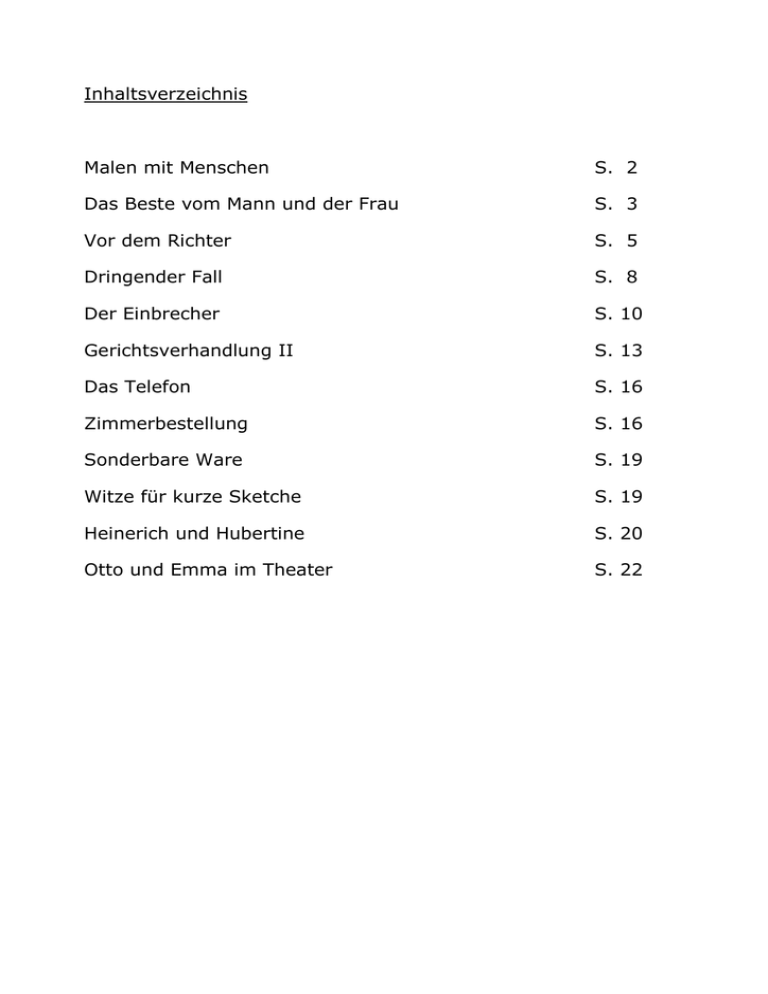 Inhaltsverzeichnis Malen mit Menschen S. 2 Das Beste vom Mann und der Frau S. 3 Vor dem Richter S. 5 Dringender Fall S. 8 Der Einbrecher S. 10 Gerichtsverhandlung II S. 13 Das Telefon S. 16 Zimmerbestellung S. 16 Sonderbare Ware S. 19 Witze für kurze Sketche S. 19 Heinerich und Hubertine S. 20 Otto und Emma im Theater S. 22 Malen mit Menschen Bonjour Mesdames et Messieurs, Guten Abend meine Damen und Herren. Mein Name ist Gilbert, isch bin gekommen extra aus Paris hierher mit die Helikopter.Von Beruf bin isch Maler und isch möchte Ihnen zeigen einige von meine Bilder. Aber isch nicht male mit Farbe und Leinwand, isch male mit Menschen. Zu finden diese Menschen isch habe mitgebracht meine Assistentin. Ihr Name ist Jacqueline. Für meine erste Bild isch brauche 5 Männer. Bitte Jacqueline, hole mir 5 Männer, sie sollen aber ihre Stühle mitbringen. (5 Stühle)Merci, Messieurs. Nun bitte jeder seinen Stuhl hochheben und im Kreise gehen. Diese Bild hat die Name: Der geregelte Stuhlgang. Für meine nächste Bild isch brauche sehr schöne Mann.Bitte Jacqueline, suche die schönste Mann. Bitte, Monsieur. Nehmen Sie in jede Hand eine Kerze. (2 Kerzen) Diese Bild trägt die Name: Der Armleuchter" Für die nächste Bild, Jacqueline, isch brauche eine wunderschöne Dame. Bitte, setzen Sie sich auf diesen Stuhl. Dazu brauche ich noch zwei Herren, Bitte hole Sie, Jacqueline! (1 Tuch) Jeder Herr stellt sich auf eine Seite der Dame und halten ein Tuch über ihre Kopf. Diese Bild isch habe genannt : Ein überspanntes Frauenzimmer/ Jacqueline isch brauche vier Frauen davon sollen sisch bitte drei auf jeweils einen Stuhl setzen und eine Dame stellt sisch daneben. Ein sehr aussagekräftiges Bild. Genannt habe isch dieses Bild eine Schachtel zu viel. Für meine nächste Bild liebe Jacqueline, suche mir ein zauberhaftes Mannsbild aus eine Statur von unglaublisch schöner Erotik. Monseur bitte stellen sie sich hin wie eine kräftige Statue. Dieses Bild trägt die Name: Das letzte Einhorn. Nun, isch brauche fünf Herren und eine Dame. Bitte hole sie! Die Herren stellen sich in einer Reihe auf. (5 Gläser Wasser) Die Dame gibt jedem der Herren ein Schluck Wasser zu trinken. Diese Bild heißt: Suleika tränkt ihre Kamele. Nun Jacqueline, isch brauche vier grosse Damen und eine ziemlich kleine Damen. Die Damen stellen sich in einer Reihe auf. (1 Stück Brot für die kleine Dame) Bitte feste kauen! Diese Bild nenne isch :Die kürzeste Frist. Und jetzt, Jacqueline, isch brauche eine wunderschöne, grosse, schlanke Dame. Meine Dame, bitte stellen Sie sich auf diesen Stuhl und breiten die Arme nach vorne aus. (1 Stuhl) Diese Bild heisst :Eine grosse Dürre kommt über Eusch. Nun, Jacqueline, isch brauche das Geburtstagskind mit seinem Ehemann/seiner Ehefrau. Meine Dame, bitte stellen Sie sich auf diesen Stuhl. Der Herr gibt der Dame eine Schnur in die Hand und hält die andere Ende fest. (1 Schnur) Diese Bild hat die wunderschöne Name:‚Ein Ehemann läßt seinen Drachen steigen. Meine liebe Jacqueline , hole mir bitte eine Dame. Bitte hängen sie sich eine Handtasche um und halten sich ein Taschentuch an das Auge. Diese Bild habe isch einmal für meine Freund Adamou gemacht die Name dafür ist: Es geht eine Träne auf Reisen.. Jacqueline, bringe mir bitte drei selbstbewusste Männer und eine etwas schüchterne Dame .Liebe Dame schauen sie bitte durch das Fernglas auf die drei Männer. Die Männer stellen sich bitte hintereinander auf und stützen sich mit ihren Händen am Boden ab. Diese wunderbare Darstellung habe den Namen: Ein Dackel kommt sellten allein.. Eines meiner neuesten Bilder möchte ich ihnen nun zeigen. Jacqueline suche mir bitte eine etwas müde aussehenden Mann. Bitte setzen sie sisch auf den Stuhl und lassen die Füße und die Arme ganz locker herunter hängen, dazu noch den wohlgeformten Kopf nach unten gebeugt. Ein etwas trauriges Bild, ich habe ihm den Name gegeben: Mit Viagra wäre das nicht passiert . Jacqueline für meine nächste Bild isch brauch ein Frau und zwei Mann .Madam bitte setzen sie sich auf den Stuhl und halten sisch die Ohren zu .Die beiden Männer stellen sisch dahinter und machen mit den Füßenständigegeräuschvolle Schrittbewegungen im stehen. Der Name von diese Bild habe isch gegeben: Türkische Einwanderer. Meine letzte Bild ist eine sehr große Bild. Die Männer bleiben auf ihren Stühlen sitzen die wunderbaren Frauen stehen bitte auf und halten den Männern ihre Trinkgläser vor den Mund. Dies wunderschöne große Bild habe isch den Name gegeben: suleika tränkt die Kamele Meine Damen und Herren, isch hoffe, meine Bilder haben Ihnen gefallen. Bitte empfehlen Sie mich, Gilbert, den Maler, weiter! Auf Wiedersehen! Au revoir! Das Beste vom Mann und der Frau Melodie : Es klappert die Mühle.......... Alle : Wir wollen jetzt singen ein Liedchen so schön , von wem ? Das wird man aus folgenden Versen schon hör´n , o weh . Wir bringen das Beste vom Mann und der Frau und schildern ihr Tun und Lassen genau , o weh , o weh , o weh . Herren : Wer kocht dem Manne den Kaffee so dünn ? Die Frau . Wer hat niemals etwas anzuziehen ? Die Frau . Wer kommt stets aus mit dem Haushaltsgeld was dem Manne ja auch so gut gefällt ? Die Frau , die Frau , die Frau . Damen : Wer bringt der Frau die Klamotten ins Haus ? Der Mann . Wer geht des abends niemals aus ? Der Mann . Wer scheut die Kneipe wie Feuer und Rauch macht von dem Hausschlüssel keinen Gebrauch ? Der Mann , der Mann , der Mann . Herren : Wer geht denn so gerne zum Kaffeeklatsch ? Die Frau . Wer macht mit den neuesten Modequatsch ? Die Frau. Wer sagt immer "Männchen , Du bist ja so gut , " doch nur , wenn sie braucht einen neuen Hut , Die Frau , die Frau , die Frau . Damen : Wer meutert , wenn einmal das Fleisch angebrannt ? Der Mann . Wer knurrt , wenn ein Haar in der Suppe er fand ? Der Mann . Wer ist nie zufrieden , was Frauchen ihm kocht , und hat selten alle Speisen gemocht ? Der Mann , der Mann , der Mann . Herren : Wer 