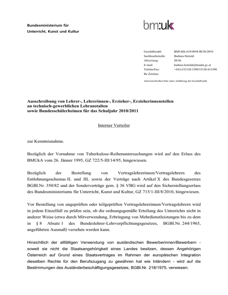 Bundesministerium für Unterricht, Kunst und Kultur Geschäftszahl: BMUKK-618/0058-III/5b/2010 SachbearbeiterIn: Barbara Hertold Abteilung: III/5b E-mail: [email protected] Telefon/Fax: +43(1)/53120-3390/53120-813390 Ihr Zeichen: Antwortschreiben bitte unter Anführung der Geschäftszahl. Ausschreibung von Lehrer-, Lehrerinnen-, Erzieher-, Erzieherinnenstellen an technisch-gewerblichen Lehranstalten sowie Bundesschülerheimen für das Schuljahr 2010/2011 Interner Verteiler zur Kenntnisnahme. Bezüglich der Vornahme von Tuberkulose-Reihenuntersuchungen wird auf den Erlass des BMUkA vom 26. Jänner 1995, GZ 722/5-III/14/95, hingewiesen. Bezüglich der Bestellung von Vertragslehrerinnen/Vertragslehrern des Entlohnungsschemas IL und IIL sowie der Verträge nach Artikel X des Bundesgesetzes BGBl.Nr. 350/82 und der Sonderverträge gem. § 36 VBG wird auf den Sicherstellungserlass des Bundesministeriums für Unterricht, Kunst und Kultur, GZ 715/1-III/8/2010, hingewiesen. Vor Bestellung von ungeprüften oder teilgeprüften Vertragslehrerinnen/Vertragslehrern wird in jedem Einzelfall zu prüfen sein, ob die ordnungsgemäße Erteilung des Unterrichts nicht in anderer Weise (etwa durch Mitverwendung, Erbringung von Mehrdienstleistungen bis zu dem in § 8 Absatz 1 des Bundeslehrer-Lehrverpflichtungsgesetzes, angeführten Ausmaß) versehen werden kann. BGBl.Nr. 244/1965, Hinsichtlich der allfälligen Verwendung von ausländischen Bewerberinnen/Bewerbern soweit sie nicht die Staatsangehörigkeit eines Landes besitzen, dessen Angehörigen Österreich auf Grund eines Staatsvertrages im Rahmen der europäischen Integration dieselben Rechte für den Berufszugang zu gewähren hat wie Inländern - wird auf die Bestimmungen des Ausländerbeschäftigungsgesetzes, BGBl.Nr. 218/1975, verwiesen. -2- Für die Bestellung von Bewerbern/Bewerberinnen als so genannte "lebende Subvention" wird auf die §§ 20 Absatz 1 und 21 Absatz 3 des Privatschulgesetzes, BGBl.Nr. 244/1962, in der geltenden Fassung, hingewiesen. Weitere Ausschreibungen können während des Schuljahres 2010/2011 von den Landesschulräten/Stadtschulrat vorgenommen werden. Beilage Wien, 19. April 2010 Für die Bundesministerin: Mag. Christian Rubin Elektronisch gefertigt -3- BMUKK-618/0058-III/5b/2010 Bundesministerium für Unterricht, Kunst und Kultur AUSSCHREIBUNG Die allgemeinen Ausschreibungsbedingungen sind der GZ 618/52-III/8/2010 zu entnehmen. An technisch-gewerblichen Lehranstalten sowie Bundesschülerheimen gelangen mit Beginn des Schuljahres 2010/2011 voraussichtlich nachstehende Lehrer- und Lehrerinnen/Erzieher- und Erzieherinnenstellen zur Besetzung. Die in Klammern angeführte Zahl ist die Wochenstundenzahl. Gelangt eine Stelle nicht nur vertretungsweise/vorübergehend, sondern auf Dauer zur Besetzung, wird auf diesen Umstand durch den Vermerk „/D“ hingewiesen. -4- Im Bereich der Zentrallehranstalten: Höhere Bundeslehr- und Versuchsanstalt für Textilindustrie und Datenverarbeitung, 1050 Wien, Spengergasse 20 Deutsch (20), Englisch (20), Geografie und Wirtschaftskunde (20), Kaufmännische/Wirtschaftliche Fächer: WirtschaftspädagogInnen, AkademikerInnen mit Industrie-/Wirtschaftspraxis u. EDV-Erfahrung (42), Islamische Religion (24), Techn. Mathematik und Darstellende Geometrie (21), Angew. Programmierung: InformatikerIn mit mehrjähriger Erfahrung in der Programmiersprache JAVA, C#, und NET Grundlagen der Softwareentwicklung (60), Netzwerktechnik: Kenntnissen sowie Erfahrung im Fachschulbereich: AkademikerInnen mit ausgezeichneten Netzwerktechnikbereich (16), Werkstättenlabor im Hardware-Laboratorium/Hardware-Praktikum/Computerpraktikum: Elektronikerin/Elektroniker oder Nachrichtentechnikerin/Nachrichtentechniker bzw. Akademikerin/Akademiker mit sehr guten PC-Hardwarekenntnissen (Konfiguration, Reparatur, Erstellung von Platinen) und Kenntnissen sowie Erfahrung in Telekommunikation (60), Multimediatechnik, Multimedia-Hardware, Multimediapublikationen und Medienwirtschaft: InformatikerInnen mit praktischer Erfahrung in Bild- u. Tonverarbeitung sowie im MultimediaHardwarebereich; Kommunikation in Netzwerken (38), Standardsoftware & Webapplikationen Techn. Informatik und Computerpraktikum: mit ausgezeichneten Kenntnissen bei Standardsoftware (41), Hardware-Laboratorium und Hardwarepraktikum, Computerpraktikum: ElektronikerIn oder NachrichtentechnikerIn bzw. AkademikerIn (Computerpraktikum) mit sehr guten PC-Hardwarekenntnissen (Konfiguration, Reparatur, Erstellung von Platinen) u. Kenntnissen sowie Erfahrung in Telekommunikation (9), Dessinatur der Weberei: TextiltechnikerIn (WeberIn), Fachwissen im Bereich der Jacquard- und Schaftweberei, Branchenübliche Softwarekenntnisse für den Bereich Gewebesimulation und Steuerung sowie mehrjährige Erfahrung im Dekorstoffbereich erforderlich. BewerberInnen mit Erfahrung im Bereich der Wartung und Instandhaltung von Textilmaschinen (Web-, Strick und Spinnmaschinen) Werden bevorzugt gereiht (30), Mediendesign (3D): 3D-Artist; Fachwissen im Bereich der 3-dimensionalen Raum-, Character- und Produktvisualisierung sowie Animation. Branchenübliche Softwarekenntnisse (Adobe Creative Suite 4 / Autodesk 3dsMax, oder/und Autodesk Maya) erforderlich. BewerberInnen mit Erfahrung in multimedialen Betrieben (Gamadesign/Film- und Animationstudios) werden bevorzugt gereiht (42), GrafikdesignerIn: Entwurfsprojekt – Darstellung und Komposition: DesignerIn mit Praxis im Bereich angewandter und Bildender Kunst. Branchenübliche Softwarekenntnisse (Adobe Creative Suite 3) erforderlich. BewerberInnen mit Textildesign-, Organisations- und Wettbewerbserfahrung werden bevorzugt gereiht (30), CutterIn/Editor – Kamerafrau/-mann: Technologie der Medien – Mediendesign – Digitale Bildbearbeitung – Entwurf (Audiovisuelles -5Mediendesign): Filmschaffende mit Praxis im Bereich angewandter und bildender Kunst Branchenübliche Softwarekenntnisse insbesondere Postproduction (Adobe Creative Suite 4, Premiere, After Ef