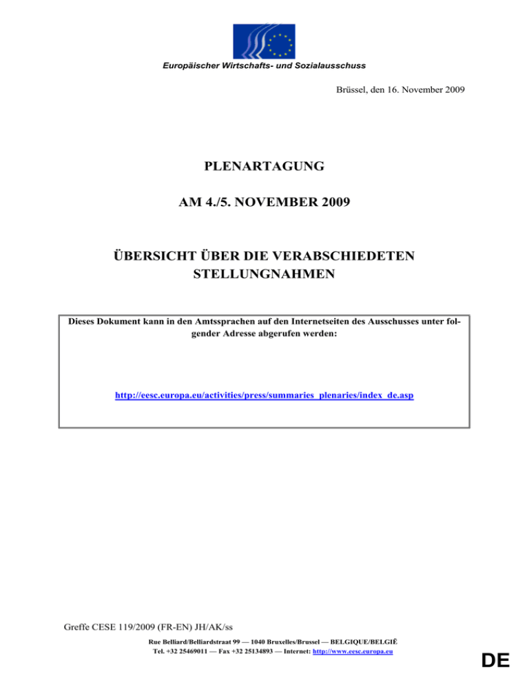 Europäischer Wirtschafts- und Sozialausschuss Brüssel, den 16. November 2009 PLENARTAGUNG AM 4./5. NOVEMBER 2009 ÜBERSICHT ÜBER DIE VERABSCHIEDETEN STELLUNGNAHMEN Dieses Dokument kann in den Amtssprachen auf den Internetseiten des Ausschusses unter folgender Adresse abgerufen werden: http://eesc.europa.eu/activities/press/summaries_plenaries/index_de.asp Greffe CESE 119/2009 (FR-EN) JH/AK/ss Rue Belliard/Belliardstraat 99 — 1040 Bruxelles/Brussel — BELGIQUE/BELGIË Tel. +32 25469011 — Fax +32 25134893 — Internet: http://www.eesc.europa.eu DE -1- Inhaltsverzeichnis: 1. ENTSCHLIESSUNG .................................................................................................................... 2 2. LISSABON-STRATEGIE ............................................................................................................ 4 3. UMWELT UND KLIMAWANDEL ........................................................................................... 7 4. VERKEHR UND ENERGIE ..................................................................................................... 12 5. SOZIALER ZUSAMMENHALT .............................................................................................. 14 6. RECHT / FREIHEIT / SICHERHEIT ..................................................................................... 15 7. BILDUNG UND BERUFSBILDUNG ....................................................................................... 17 8. INTEGRATION UND UNIONSBÜRGERSCHAFT .............................................................. 18 9. GESUNDHEIT UND VERBRAUCHERSCHUTZ .................................................................. 20 10. NACHHALTIGE ERNÄHRUNG ............................................................................................. 22 11. MEERESPOLITIK..................................................................................................................... 23 12. REGIONALPOLITIK ................................................................................................................ 24 13. FINANZWIRTSCHAFT ............................................................................................................ 26 14. BINNENMARKT ........................................................................................................................ 27 Greffe CESE 119/2009 (FR-EN) JH/AK/ss .../... -2Im Rahmen der Plenartagung am 4./5. November 2009 nahm der Präsident des Europäischen Parlaments, Jerzy BUZEK, an der Sitzung am Mittwoch teil. In dieser Sitzung wurde der EWSA-Preis für die organisierte Zivilgesellschaft 2009 verliehen, und es fand eine Debatte über die Lissabon-Strategie und das Wirtschaftswachstum statt. Die Plenartagung wurde am Donnerstag fortgesetzt. In dieser Sitzung wurde eine Entschließung zum Klimawandel verabschiedet, und es fand eine Debatte über die Kopenhagener Klimakonferenz statt. An dieser Debatte nahmen Jöran HÄGGLUND, Staatssekretär bei der schwedischen Ministerin für Unternehmen und Energie, Jo LEINEN, Mitglied des Europäischen Parlaments und Vorsitzender des Ausschusses für Umweltfragen, Volksgesundheit und Lebensmittelsicherheit, und Olivier DELEUZE, Leiter des Verbindungsbüros des Umweltprogramms der Vereinten Nationen (UNEP) bei der Europäischen Union, teil. Nachstehend finden Sie den Wortlaut der Entschließung sowie eine Zusammenfassung der vom Ausschuss verabschiedeten Stellungnahmen: 1. ENTSCHLIESSUNG Referenz: CESE 1676/2009 fin Die Entschließung zum Klimawandel wurde mit folgendem Wortlaut verabschiedet: "Der Europäische Wirtschafts- und Sozialausschuss billigt als institutioneller Vertreter der organisierten Zivilgesellschaft auf europäischer Ebene die folgende Botschaft an die Regierungen, politischen Entscheidungsträger, Unterhändler und weiteren, an den Klimaschutzverhandlungen in Kopenhagen sowie an der Entwicklung und Umsetzung von Klimaschutzmaßnahmen beteiligten Parteien: 'Der Klimawandel hat bereits in vielen Teilen der Welt schädliche und möglicherweise unumkehrbare Auswirkungen verursacht. Diese Probleme werden in den kommenden Jahren im Zweifelsfalle nur schwerwiegender, wenn sich die Treibhausgase auch weiterhin im derzeitigen Tempo in der Atmosphäre anreichern. Aus den wissenschaftlichen Untersuchungen des Weltklimarates und weiteren einschlägigen Quellen geht sehr deutlich hervor, dass die Industrieländer ihre Treibhausgasemissionen bis 2050 um über 80% verringern müssen, wenn der Temperaturanstieg in einem sicheren Bereich gehalten werden soll. Um der Welt eine realistische Möglichkeit für eine derartige Senkung des Treibhausgasausstoßes zu eröffnen, muss bis 2020 u.a. auch durch erhebliche Anstrengungen sowohl der Schwellen- als auch der Entwicklungsländer eine Verringerung um 25-40% erzielt worden sein. Die anstehende Konferenz in Kopenhagen ist entscheidend. Wird sie zu einem erfolgreichen Abschluss gebracht, könnte dies eine weltweite Wende hin zu Emissionsverringerungen in den kommenden Jahren und die Stabilisierung des Temperaturanstiegs auf einem zu bewältigenden Niveau herbeiführen. Ihr Scheitern könnte die Welt auf einen zunehmend gefahrvollen Weg in Richtung eines beschleunigten Temperaturanstiegs und der hierdurch verursachten menschlichen und ökologischen Katastrophen führen. Greffe CESE 119/2009 (FR-EN) JH/AK/ss .../... -3- 1. Zu diesem entscheidenden Zeitpunkt ruft der Europäische Wirtschafts- und Sozialausschuss die Regierungen, politischen Entscheidungsträger und Unterhändler auf, ihre Bemühungen um eine universelle und verpflichtende Einigung zu intensivieren, um alle Staaten und ihre Bevölkerungen in einem gemeinsamen Bemühen um die Senkung des Emissionsniveaus in den kommenden Jahren zu vereinen und so unsere Umwelt, in der wir und künftige Generationen leben wollen, zu bewahren. 2. Die Europäische Union hat angeboten, sich zu einer Verringerung um 30% bis 2020 zu verpflichten, wenn andere Staaten ähnliche Anst