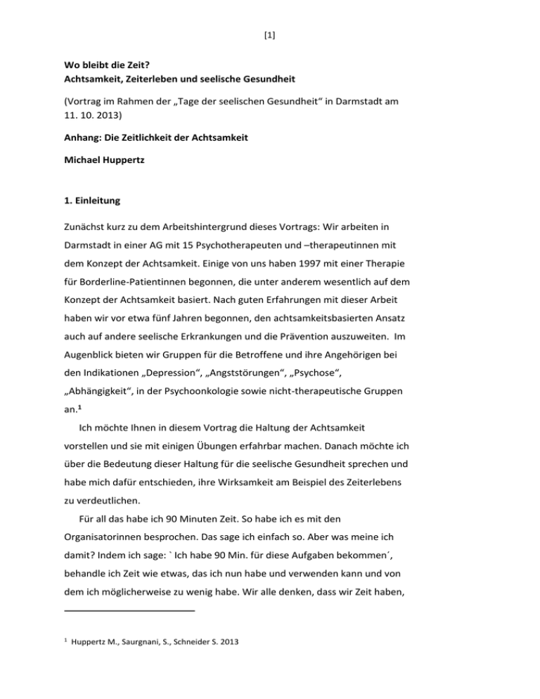 [1] Wo bleibt die Zeit? Achtsamkeit, Zeiterleben und seelische Gesundheit (Vortrag im Rahmen der „Tage der seelischen Gesundheit“ in Darmstadt am 11. 10. 2013) Anhang: Die Zeitlichkeit der Achtsamkeit Michael Huppertz 1. Einleitung Zunächst kurz zu dem Arbeitshintergrund dieses Vortrags: Wir arbeiten in Darmstadt in einer AG mit 15 Psychotherapeuten und –therapeutinnen mit dem Konzept der Achtsamkeit. Einige von uns haben 1997 mit einer Therapie für Borderline-Patientinnen begonnen, die unter anderem wesentlich auf dem Konzept der Achtsamkeit basiert. Nach guten Erfahrungen mit dieser Arbeit haben wir vor etwa fünf Jahren begonnen, den achtsamkeitsbasierten Ansatz auch auf andere seelische Erkrankungen und die Prävention auszuweiten. Im Augenblick bieten wir Gruppen für die Betroffene und ihre Angehörigen bei den Indikationen „Depression“, „Angststörungen“, „Psychose“, „Abhängigkeit“, in der Psychoonkologie sowie nicht-therapeutische Gruppen an.1 Ich möchte Ihnen in diesem Vortrag die Haltung der Achtsamkeit vorstellen und sie mit einigen Übungen erfahrbar machen. Danach möchte ich über die Bedeutung dieser Haltung für die seelische Gesundheit sprechen und habe mich dafür entschieden, ihre Wirksamkeit am Beispiel des Zeiterlebens zu verdeutlichen. Für all das habe ich 90 Minuten Zeit. So habe ich es mit den Organisatorinnen besprochen. Das sage ich einfach so. Aber was meine ich damit? Indem ich sage: ` Ich habe 90 Min. für diese Aufgaben bekommen´, behandle ich Zeit wie etwas, das ich nun habe und verwenden kann und von dem ich möglicherweise zu wenig habe. Wir alle denken, dass wir Zeit haben, 1 Huppertz M., Saurgnani, S., Schneider S. 2013 [2] nutzen, verlieren oder sparen können, wir behandeln sie wie ein Objekt oder genauer wie ein Allzweckinstrument. Ich kann meine Zeit für alles Mögliche verwenden und einsetzen. Und wenn es stimmt, dass wir alle in einer Gesellschaft leben, in der wir uns zwischen vielen Pflichten und Möglichkeiten entscheiden müssen, so ist es auch verständlich, dass wir oft, vielleicht immer, zu wenig Zeit haben. Diese Art von Zeitverständnis ist nicht davon zu trennen, dass wir etwas schaffen, erledigen, erleben, oder genießen wollen. Die objektive, für alle gültige, detailliert messbare Zeit, die sich erst im 19. Jahrhundert allgemein und recht mühsam durchgesetzt hat, ermöglicht es, zielgerichtete Aktivitäten zu koordinieren.2 Deswegen nimmt die Klage über die allgemeine Hektik und die Beschleunigung aller Lebensprozesse mit der standardisierten Vernutzung der Zeit zu. Die Nervosität war schon die Modeerkrankung des 19. Jahrhunderts3. Ich werde heute nicht in die Klage über die allgegenwärtige Beschleunigung einstimmen. Nicht weil sie unberechtigt wäre, sondern weil sie allzu vertraut ist und eine etwas oberflächliche Sicht der Dinge nahelegt. Unter anderem führt sie zu dem Gedanken, Verlangsamung wäre eine ausreichende Lösung. Aber wie weit müsste sie gehen? Wie langsam müssten wir werden? Manchen Menschen vergeht die Zeit auch jetzt schon zu langsam. Und manche haben sich schon so an ein bestimmtes Tempo gewöhnt, dass sie in Schwierigkeiten kommen, wenn es sich vermindert und sie z. B. über freie Zeit verfügen. Mir geht es im Folgenden um ein grundsätzlich anderes Verständnis von Zeit. Es ergibt sich aus dem Konzept der Achtsamkeit und daher möchte ich Ihnen zunächst dieses Konzept vorstellen. 2 3 S. Anm. 18 Z. B.: „F. W. Dock, Leiter einer Kuranstalt bei St. Gallen, schreibt 1887, die Gründe dafür, dass die Menschen seiner Zeit immer kränker würden, seien `viel zu hoch hinaufgeschraubte Lebensverhältnisse, zu wenig Einfachheit, eine übertriebene Genusssucht, ein furchtbares, Gehirn, Nerven und Körper ruinierendes `Rennen und Jagen´´“ (Sarasin 2001, S. 224). Zur Beschleunigung als gesellschaftlichem Prozess s. Rosa H. 2005. [3] 2. Achtsamkeit Achtsamkeit ist eine Haltung gegenüber der Umwelt, anderen Menschen und sich selbst. Achtsam sein heißt wach sein und offen für neue Erfahrungen ohne eine andere Absicht zu verfolgen als eben die, achtsam zu sein. Eine solche Haltung ist ungewöhnlich und ungewohnt. Wer sie einnimmt, will mit ihr möglicherweise viel, in ihr aber nichts erreichen, keine Entspannung, kein Wohlbefinden, keine Selbsterkenntnis, keine Weisheit. Sie sind wach, haben Energie und könnten etwas unternehmen, wenigstens planen oder nachdenken. Aber Sie entscheiden sich, einfach nur da zu sein, mit der Umwelt und sich selbst in Kontakt, sich zu öffnen für das, was gerade geschieht und es auf sich wirken lassen oder das Geschehen spielerischexperimentell erkunden. Starre Erwartungen, Vorurteile und rasche Bewertungen stehen dieser Offenheit entgegen. Achtsamkeit erfordert also eine gewisse Skepsis, auch den eigenen Konzepten gegenüber, mit denen wir die Wirklichkeit zu fassen versuchen. Achtsamkeit ist eine Haltung, d. h. es kommt nicht so sehr darauf an, dass Sie etwas Anderes machen, sondern dass Sie etwas anders machen4. Es geht also um das „wie“, die Haltung, mit der Sie etwas tun oder wahrnehmen. Sie können Achtsamkeit immer üben, wenn Sie nicht gerade ein Problem lösen müssen, also dann, wenn Sie gerade ein Pause machen können, aber auch, wenn Sie etwas tun, was Ihnen leicht von der Hand oder vom Fuß geht, also wenn Sie morgens aufstehen, duschen, frühstücken, Hausarbeit machen oder einen Weg zurücklegen. Sie können aber auch bestimmte Übungen machen, die Ihnen die Haltung der Achtsamkeit verdeutlichen und vereinfachen, sozusagen verdichten. Wenn Sie wenig Zeit haben oder es Ihnen schwerfällt, beginnen Sie mit einer oder wenigen Minuten. Lassen Sie uns einmal eine solche Übung praktizieren. [………] 4 Huppertz 2012. [4] 3. Und-Haltungen Wir arbeiten sehr viel mit dem Wort „und“. Wenn wir z.B. vorschlagen, sich achtsam auf einen Fokus zu beziehen (Sitzen, Gehen, Musik, Objekte usw.), geschieht es unvermeidlich, dass den Teilnehme