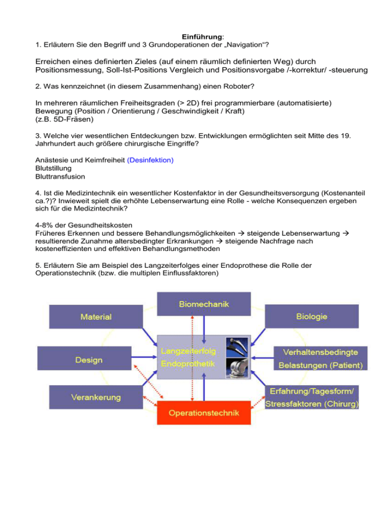Einführung: 1. Erläutern Sie den Begriff und 3 Grundoperationen der „Navigation“? Erreichen eines definierten Zieles (auf einem räumlich definierten Weg) durch Positionsmessung, Soll-Ist-Positions Vergleich und Positionsvorgabe /-korrektur/ -steuerung 2. Was kennzeichnet (in diesem Zusammenhang) einen Roboter? In mehreren räumlichen Freiheitsgraden (> 2D) frei programmierbare (automatisierte) Bewegung (Position / Orientierung / Geschwindigkeit / Kraft) (z.B. 5D-Fräsen) 3. Welche vier wesentlichen Entdeckungen bzw. Entwicklungen ermöglichten seit Mitte des 19. Jahrhundert auch größere chirurgische Eingriffe? Anästesie und Keimfreiheit (Desinfektion) Blutstillung Bluttransfusion 4. Ist die Medizintechnik ein wesentlicher Kostenfaktor in der Gesundheitsversorgung (Kostenanteil ca.?)? Inwieweit spielt die erhöhte Lebenserwartung eine Rolle - welche Konsequenzen ergeben sich für die Medizintechnik? 4-8% der Gesundheitskosten Früheres Erkennen und bessere Behandlungsmöglichkeiten steigende Lebenserwartung resultierende Zunahme altersbedingter Erkrankungen steigende Nachfrage nach kosteneffizienten und effektiven Behandlungsmethoden 5. Erläutern Sie am Beispiel des Langzeiterfolges einer Endoprothese die Rolle der Operationstechnik (bzw. die multiplen Einflussfaktoren) 6. Nennen Sie Kriterien für eine schonende und kosteneffiziente Therapie (aus individueller und/oder volkswirtschaftlicher Sicht) therapeutische Effektivität (individuell optimaler Erfolg der Therapie) Rezidiv- bzw. Revisionsrate Narkose- und Operationszeit Blutverlust, Infektionen und Komplikationen Hospitalisierungs- und Rehabilitationszeiten Genesungszeit und Rückkehr in soziale Umgebung Einschränkungen der Lebensqualität (Schmerzen, Bewegung &Mobilität, kosmetisches Ergebnis,...) (geringe Kosten) Therapieerfolg > Rezidiv- bzw. Revisionsraten Vermeidung von Komplikationen und Folgeerkrankungen kurze OP-Zeiten (Material, Infrastruktur, Personal) kurze Hospitalisierungs- und Pflegezeiten kurze Arbeitsausfallzeiten geringe Folgekosten (Rehabilitationsmaßnahmen, Pflege) minimale Kosten von Diagnose & Therapie(technik) (Investition, Anwendung, Wartung, Personal, Ausbildung) stehen paar Sachen doppelt drin ;) würd ich anderes ordnen, dann vllt leichter zu merken 7. Was versteht man unter der sog. „Minimal-Invasiven Chirurgie“? Nennen Sie Vorteile und Nachteile Operative Eingriffe mit kleinstem Trauma (mit kleinster Verletzung von Haut und Weichteilen) Vorteile o Geringes Zugangstrauma o Kürzerer Krankenhausaufenthalt (s.u.) o Schnellere Rehabilitation o Kosmetische Vorteile geringeres Infektionsrisiko Nachteile o Reduzierte Sicht, Haptik, o Einschränkung der Bewegungsfreiheit o Komplexe Hand-Auge-Koordination (HAK) o Langes Training erforderlich >>> erhöhtes Risiko von Komplikationen vs. potentielle Vorteile 8. Welche Rolle spielt die Individualisierung in der Therapie(-planung). Setzen Sie sich kritisch mit der Frage der Finanzierbarkeit vs. Individualisierung auseinander – (pro & contra). First see, then cut! Schonende/minimal-invasive Therapien Erfassung der individuellen Situation Individualisierte Therapieplanung „optimal-invasive“ Operation (optimales Ergebnis + minimales Trauma) schnelle Reaktion auf abweichungen / komplikationen möglich 9. Welche Rolle spielt die CUC bei der Individualisierung der Therapie? Perzeption (Bildgebung, Sensorik) Fusion/Planung/Simulation (Segmentierung, 3DRekonstruktion, Fusion (Bild- u. Implantatdaten) Umsetzung (Navigation, Robotik) 10. Welche Prozessschritte können im Rahmen der Computer Integrierten Chirurgie grundsätzlich unterstützt werden und zur Individualisierung beitragen? Was versteht man in diesem Zusammenhang unter CA-QM? CA-Bildgebung CA-Analyse CA-Planung CA-Referenzierung CA-AusführungCA-QMCA-Bildgebung QM - Qualitätsmanagement Arbeitsplatz Operationssaal 1. Warum ist eine ergonomische Systemgestaltung (d.h. die Berücksichtigung des Menschen als Systemkomponente) im Zusammenhang mit der Entwicklung von (medizinischen) MenschMaschine-Systemen von Bedeutung? Menschliches Versagen, keine Experten -> Einfachheit, eigene Sicherheit und die des Patienten, Orientierung beträgt 10-12% der Gesamt-OP-Dauer Berücksichtigung des Menschen als Systemkomponente (Physiologie, Psychologie, Verhaltensstruktur, Informationsverarbeitung, ...) o auszuübende Funktion im System - mögliche vs. Erwartete Leistungscharakteristik o viele Parameter nicht quantitativ beschreibbar (vs. technische Systeme) o inter- und intraindividuelle Variabilität; starke Abhängigkeit von Randbedingungen 2. Nennen Sie typische Ursachen für „Menschliches Versagen“ in der Medizin (-technik) Bogner, 1994: mangelhafte Gestaltung von Arbeitsmittel und -umgebung fehlerhafte Information, fehlerhafte mentale Verarbeitung korrekter Information, fehlerhafte psychobzw. senso-motorische Umsetzung situationsbedingte Belastungen (z.B. Zeitdruck), Ermüdung unangemessene Taktiken und Reaktionen aufgrund umgebungsbedingter Belastungen (Stress) 3. Nennen Sie beispielhaft Komponenten, Funktionalitäten oder Prozesse im OP die für eine verbesserte Strukturierung im Operationssaal in Betracht zu ziehen sind. Gibt es heute integrierte OP-Systeme die diese Strukturierung umsetzen? Welche Einschränkungen bestehen (Modularität und Flexibilität)? Keine Frage dazu, aber evtl wichtig? 4. Welche wesentliche Funktion soll insbesondere von Navigationssystemen unterstützt werden? Nennen Sie Anhaltswerte für Zeitanteil an der Gesamt- Operationsdauer am Beispiel der Knie- und Hüftendoprothesenimplantation. 10-12% 5. Warum ist bei der Patientenlagerung besondere Vorsicht geboten (d.h. insbesondere für neue Operationsverfahren zu beachten). Nennen Sie Gefahren für den Patienten und Gegenmaßnahmen. Patient narkotisiert und muskelrelaxiert Schwächerer arterieller Blutdruck mangelhafte Ernährung des Gewebes unter Druck (Körpergewicht, Fixierungen, punktuelle Belastung, harte Polster,…) Dekubi