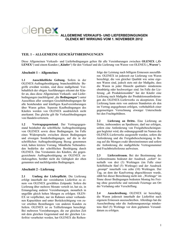 ALLGEMEINE VERKAUFS- UND LIEFERBEDINGUNGEN OLENEX MIT WIRKUNG VOM 1. NOVEMBER 2012 TEIL 1 – ALLGEMEINE GESCHÄFTSBEDINGUNGEN Diese Allgemeinen Verkaufs- und Lieferbedingungen gelten für alle Vereinbarungen zwischen OLENEX („OLENEX“) und einem Kunden („Käufer“) für den Verkauf und die Lieferung von Waren von OLENEX („Waren“). Abschnitt 1 – Allgemeines 1.1 Ausschließliche Geltung. Sofern in der OLENEX-Auftragsbestätigung branchenübliche Begriffe erwähnt werden, sind diese maßgebend. Vorbehaltlich der obigen Ausführungen erkennt der Käufer an, dass diese Allgemeinen Verkaufs- und Lieferbedingungen (nachfolgend „die Bedingungen“) unter Ausschluss aller sonstigen Geschäftsbedingungen für alle bestehenden und künftigen Kaufvereinbarungen über Waren gelten. Separate Kaufbedingungen des Käufers werden von OLENEX ausdrücklich nicht anerkannt. Das gleiche gilt für Verkaufsbedingungen von Handelsvertretern. 1.2 Vertragsgegenstand. Der Vertragsgegenstand beinhaltet die schriftliche Auftragsbestätigung von OLENEX sowie diese Bedingungen. Im Falle eines Widerspruchs zwischen diesen Bedingungen und etwaigen Sonderbedingungen, auf die in der schriftlichen Auftragsbestätigung Bezug genommen wird, haben letztere Vorrang. Mündliche Nebenabreden bedürfen der schriftlichen Bestätigung durch OLENEX. Das Versäumnis des Käufers, die gegengezeichnete Auftragsbestätigung an OLENEX zurückzugeben, berührt nicht die Gültigkeit der oben genannten und nachfolgenden Bedingungen. Abschnitt 2 - Lieferung 2.1 Umfang der Lieferpflicht. Die Lieferung erfolgt innerhalb der vereinbarten Lieferfrist zu einem von OLENEX gewählten Zeitpunkt. Sofern die Lieferung über mehrere Monate verteilt ist, hat sie, in Ermangelung anderer Vereinbarungen, monatlich in ungefähr gleich hohen Mengen zu erfolgen. OLENEX ist verpflichtet, nur im Rahmen seiner vorhandenen Kapazitäten und unter Berücksichtigung von zuvor erteilten Bestellungen von anderen Kunden zu liefern. OLENEX ist zu Teillieferungen berechtigt. Bei mehreren Vereinbarungen, die zur gleichen Zeit mit dem gleichen Gegenstand und der gleichen Lieferfrist verarbeitet werden, hat OLENEX die Reihen- folge der Leistung nach billigem Ermessen auszuführen. OLENEX ist jederzeit zur Lieferung von Waren berechtigt, die von gleicher Qualität wie seine eigenen Waren sind, jedoch stets mit der Maßgabe, dass die Waren in jeder Hinsicht qualitativ mindestens ebenbürtig oder hochwertiger sind. Im Falle der Lieferung „ab Produktionsstätte“ hat der Käufer eine Lieferung nach Maßgabe der Produktionsanforderungen des OLENEX-Lieferwerks zu akzeptieren. Eine Lieferung kann stets von anderen Standorten als den im Vertrag angegebenen erfolgen, vorbehaltlich einer gegenseitigen Verrechnung etwaiger Unterschiede bei den Frachtgebühren. 2.2 Lieferung an Dritte. Eine Lieferung an Dritte, insbesondere an Spediteure, darf nur erfolgen, sofern eine Anforderung von Freigabebescheinigungen begleitet wird, die ordnungsgemäß im Namen des OLENEX-Lieferwerks ausgestellt wurden, sofern die Anforderung und die Freigabebescheinigung in Bezug auf die Mengen exakt übereinstimmen und sofern die Anforderung die maßgebliche Vertragsnummer und Frachtbriefreferenz aufweisen. 2.3 Lieferzeitraum. Bei der Bestimmung des Lieferzeitraums bedeutet der Ausdruck „sofort“ innerhalb von drei (3) Werktagen (im Falle einer Schiffsfracht fünf (5) Werktage) und der Ausdruck „prompt“ innerhalb von zehn (10) Werktagen. Der Tag, an dem der Kaufvertrag abgeschlossen wurde, zählt bei dieser Berechnung nicht mit. „Werktage“ im Sinne dieser Bedingungen bedeuten Montag bis Freitag ohne gesetzliche und nationale Feiertage am Ort der Verladung oder Verschiffung. 2.4 Ausschreibung. OLENEX ist berechtigt, die Waren jederzeit innerhalb der Lieferfrist nach eigenem Ermessen auszuschreiben. Allerdings hat die Ausschreibung oder die Andienungsanzeige mindestens fünf (5) Werktage vor dem geplanten Versanddatum zu erfolgen. 1 2.5 Versandauftrag. Der Käufer hat einen Versandauftrag mindestens fünf (5) Werktage vor dem vorgesehenen Liefertermin zu erteilen. Erteilt der Käufer nicht innerhalb von fünf (5) Werktagen (im Falle einer sofortigen Lieferung innerhalb von zwei (2) Werktagen) ausführbare Versandanweisungen, ist OLENEX nach Ablauf einer in Ziffer 2.6 festgelegten Nachfrist berechtigt, (i) eine effektive Vertragserfüllung und Schadensersatz wegen Verzögerung der Leistung zu fordern, (ii) vom Vertrag ganz oder bezüglich des noch nicht erfüllten Teils teilweise zurückzutreten und jederzeit Schadenersatz zu verlangen oder (iii) statt der Leistung Schadensersatz zu verlangen oder eine ersatzweise Zahlung gegen Vorlage seines eigenen Lieferscheins oder eines vom Lagerleiter ausgestellten Lieferscheins zu fordern. Stellt der Käufer bis zum angegebenen Termin keinen ausführbaren Versandauftrag aus, so werden die für den Käufer bestimmten Waren auf Kosten und Gefahr des Käufers auf dem Firmengelände von OLENEX oder in den Räumlichkeiten eines Dritten verwahrt. Darüber hinaus ist OLENEX berechtigt, die Lieferung um die gleiche Anzahl von Werktagen zurückzustellen, für die der Käufer im Rückstand war, zuzüglich einer angemessenen Frist, um geeignete Vorkehrungen zu treffen. OLENEX ist auch berechtigt, die obigen Rechte in Bezug auf Bestellungen auf Abruf geltend zu machen, wenn der Käufer bis zum Ende der Lieferfrist keinen ausführbaren Versandauftrag erteilt. 2.6 Nachfrist. Die Nachfristen gemäß Ziffer 2.5 betragen (i) mindestens zwei (2) Werktage für Verkäufe mit sofortiger Lieferung, (ii) mindestens drei (3) Werktage für Verkäufe mit einer längeren Lieferzeit als „sofort“ bis einschließlich „prompt“, (iii) mindestens drei (3) Tage für Nahrungsmittelverkäufe mit einer längeren Lieferzeit als „prompt“ und mindestens fünf (5) Werktage für alle anderen Verkäufe mit einer längeren Lieferfrist als „prompt“. 2.7 Bemessung des Scha