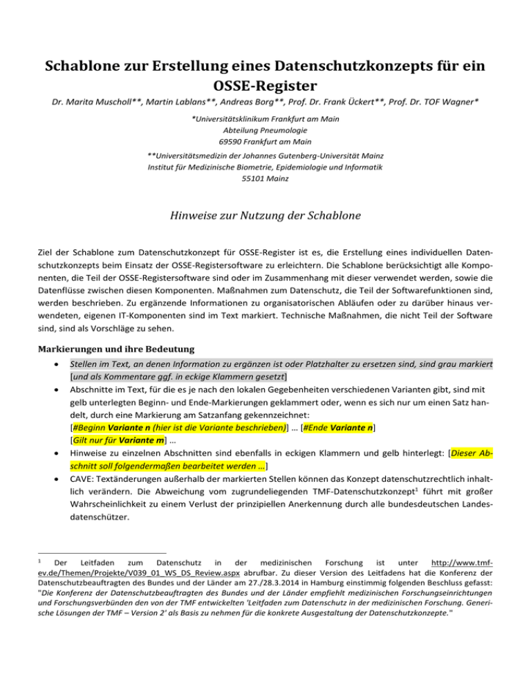 Schablone zur Erstellung eines Datenschutzkonzepts für ein OSSE-Register Dr. Marita Muscholl**, Martin Lablans**, Andreas Borg**, Prof. Dr. Frank Ückert**, Prof. Dr. TOF Wagner* *Universitätsklinikum Frankfurt am Main Abteilung Pneumologie 69590 Frankfurt am Main **Universitätsmedizin der Johannes Gutenberg-Universität Mainz Institut für Medizinische Biometrie, Epidemiologie und Informatik 55101 Mainz Hinweise zur Nutzung der Schablone Ziel der Schablone zum Datenschutzkonzept für OSSE-Register ist es, die Erstellung eines individuellen Datenschutzkonzepts beim Einsatz der OSSE-Registersoftware zu erleichtern. Die Schablone berücksichtigt alle Komponenten, die Teil der OSSE-Registersoftware sind oder im Zusammenhang mit dieser verwendet werden, sowie die Datenflüsse zwischen diesen Komponenten. Maßnahmen zum Datenschutz, die Teil der Softwarefunktionen sind, werden beschrieben. Zu ergänzende Informationen zu organisatorischen Abläufen oder zu darüber hinaus verwendeten, eigenen IT-Komponenten sind im Text markiert. Technische Maßnahmen, die nicht Teil der Software sind, sind als Vorschläge zu sehen. Markierungen und ihre Bedeutung 1 Stellen im Text, an denen Information zu ergänzen ist oder Platzhalter zu ersetzen sind, sind grau markiert [und als Kommentare ggf. in eckige Klammern gesetzt] Abschnitte im Text, für die es je nach den lokalen Gegebenheiten verschiedenen Varianten gibt, sind mit gelb unterlegten Beginn- und Ende-Markierungen geklammert oder, wenn es sich nur um einen Satz handelt, durch eine Markierung am Satzanfang gekennzeichnet: [#Beginn Variante n (hier ist die Variante beschrieben)] … [#Ende Variante n] [Gilt nur für Variante m] … Hinweise zu einzelnen Abschnitten sind ebenfalls in eckigen Klammern und gelb hinterlegt: [Dieser Abschnitt soll folgendermaßen bearbeitet werden …] CAVE: Textänderungen außerhalb der markierten Stellen können das Konzept datenschutzrechtlich inhaltlich verändern. Die Abweichung vom zugrundeliegenden TMF-Datenschutzkonzept1 führt mit großer Wahrscheinlichkeit zu einem Verlust der prinzipiellen Anerkennung durch alle bundesdeutschen Landesdatenschützer. Der Leitfaden zum Datenschutz in der medizinischen Forschung ist unter http://www.tmfev.de/Themen/Projekte/V039_01_WS_DS_Review.aspx abrufbar. Zu dieser Version des Leitfadens hat die Konferenz der Datenschutzbeauftragten des Bundes und der Länder am 27./28.3.2014 in Hamburg einstimmig folgenden Beschluss gefasst: "Die Konferenz der Datenschutzbeauftragten des Bundes und der Länder empfiehlt medizinischen Forschungseinrichtungen und Forschungsverbünden den von der TMF entwickelten 'Leitfaden zum Datenschutz in der medizinischen Forschung. Generische Lösungen der TMF – Version 2' als Basis zu nehmen für die konkrete Ausgestaltung der Datenschutzkonzepte." Schablone zum Datenschutzkonzept für OSSE-Register Vorgehen bei der Bearbeitung 1. Ersetzen Sie in der Schablone den Platzhalter „OSSE-Register für „Seltene Erkrankung X““ durch den Namen des geplanten Registers. 2. Beantworten Sie sich folgende Fragen, die für die Auswahl der Varianten oder zu ergänzenden Informationen notwendig sind: a) Wer ist der Träger (üblicherweise also „Besitzer“) des Registers? b) Welche Institution betreibt das OSSE-Register (hat üblicherweise die notwendige zentrale Hardware unter seiner Kontrolle)? c) Welche Institutionen sind an dem Vorhaben beteiligt (erfassen Daten in das Register)? d) Welche Daten werden in das OSSE-Register erfasst (z.B. Gewicht, Geburtsdatum, Diagnose als Orphacode)? ( ergibt einen Anhang) e) Wo ist das Identitätsmanagement zur Pseudonymisierung der Patientendaten angesiedelt und wer betreibt es? (folgende Varianten sind möglich) 1. Es gibt ein Identitätsmanagement, das für alle Register für „Seltene Erkrankung X“ zentral betrieben wird (damit bei Forschungsprojekten mit anderen Registern identische Patienten in verschiedenen Registern erkannt werden können)2. 2. Für das OSSE-Register für „Seltene Erkrankung X soll ein eigenes Identitätsmanagement betrieben werden. 3. Es wird keine Komponente für das Identitätsmanagement genutzt. Das OSSE-Register wird so konfiguriert, dass es interne Patientenidentifikatoren (PID) vergibt, die ausschließlich am Behandlungsort manuell mit den identifizierenden Daten des Patienten verknüpft werden. b) Welche Rollen gibt es für das Register (z.B. „Dokumentar“, „behandelnder Arzt“)? Mit welchen Zugriffsrechten müssen diese jeweils ausgestattet sein (z.B. „Lesen von xyz“, „Schreiben von abc“)? c) Wie sieht der Ablauf der manuellen Dateneingabe aus (welche Zustände, z.B. „in Bearbeitung“, „abgeschlossen“, „validiert“) kann ein Eingabeformular haben und welche Benutzergruppen (Rollen) dürfen es bearbeiten)? d) Werden Daten aus klinischen Systemen importiert? 1. Falls ja, welche Daten aus welchen Systemen? ( ergibt einen Anhang) e) Werden Daten zu Biomaterialproben in das OSSE-Register importiert (und welche)? 1. Falls ja, □ aus einer Biomaterialbank? □ direkt von der Probenquelle? 3. Ersetzen Sie die Platzhalter und ergänzen Sie die abgefragten Informationen und Anhänge. 4. Löschen Sie überflüssige Abschnitte. 5. Lesen Sie dabei die gesamte Schablone sorgfältig durch und passen Sie die Texte hinsichtlich Ihrer spezifischen Umgebung (IT-Infrastruktur, Organisation, etc.) an. 6. Löschen Sie die Kommentare und Markierungen. 7. Aktualisieren Sie das Inhaltsverzeichnis. 2 Für eine optimale Nutzung der dezentralen Suche sollten alle Teilnehmer (OSSE-Register und OSSE-Brückenköpfe) ein gemeinsames Identitätsmanagement nutzen, das zu den unabhängigen Pseudonymen der verschiedenen Teilnehmer einheitliche Exportpseudonyme erzeugen kann. Gerade im Bereich der Seltenen Erkrankungen ist es entscheidend, identische Patienten in verschiedenen Registern nicht mehrfach zu zählen. Seite 2 von 25 Schablone zum Datenschutzkonzept für OSSE-Register OSSE-Register