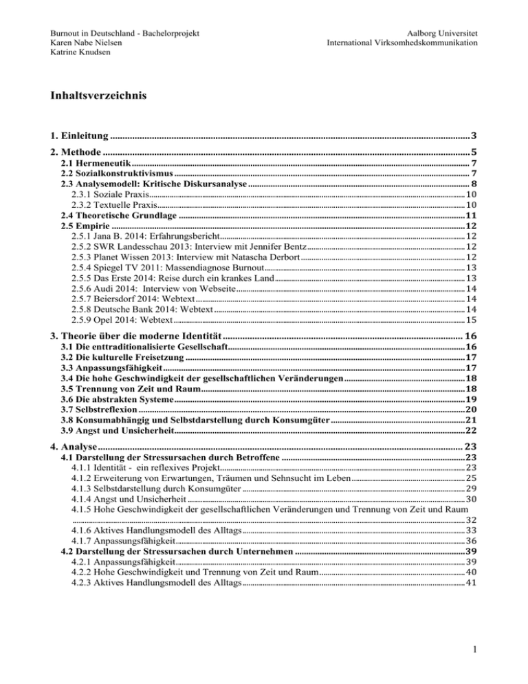 Burnout in Deutschland - Bachelorprojekt Karen Nabe Nielsen Katrine Knudsen Aalborg Universitet International Virksomhedskommunikation Inhaltsverzeichnis 1. Einleitung ................................................................................................................................................... 3 2. Methode ...................................................................................................................................................... 5 2.1 Hermeneutik ....................................................................................................................................................... 7 2.2 Sozialkonstruktivismus .................................................................................................................................... 7 2.3 Analysemodell: Kritische Diskursanalyse ................................................................................................... 8 2.3.1 Soziale Praxis ............................................................................................................................................................ 10 2.3.2 Textuelle Praxis ........................................................................................................................................................ 10 2.4 Theoretische Grundlage ................................................................................................................................ 11 2.5 Empirie .............................................................................................................................................................. 12 2.5.1 Jana B. 2014: Erfahrungsbericht ......................................................................................................................... 12 2.5.2 SWR Landesschau 2013: Interview mit Jennifer Bentz .............................................................................. 12 2.5.3 Planet Wissen 2013: Interview mit Natascha Derbort ................................................................................. 12 2.5.4 Spiegel TV 2011: Massendiagnose Burnout ................................................................................................... 13 2.5.5 Das Erste 2014: Reise durch ein krankes Land .............................................................................................. 13 2.5.6 Audi 2014: Interview von Webseite ................................................................................................................. 14 2.5.7 Beiersdorf 2014: Webtext ..................................................................................................................................... 14 2.5.8 Deutsche Bank 2014: Webtext ............................................................................................................................ 14 2.5.9 Opel 2014: Webtext ................................................................................................................................................ 15 3. Theorie über die moderne Identität .................................................................................................. 16 3.1 Die enttraditionalisierte Gesellschaft.......................................................................................................... 16 3.2 Die kulturelle Freisetzung ............................................................................................................................. 17 3.3 Anpassungsfähigkeit ....................................................................................................................................... 17 3.4 Die hohe Geschwindigkeit der gesellschaftlichen Veränderungen ...................................................... 18 3.5 Trennung von Zeit und Raum ...................................................................................................................... 18 3.6 Die abstrakten Systeme .................................................................................................................................. 19 3.7 Selbstreflexion .................................................................................................................................................. 20 3.8 Konsumabhängig und Selbstdarstellung durch Konsumgüter ............................................................ 21 3.9 Angst und Unsicherheit.................................................................................................................................. 22 4. Analyse ..................................................................................................................................................... 23 4.1 Darstellung der Stressursachen durch Betroffene .................................................................................. 23 4.1.1 Identität - ein reflexives Projekt ......................................................................................................................... 23 4.1.2 Erweiterung von Erwartungen, Träumen und Sehnsucht im Leben ........................................................ 25 4.1.3 Selbstdarstellung durch Konsumgüter .............................................................................................................. 29 4.1.4 Angst und Unsicherheit ......................................................................................................................................... 30 4.1.5 Hohe Geschwindigkeit der gesellschaftlichen Veränderungen und Trennung von Zeit und Raum .................................................................................................................................................................................................. 32 4.1.6 Aktives Handlungsmodell des Alltags .............................................................................................................. 33 4.1.7 Anpassungsfähigkeit .................................